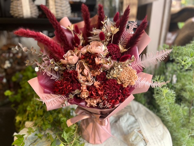 花瓶不要でそのまま飾れる プリザーブドフラワー花束|スタンディングブーケ ワインレッド Mサイズ|誕生日 退職 卒業 還暦祝い 送別ギフト