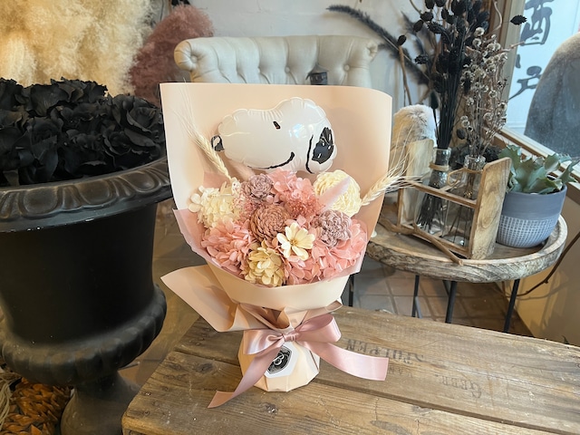 花瓶不要でそのまま飾れる スヌーピー プリザーブドフラワー花束|バルーン付 スタンディングブーケノーブルピンク|卒業祝い 退職 卒園 誕生日ギフト