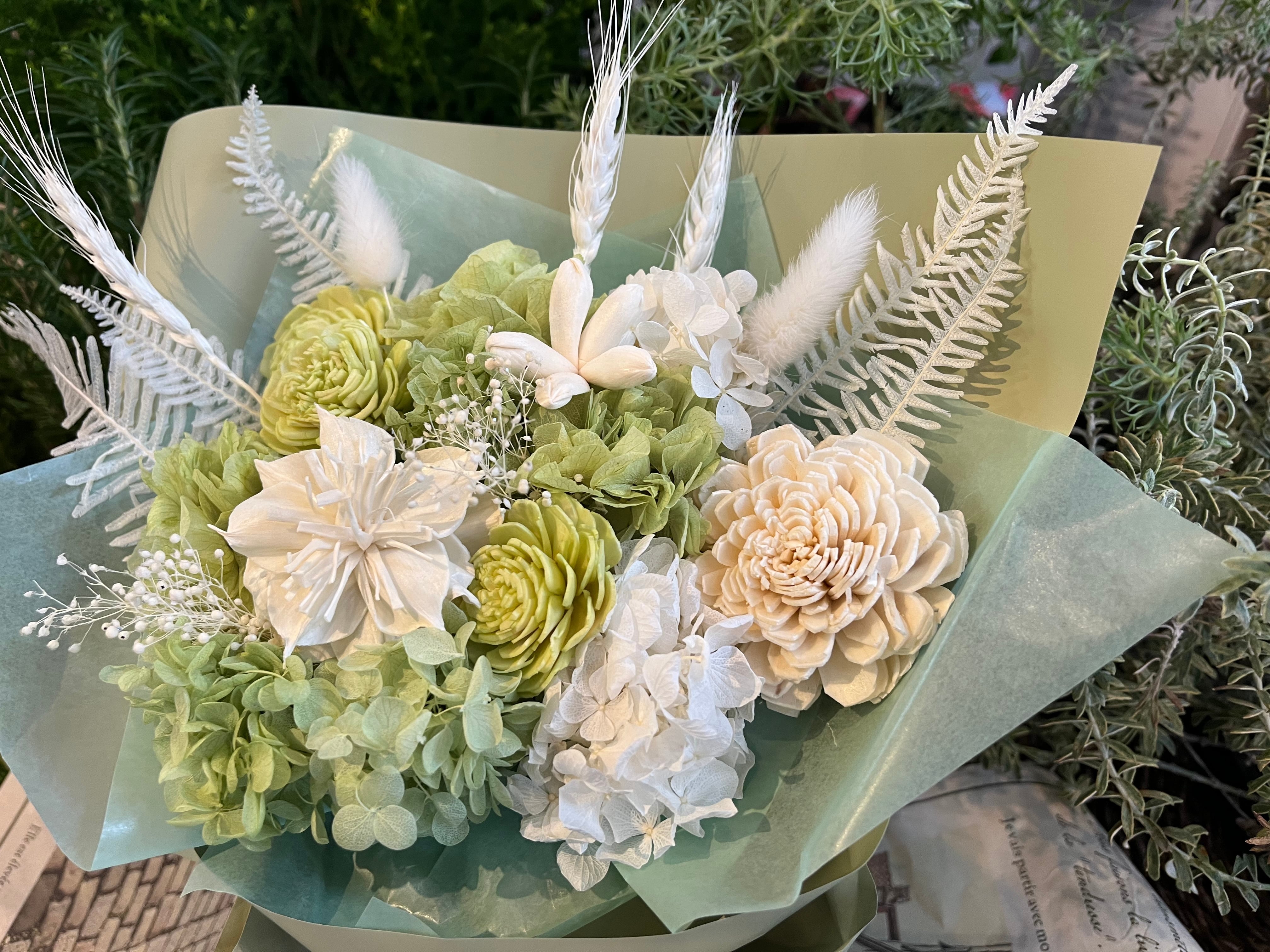 厳選された花材:あじさい、ラグラス、かすみそうなどのプリザーブドフラワーに加え、木の皮から作られたソーラーローズを使用しています。