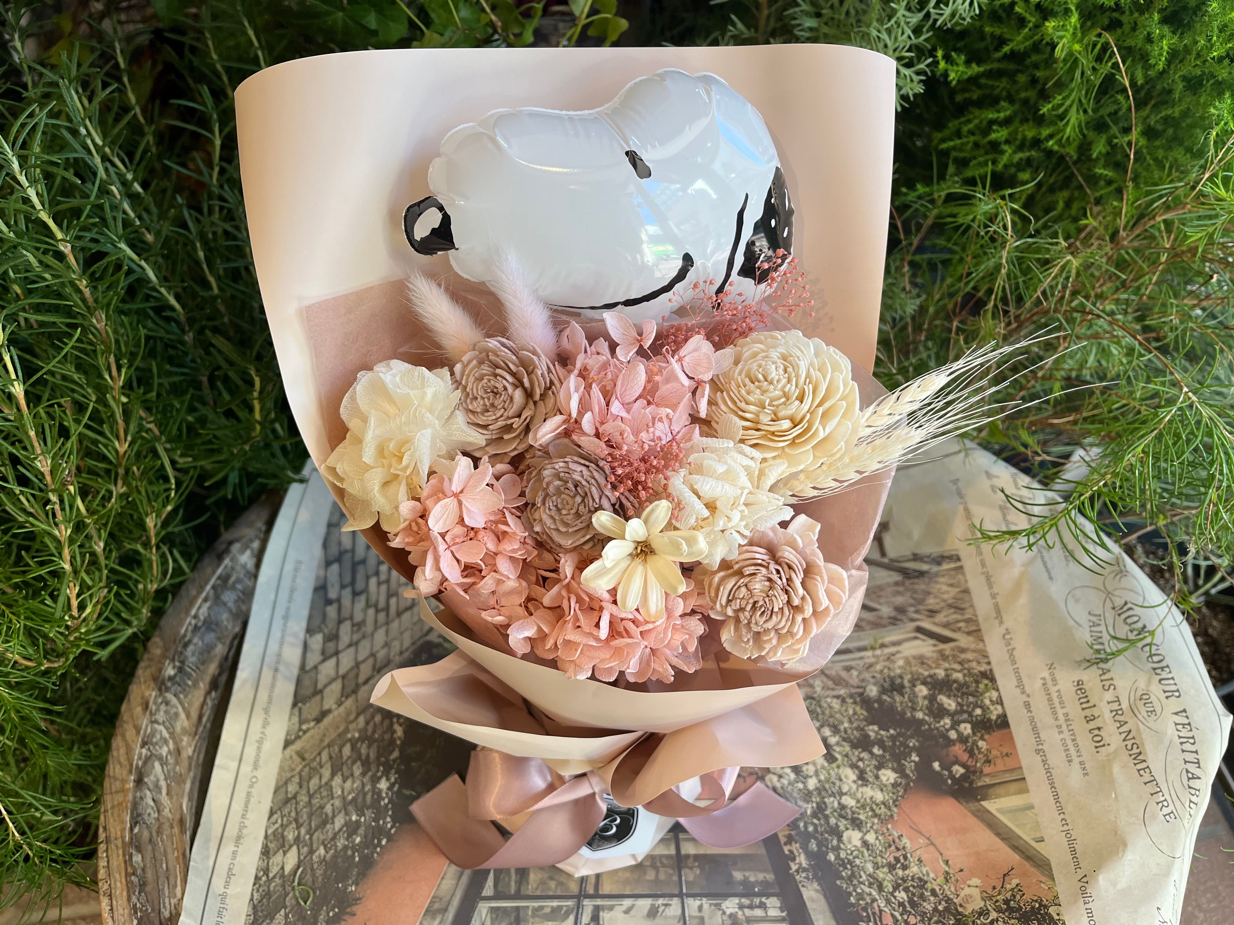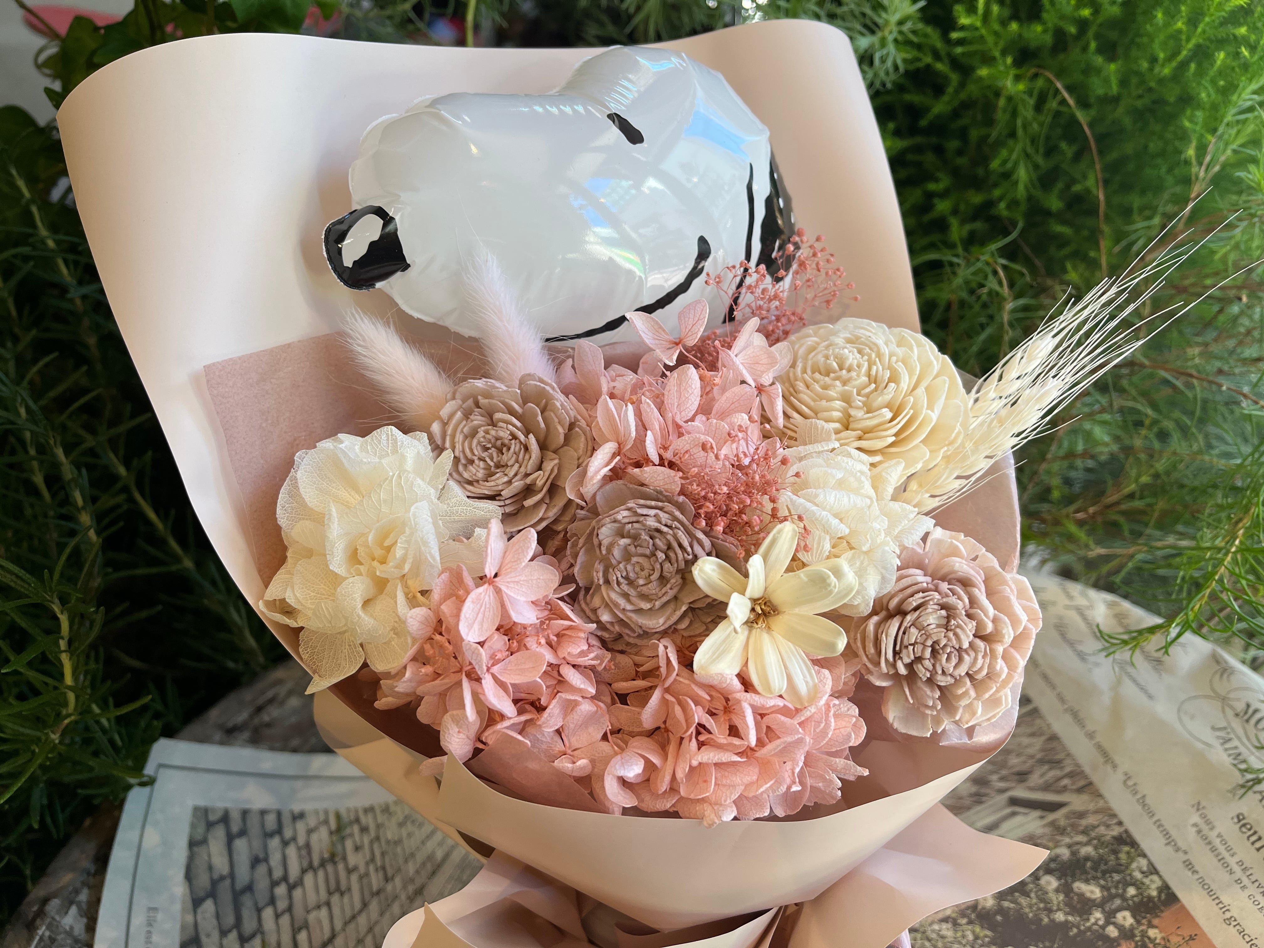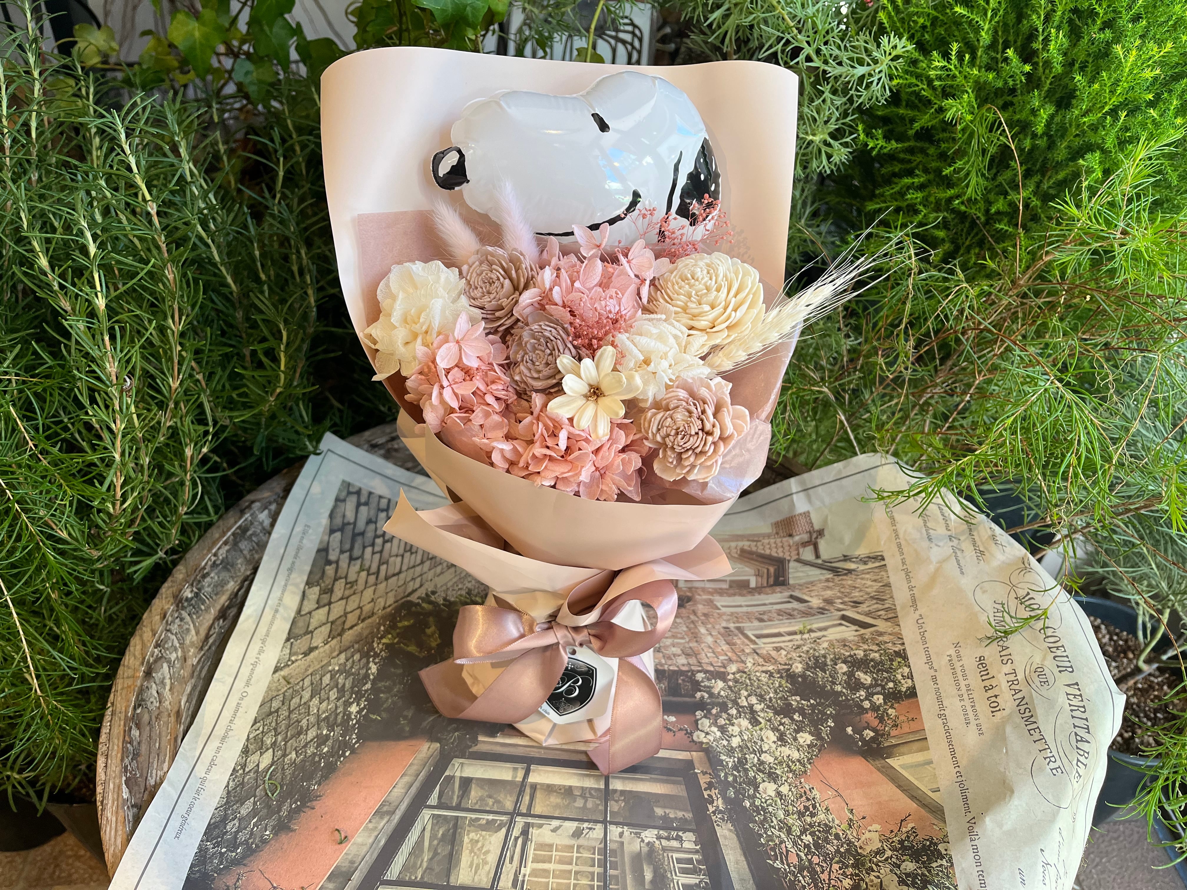【美花倶楽部のスヌーピーバルーン付き スタンディングブーケ】