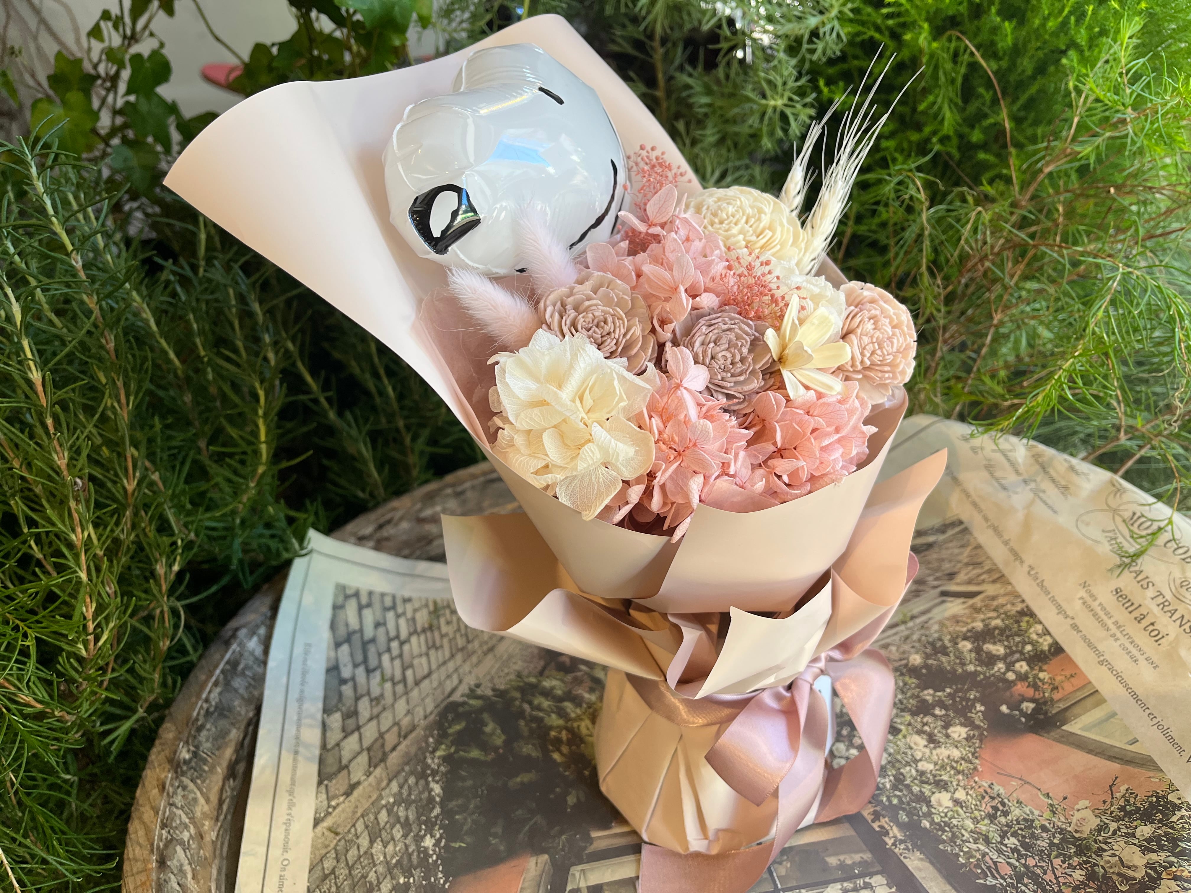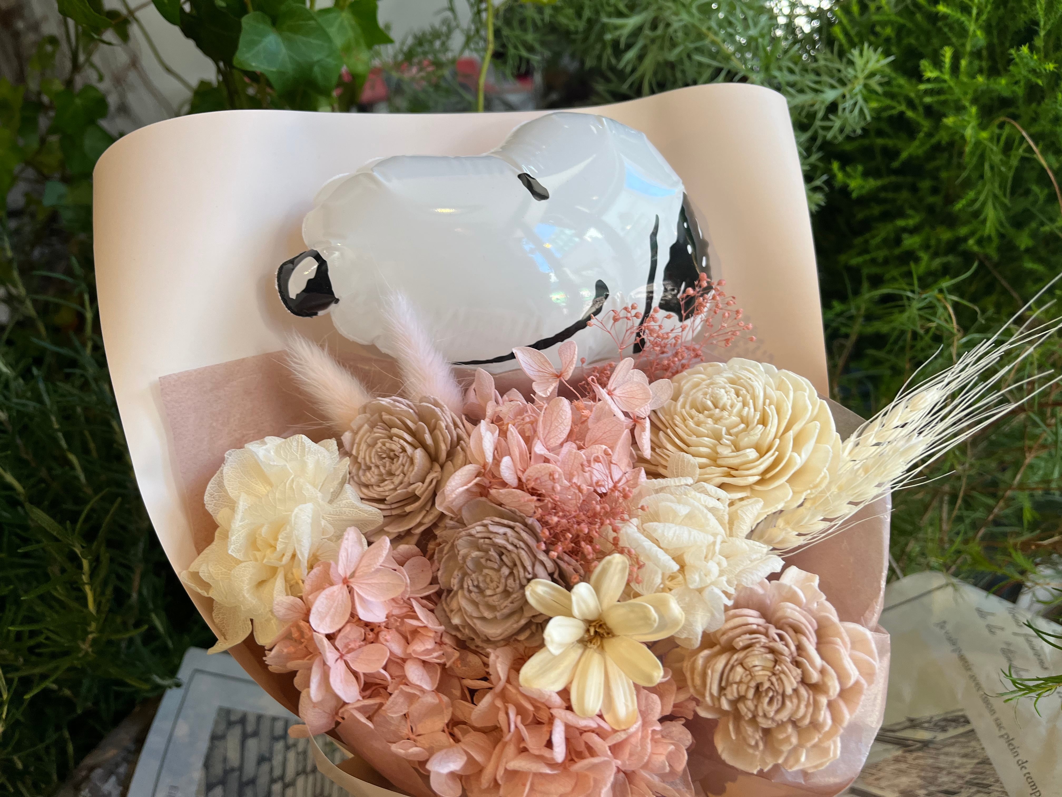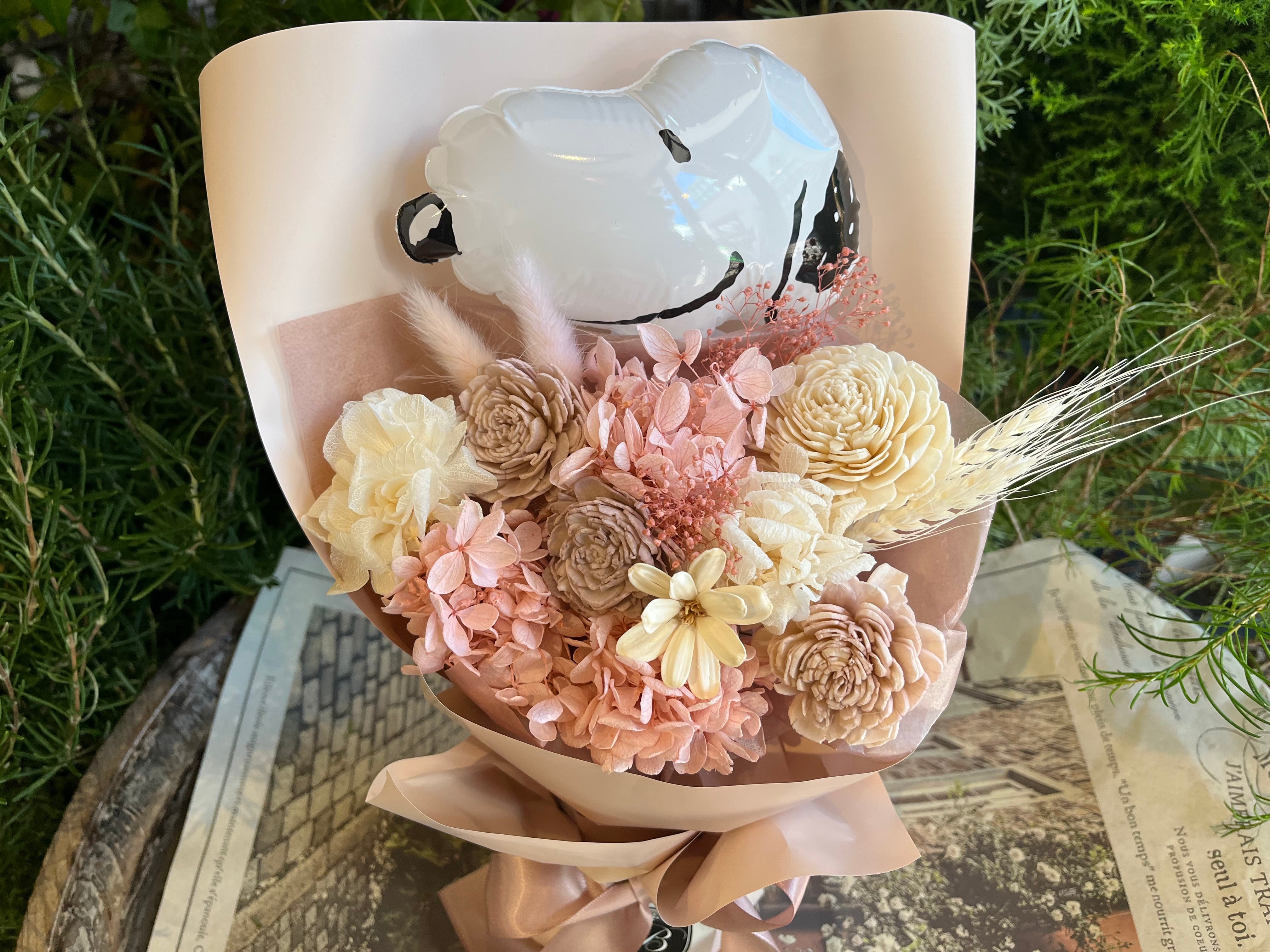 【美花倶楽部のスヌーピーバルーン付き スタンディングブーケ】