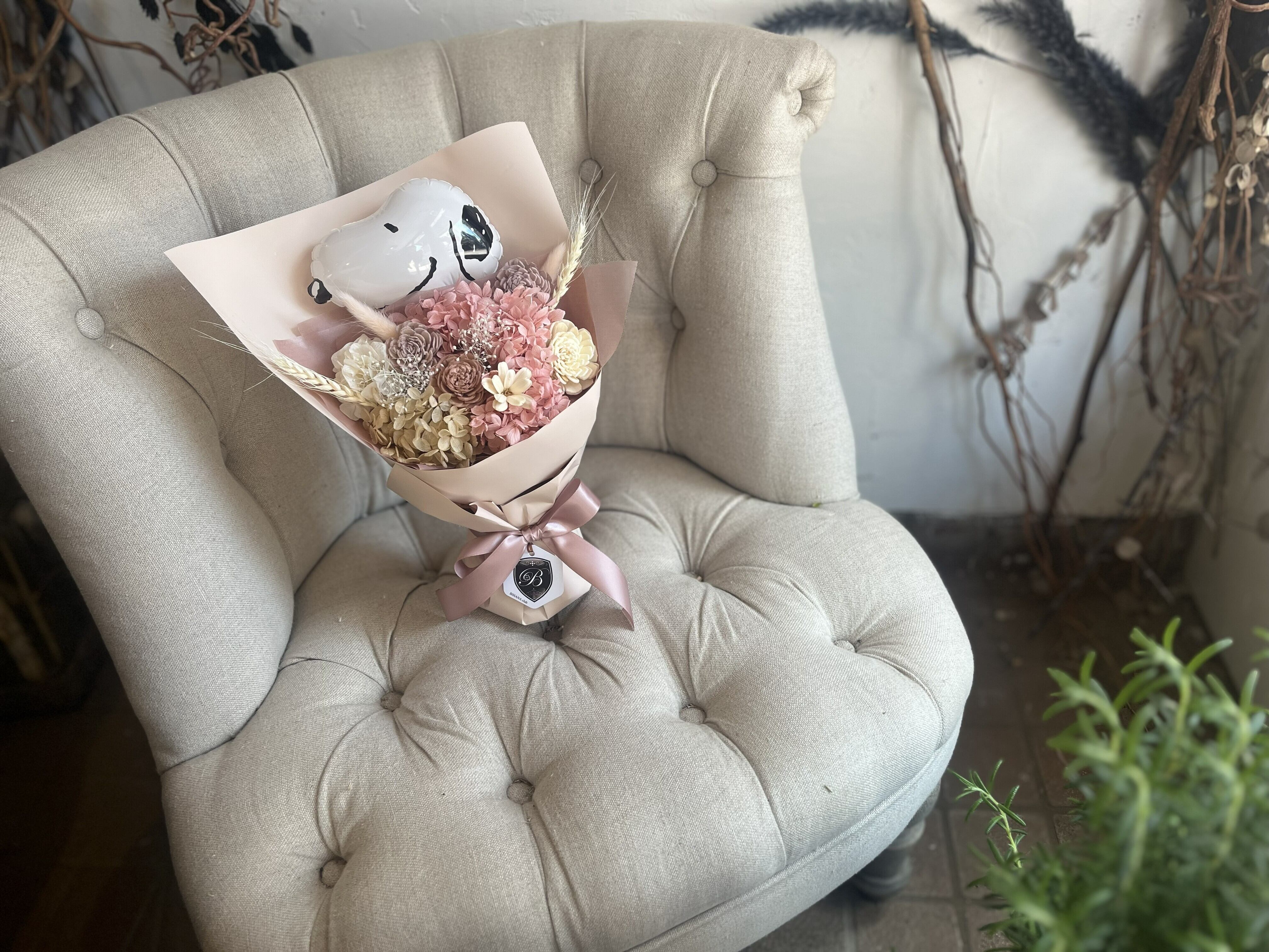 〈ノーブルピンク〉のスヌーピーバルーン付きブーケ。
