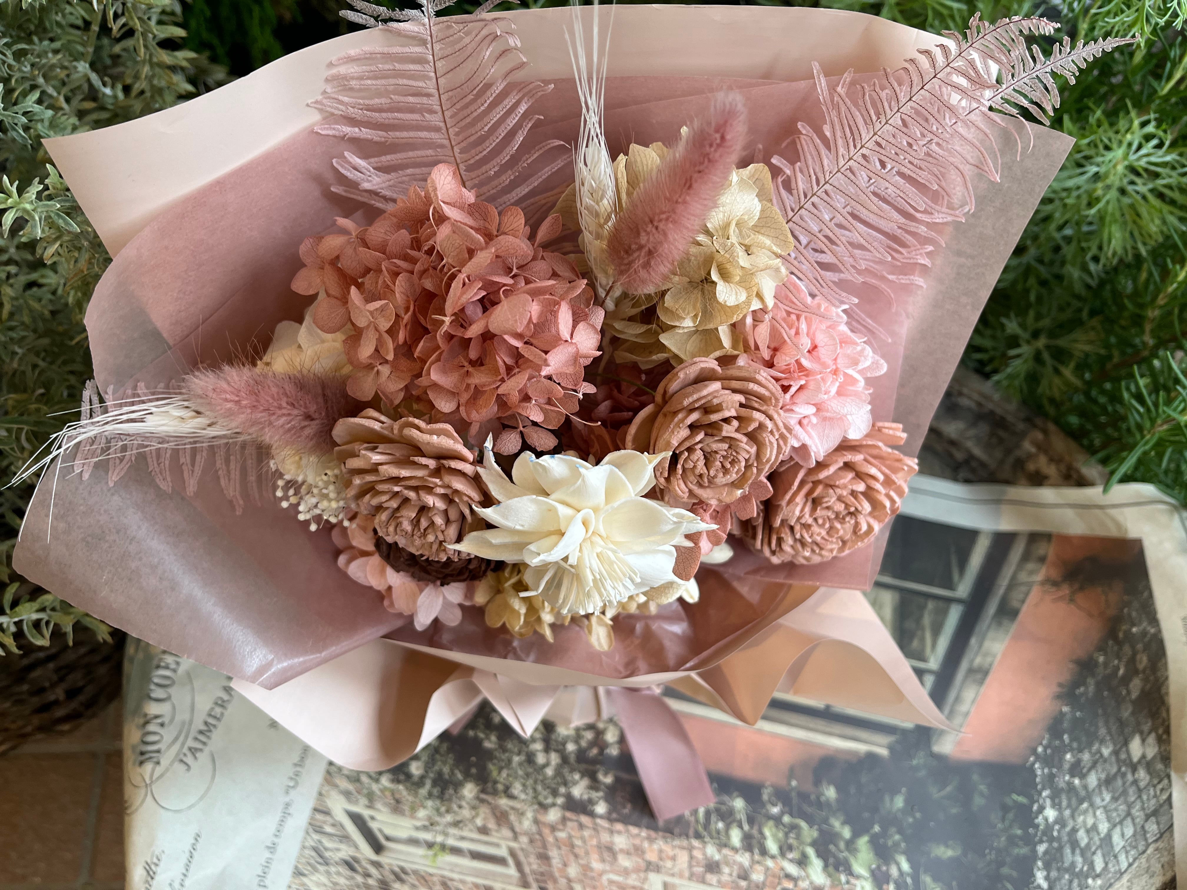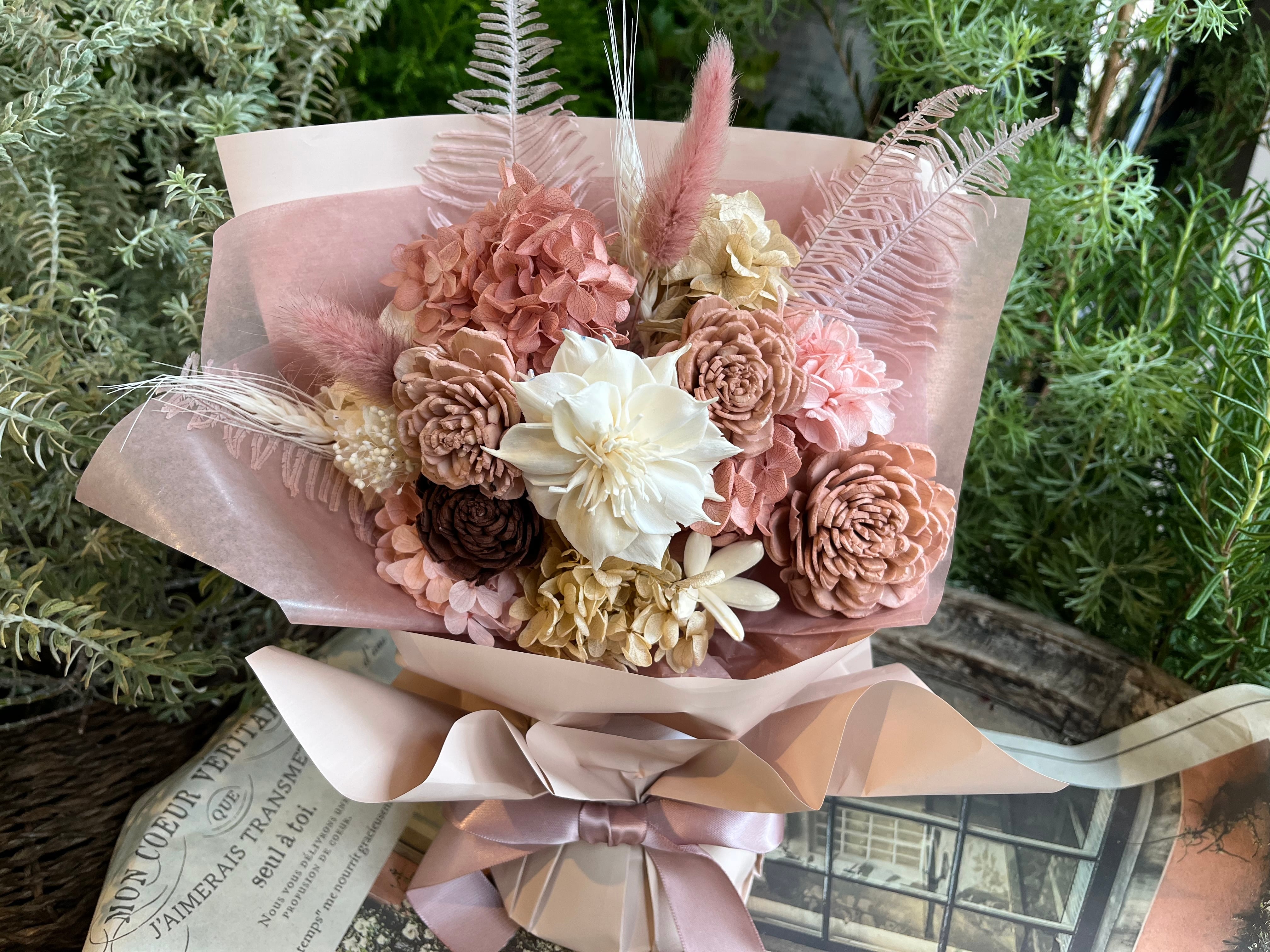 厳選された花材:あじさい、ラグラス、かすみそうなどのプリザーブドフラワーに加え、木の皮から作られたソーラーローズを使用しています。