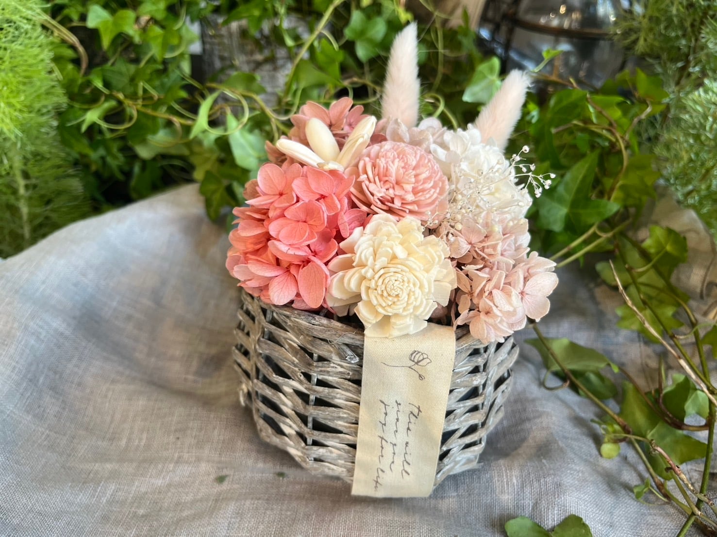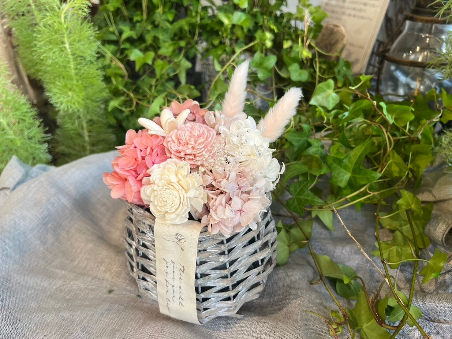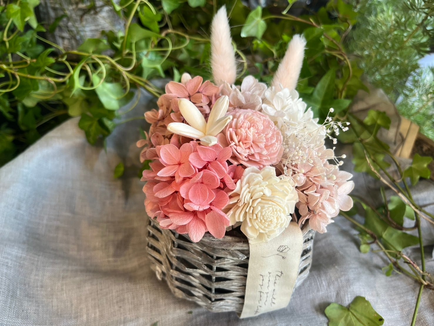 コロンとしたシャビーシックなグレーのかごに、小ぶりなSサイズの華やかなストロベリーイメージの色合いのプリザーブドフラワーを優しくアレンジしました。コンパクトで場所を選ばず飾れるため、上品で落ち着いた色合いが空間を穏やかに彩ります。