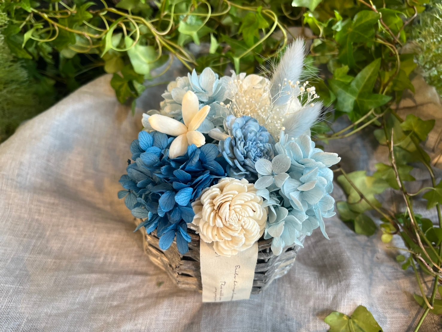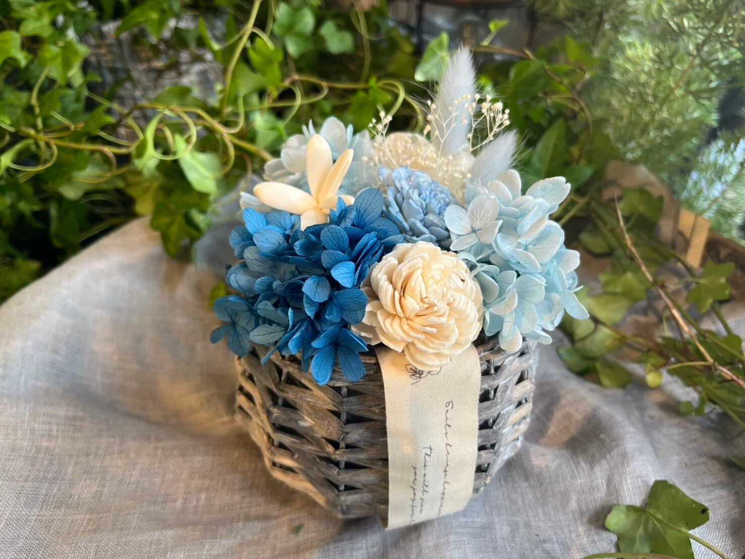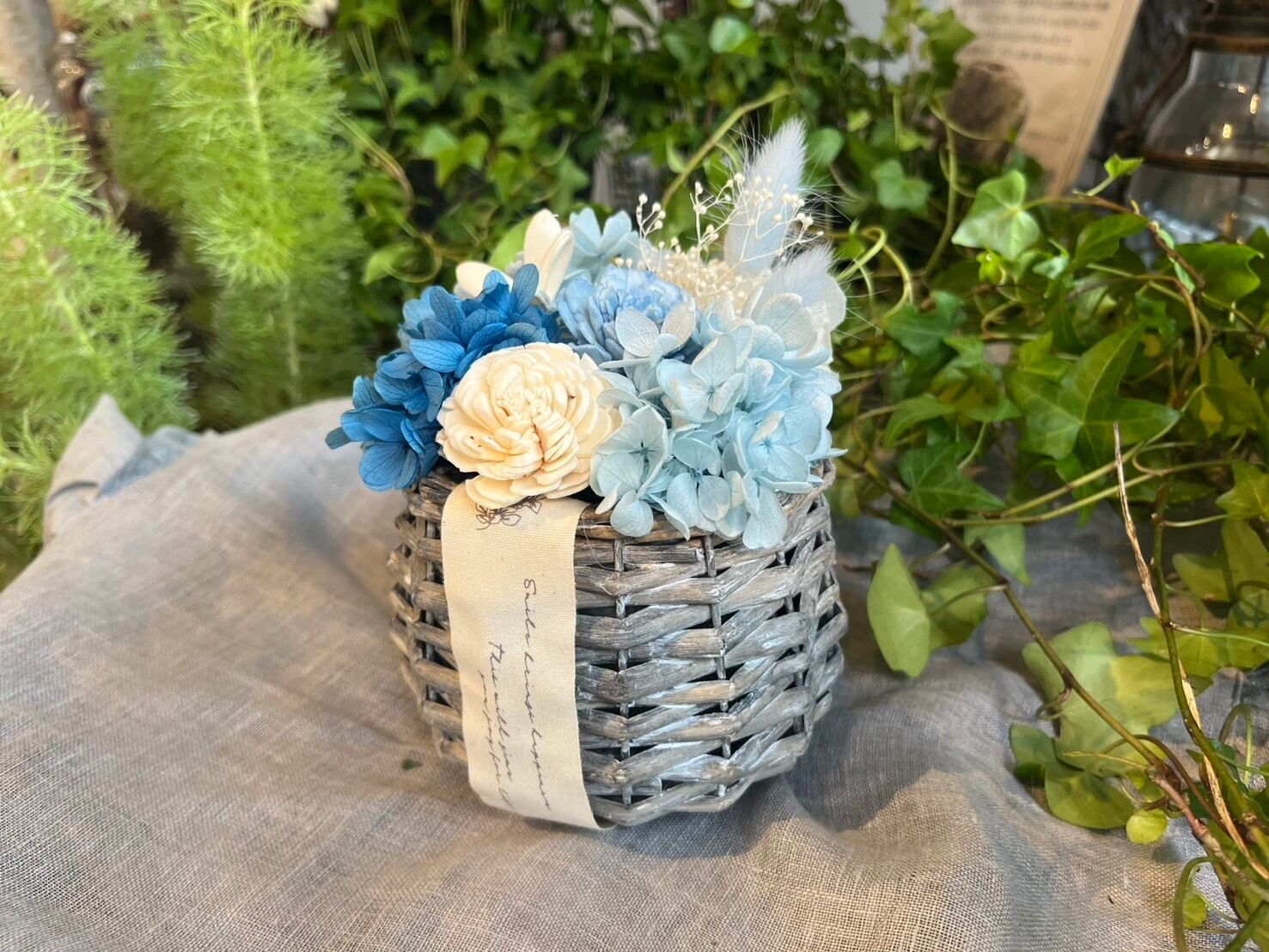 コロンとしたシャビーシックなグレーのかごに、小ぶりなSサイズの爽やかなの色合いのプリザーブドフラワーをアレンジしました。コンパクトで場所を選ばず飾れます。クールで落ち着いた色合いが印象的です。