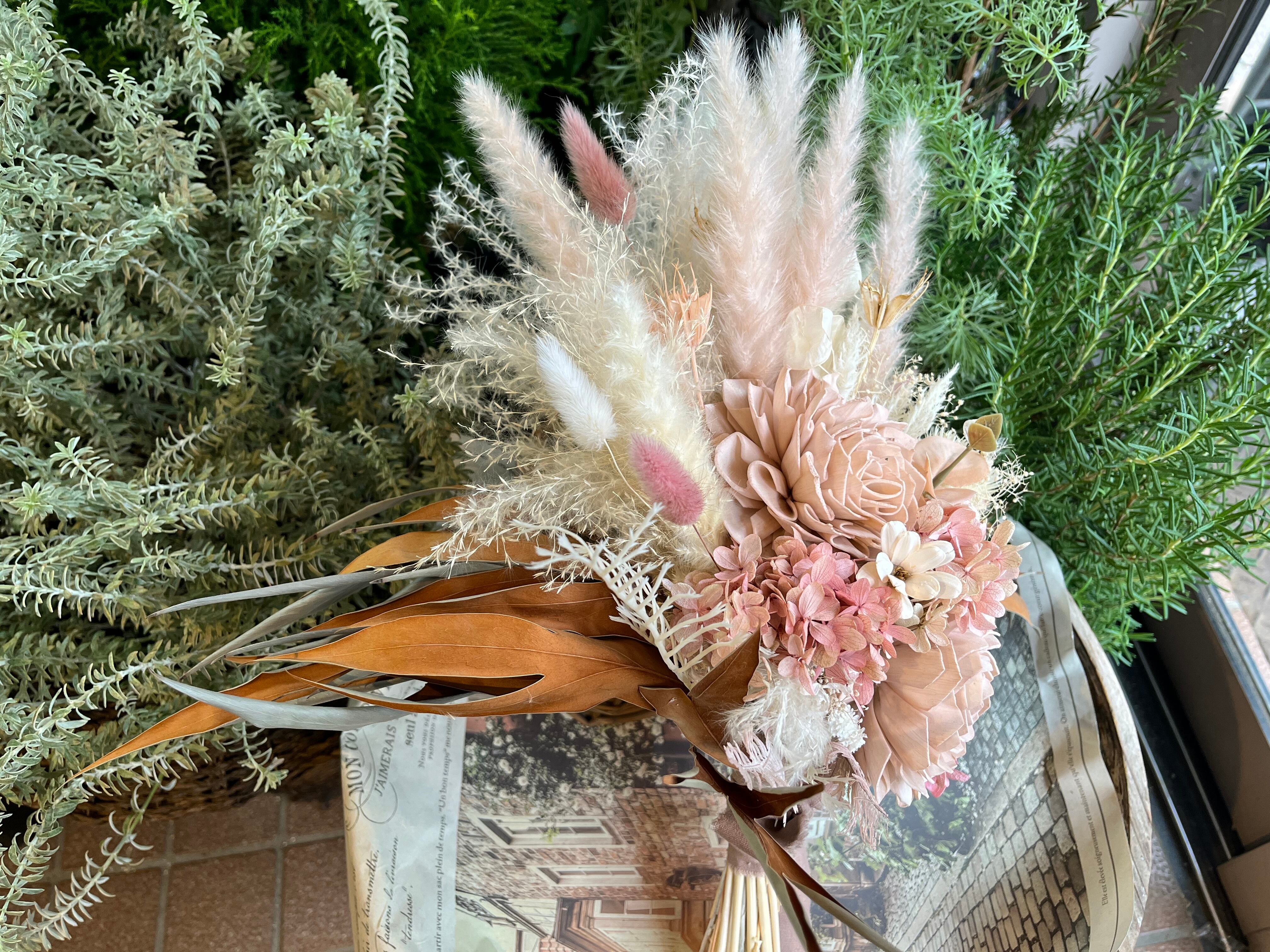 ドライフラワーのシックで落ち着いた色合い、ナチュラルでアンティーク調の風合いがトレンド両方をミックスしますと、