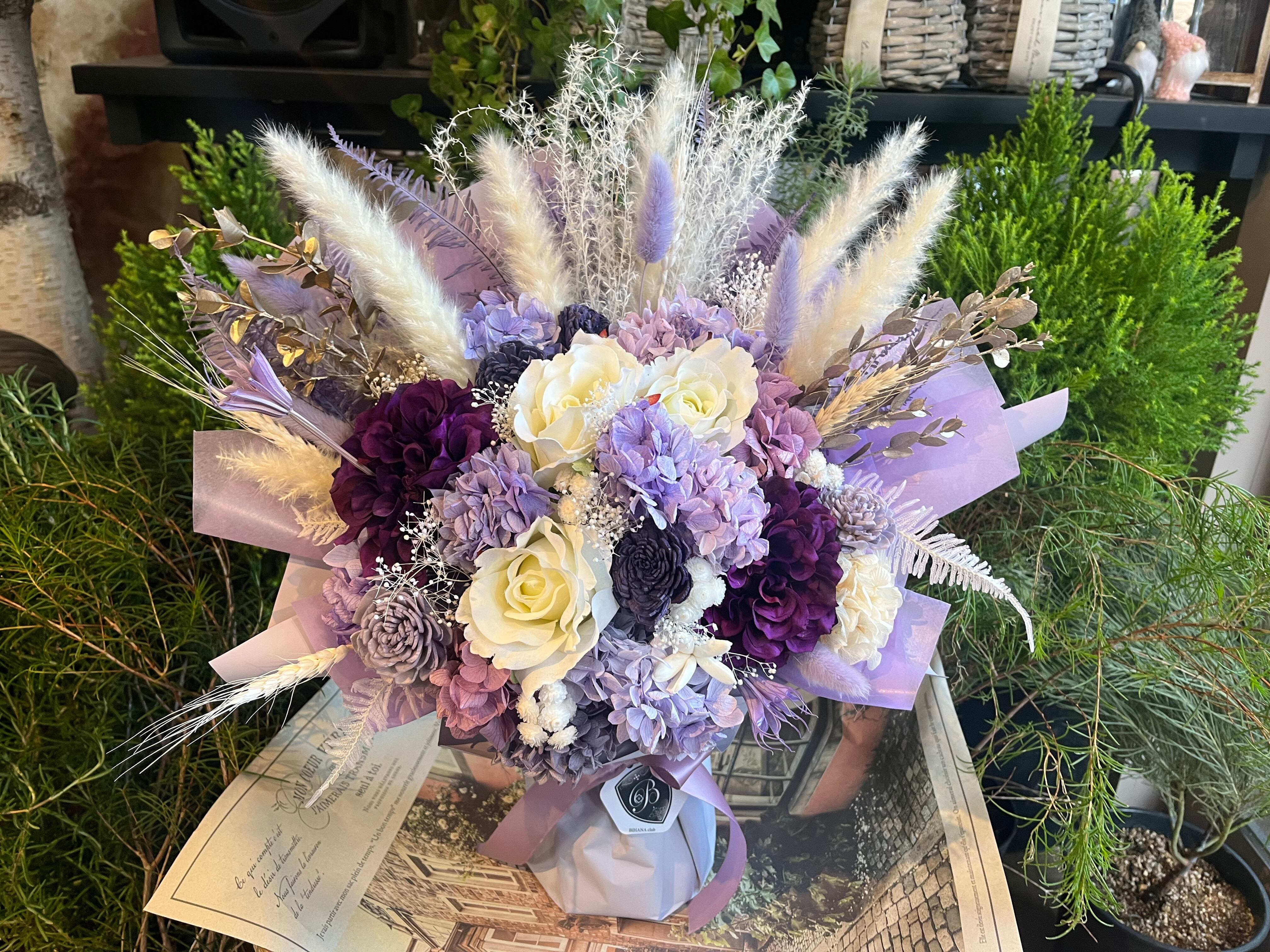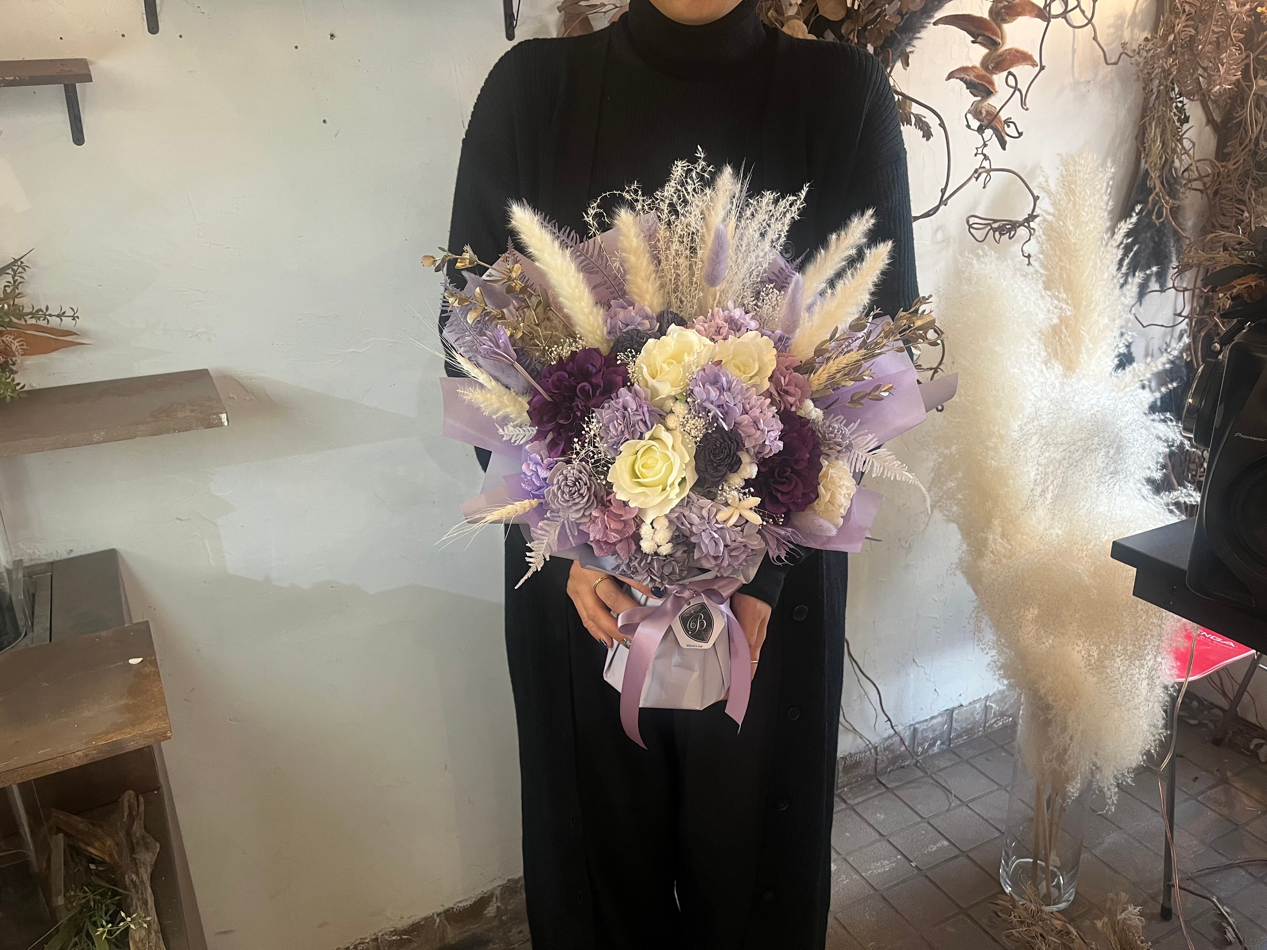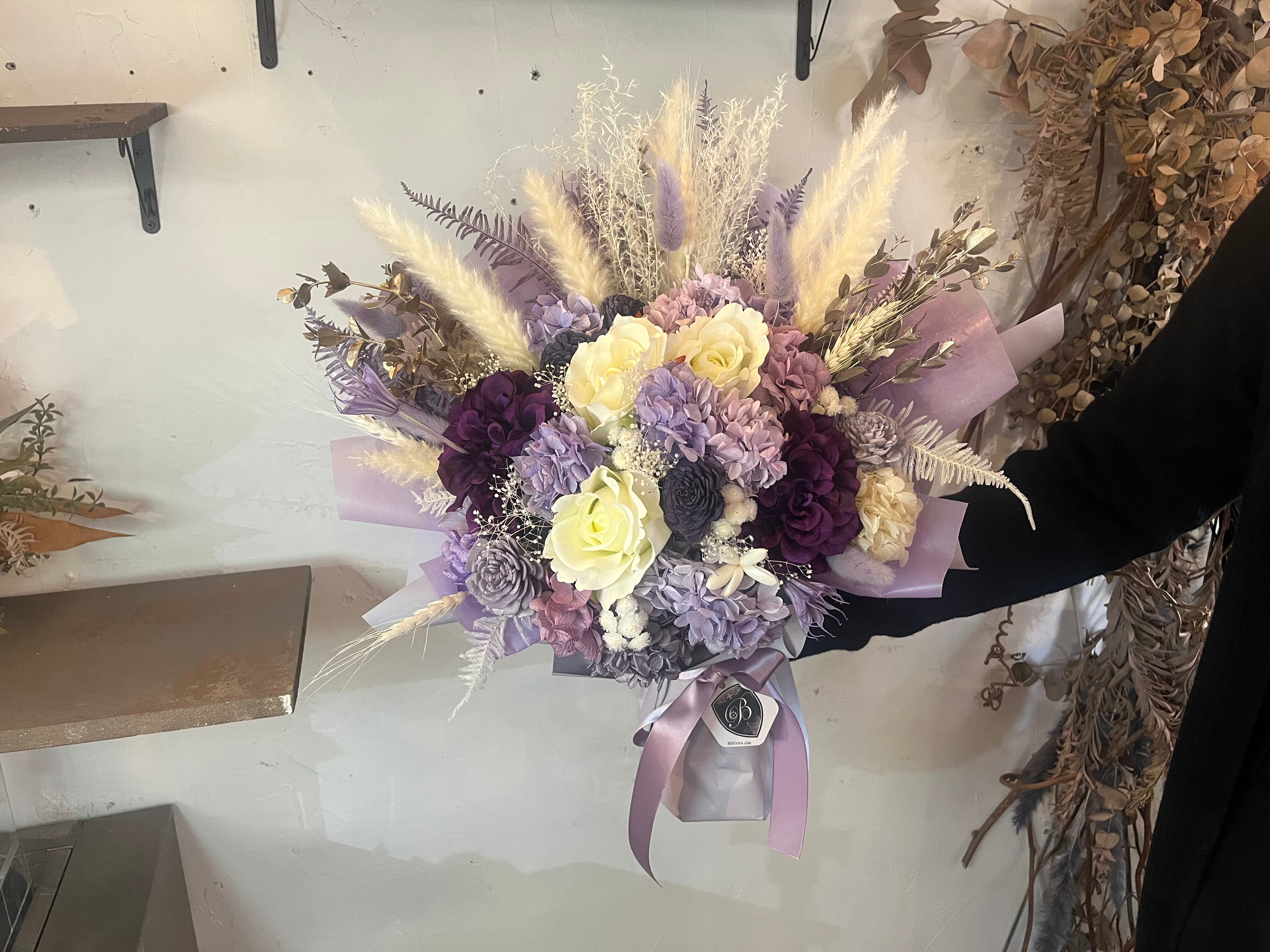 やわらかなパープルが上品に調和した、プリザーブドフラワーのスタンディングブーケ。