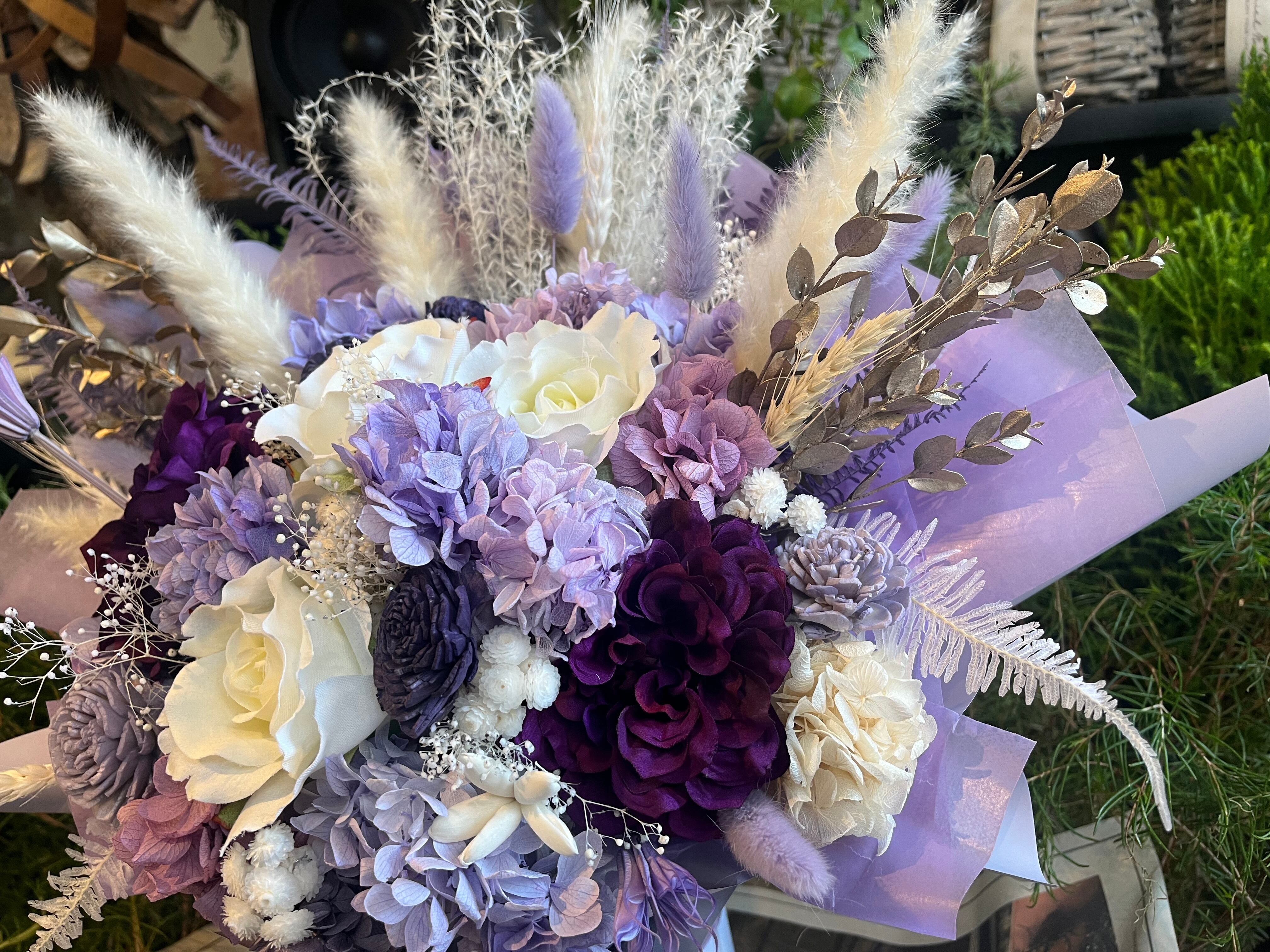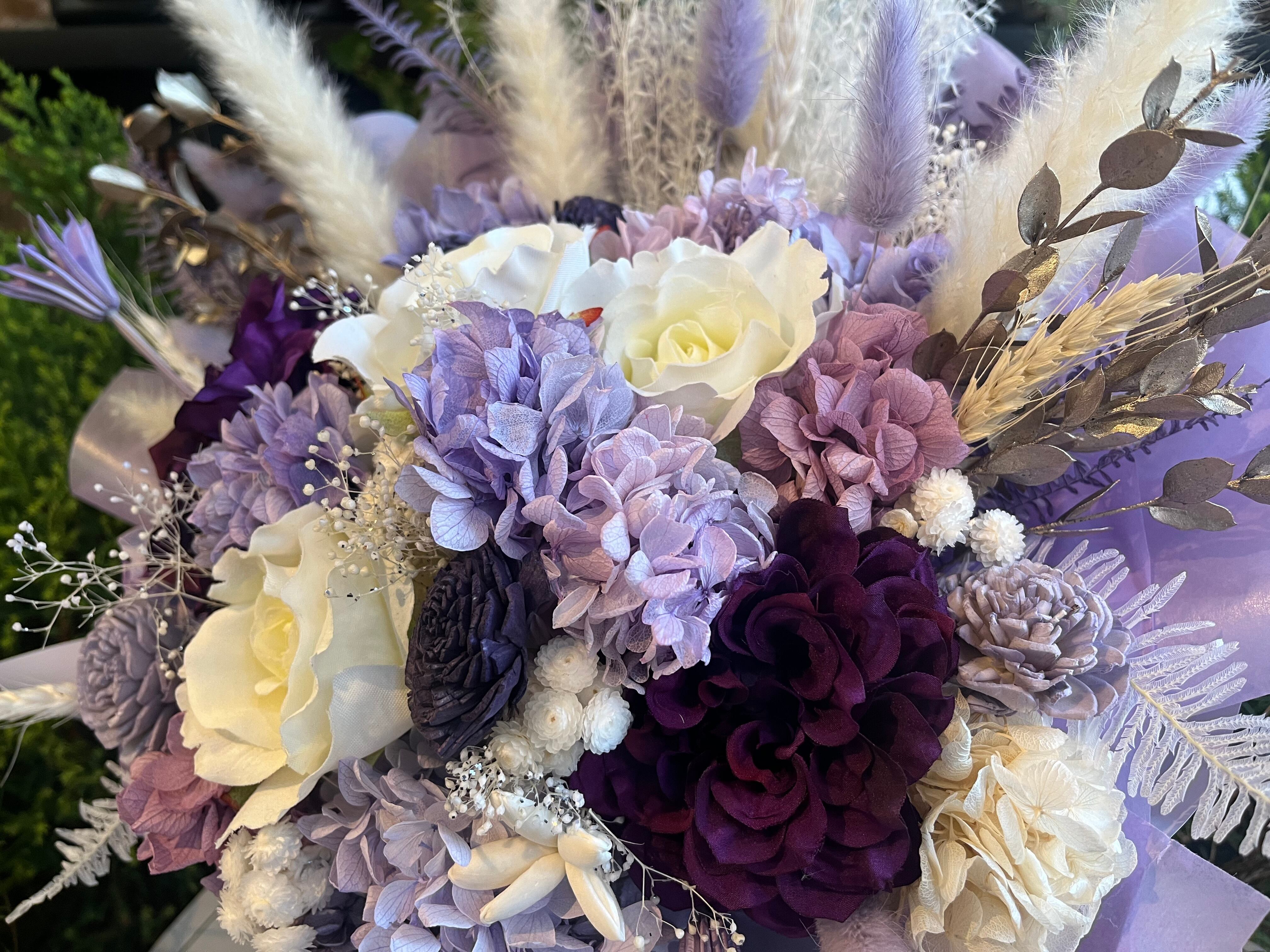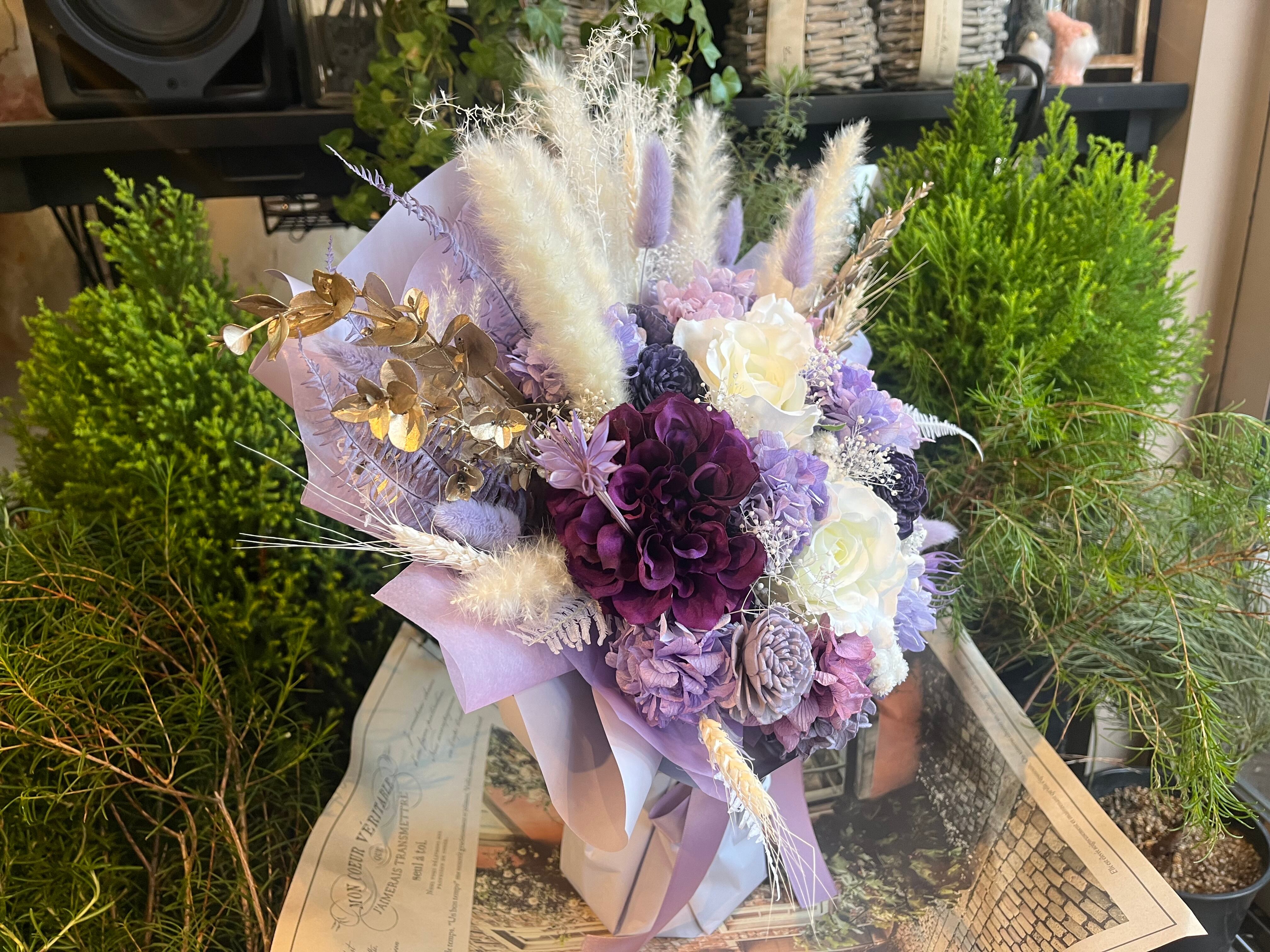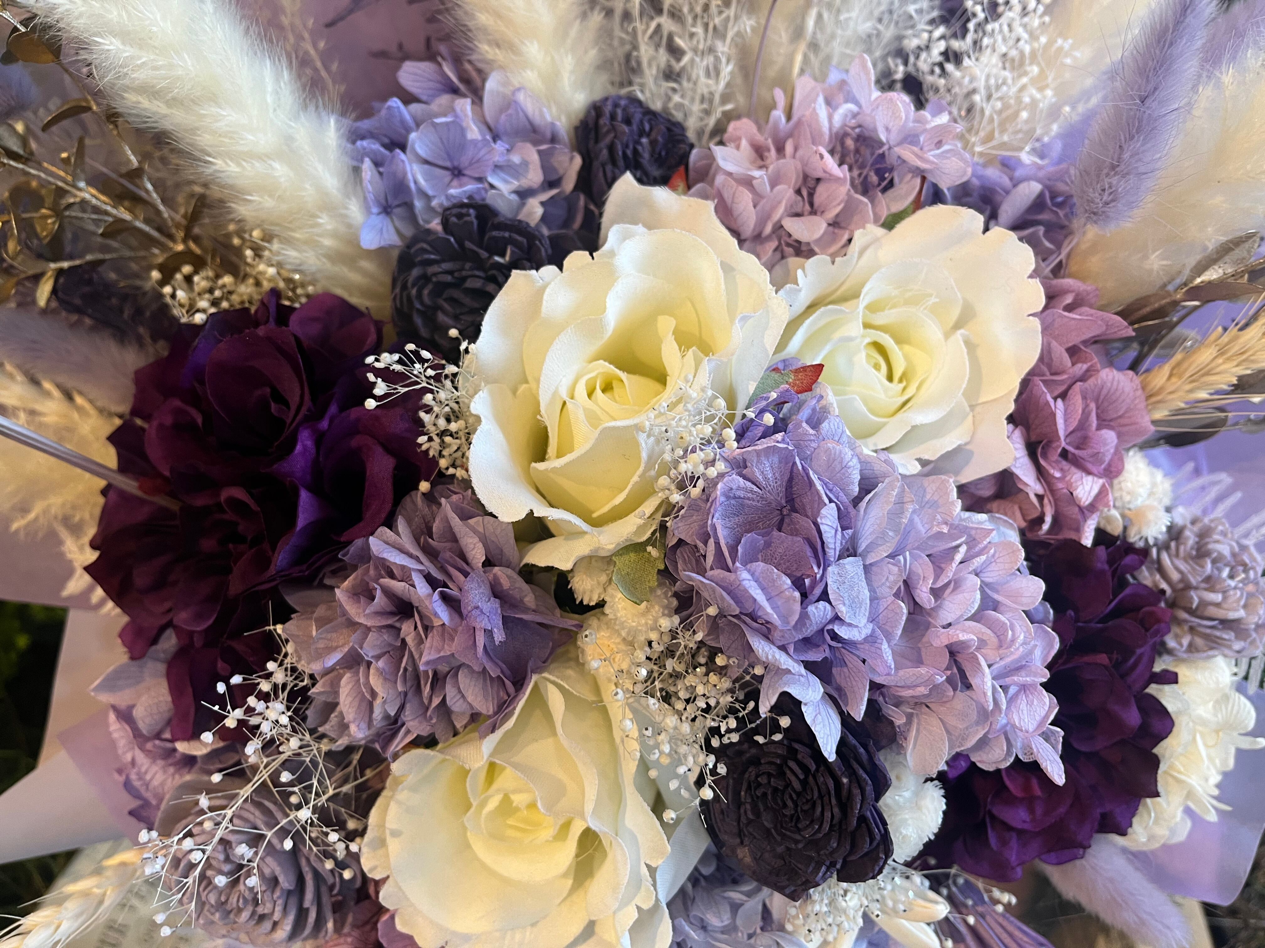 やわらかなパープルが上品に調和した、プリザーブドフラワーのスタンディングブーケ。
