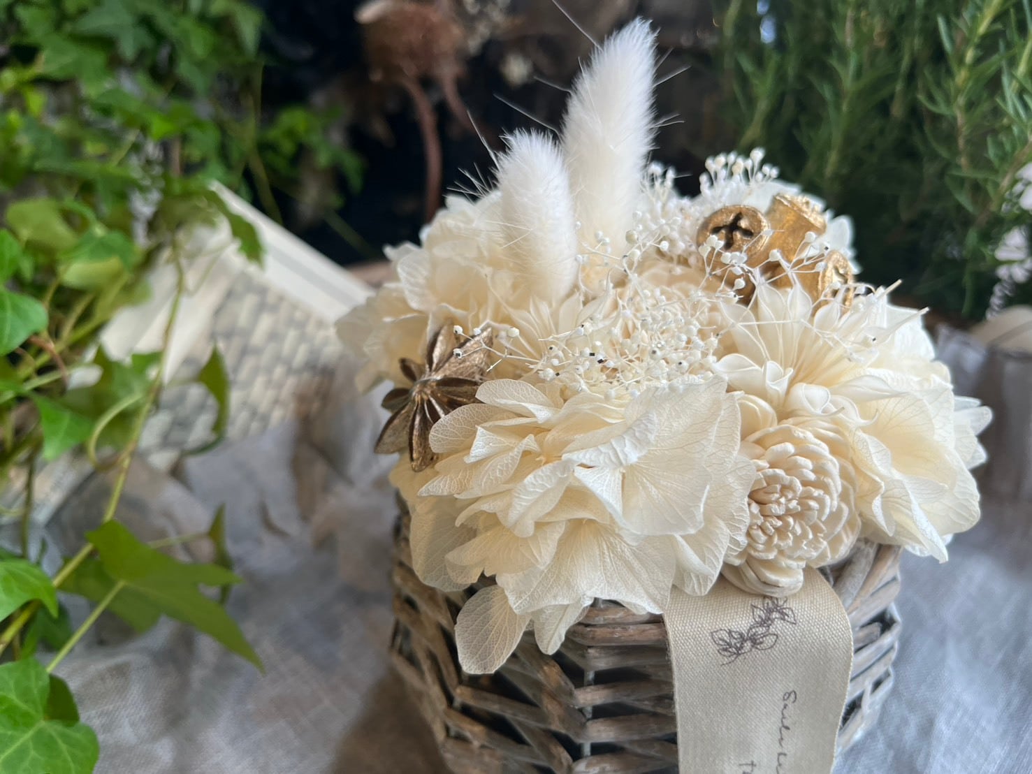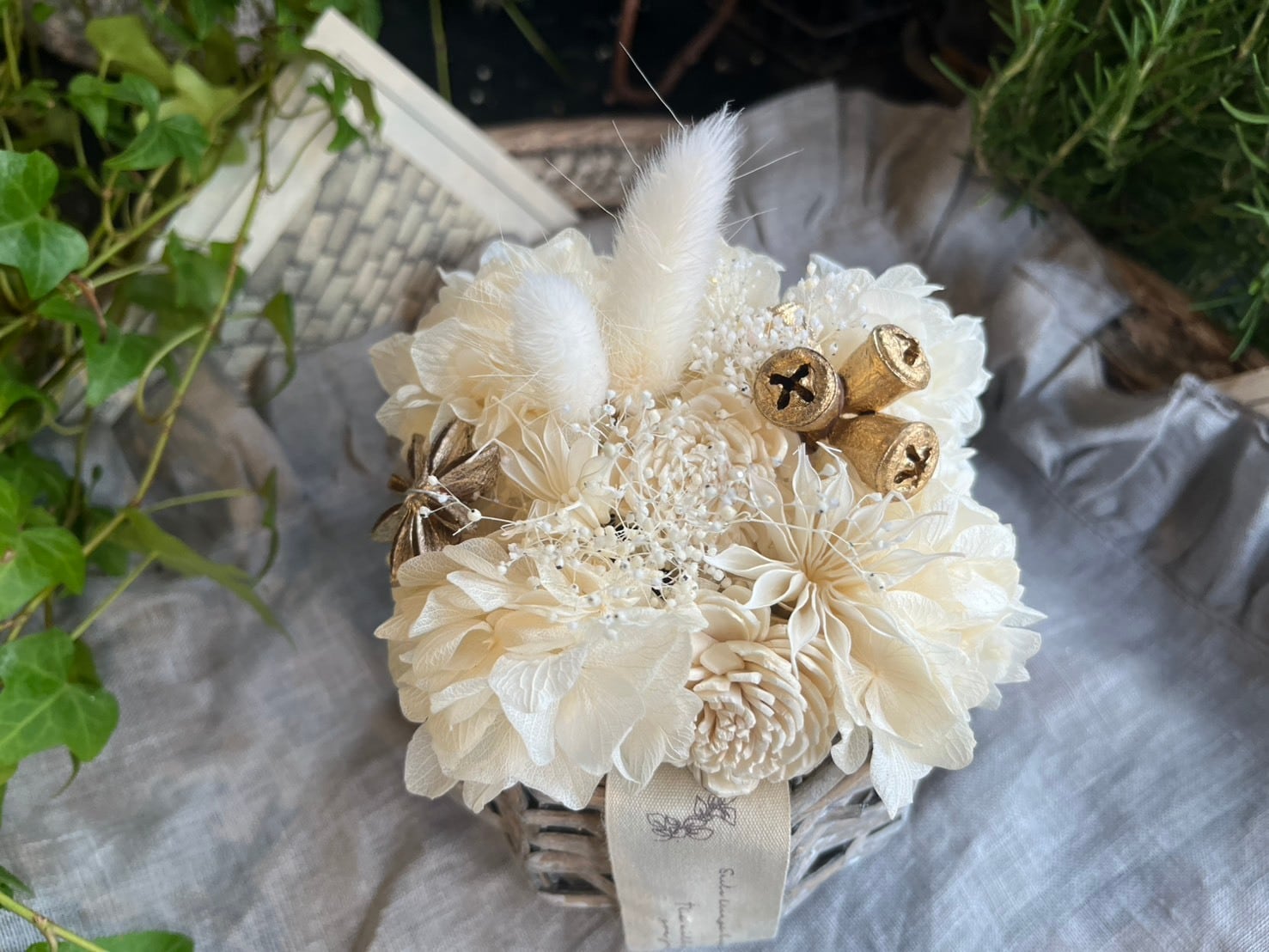 コロンとしたシャビーシックなグレーのかごに、小ぶりなSサイズの上級者さん向けのオシャレな色合いのプリザーブドフラワーをアレンジしました。アクセントにマットゴールドの実物が入ってます。