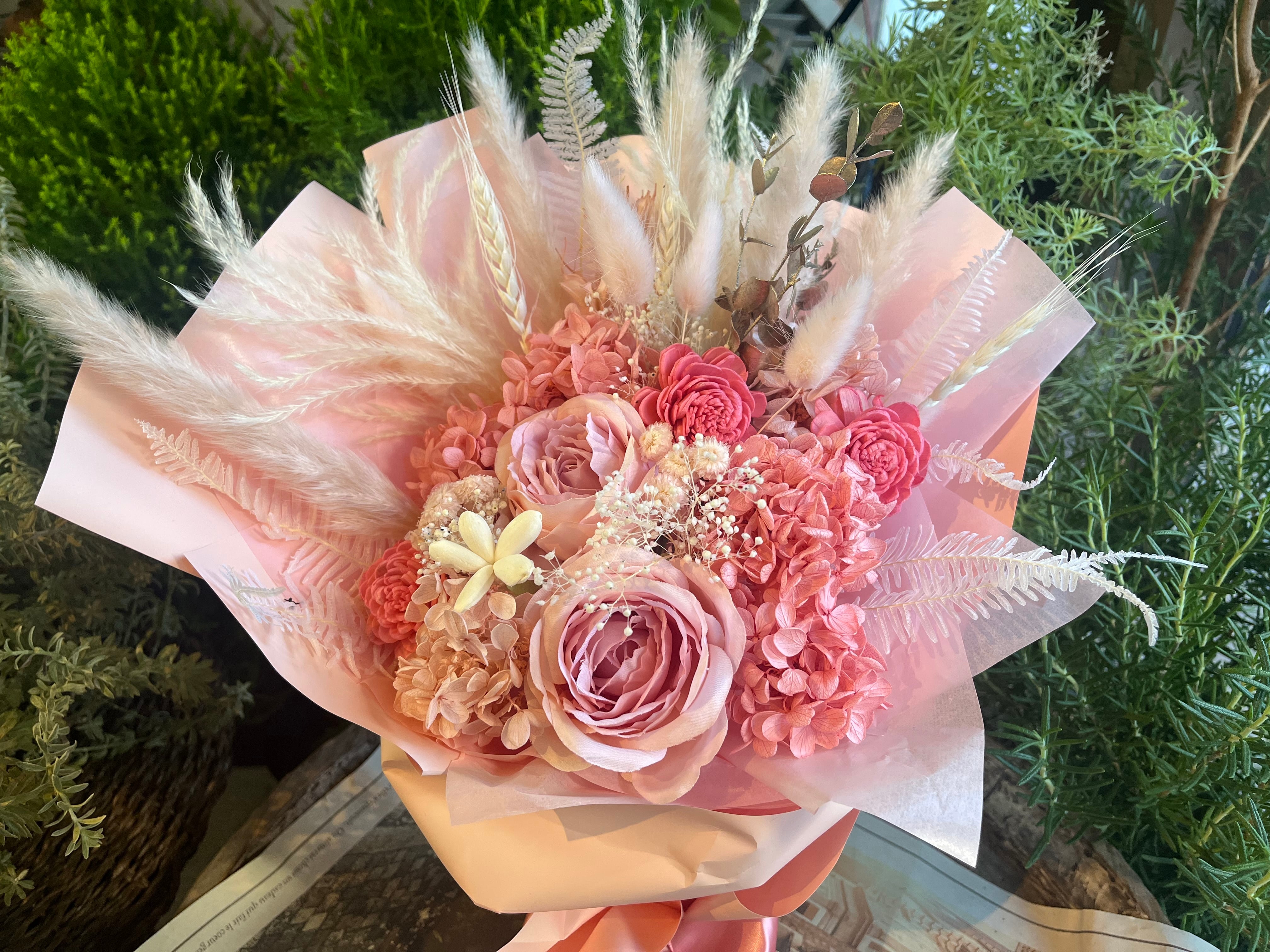 厳選された花材: あじさい、ラグラス、ラメ付のかすみそうなどのプリザーブドフラワーに加え、木の皮から作られたソーラーローズや、生花のような美しさを持つ高級造花(薔薇)を厳選し、贅沢に使用しています。