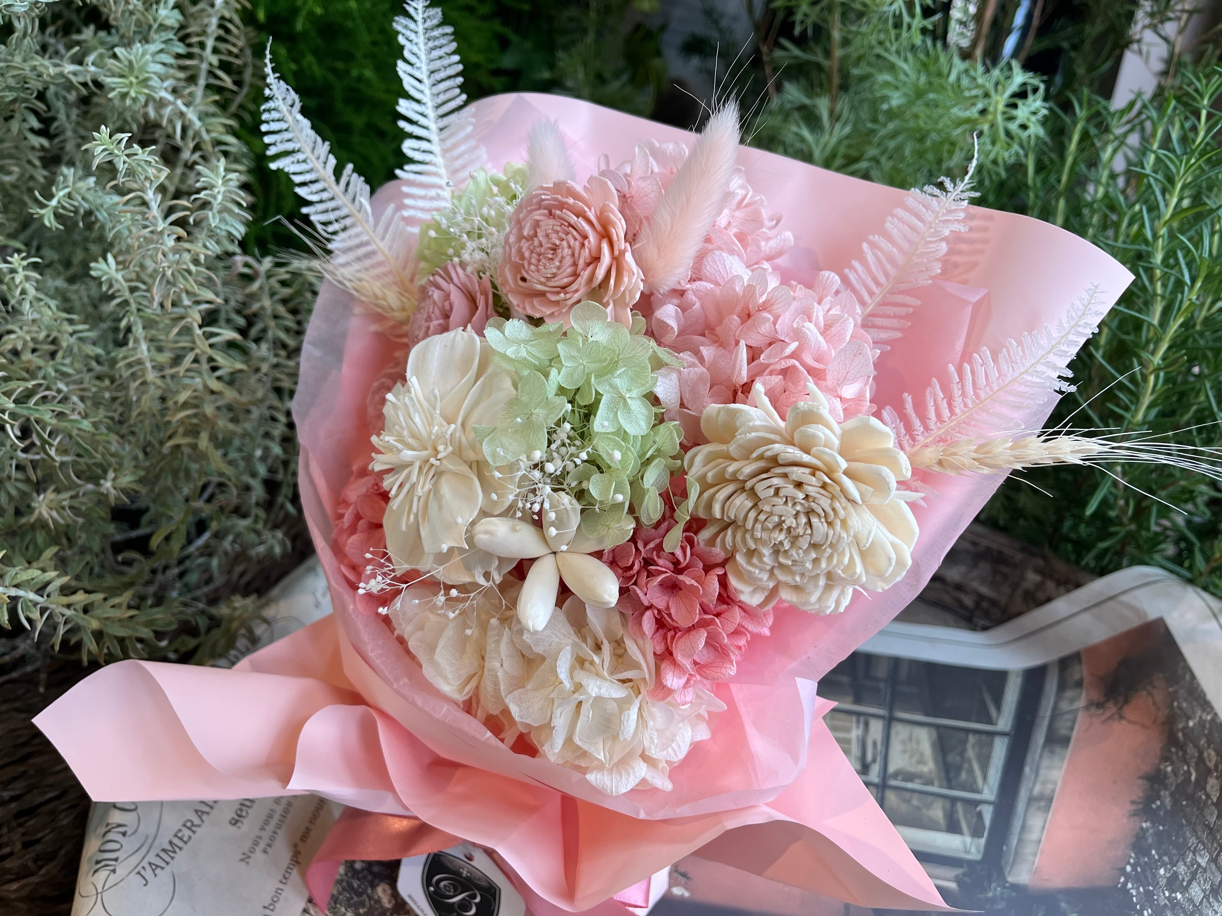 厳選された花材:あじさい、ラグラス、かすみそうなどのプリザーブドフラワーに加え、木の皮から作られたソーラーローズを使用しています。