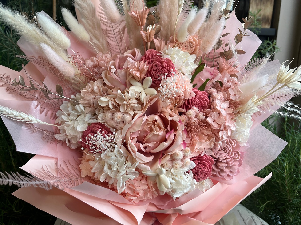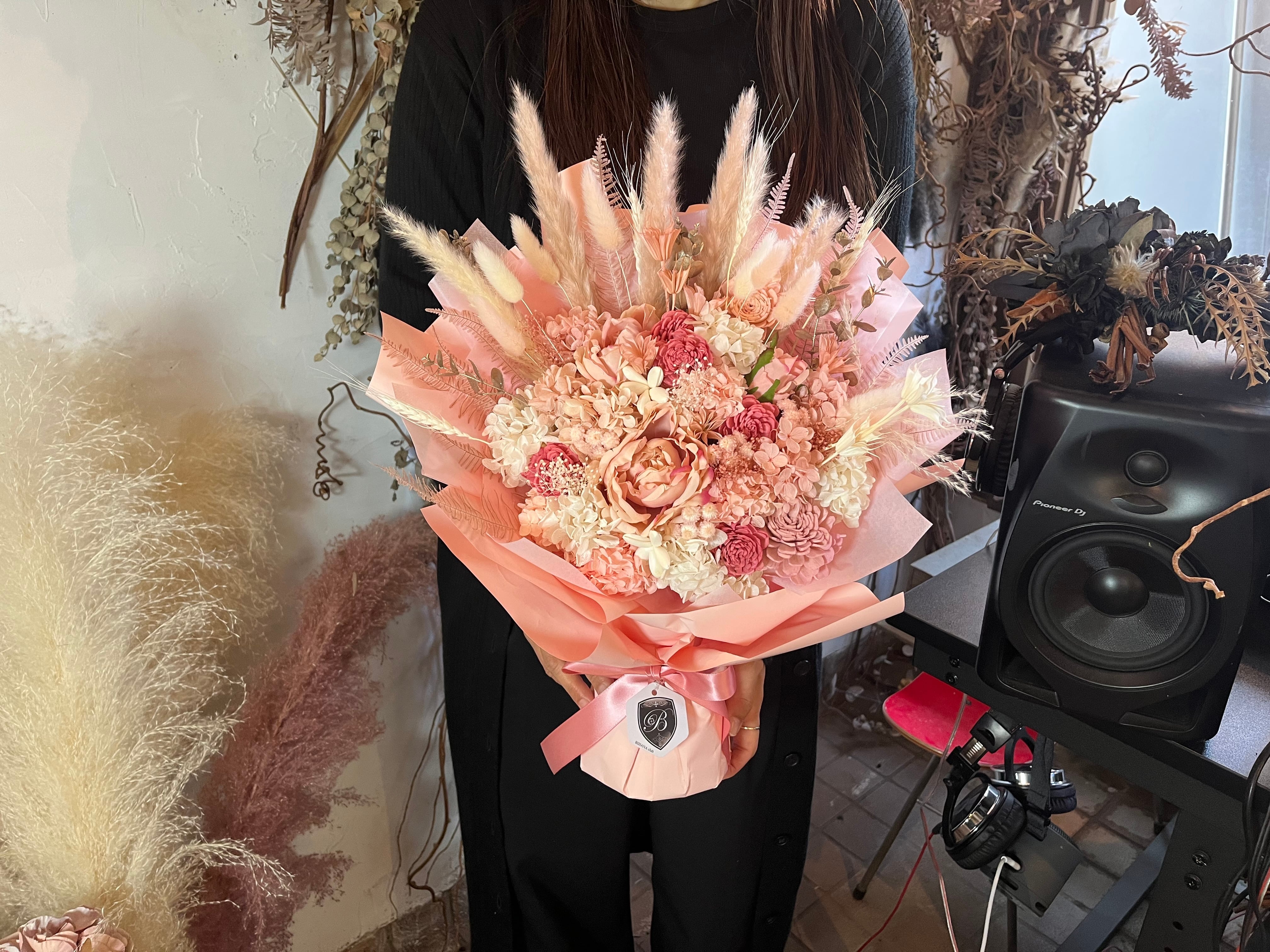 自立型の花束なので花瓶不要、水やりもいらず長く美しさを楽しめます。
