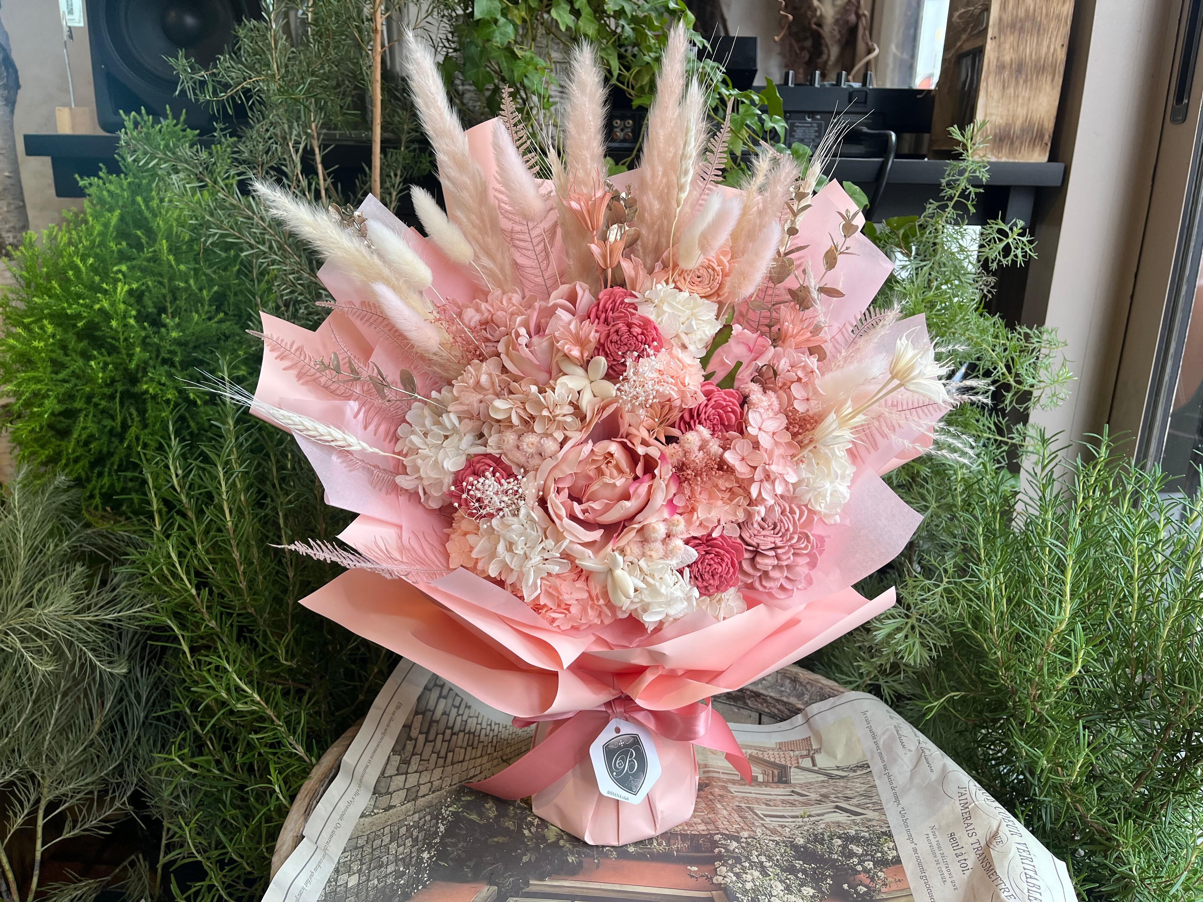 厳選された花材:あじさい、ラグラス、かすみそうなどのプリザーブドフラワーに加え、木の皮から作られたソーラーローズや、生花のような美しさを持つ高級造花(薔薇)を厳選し、贅沢に使用しています。