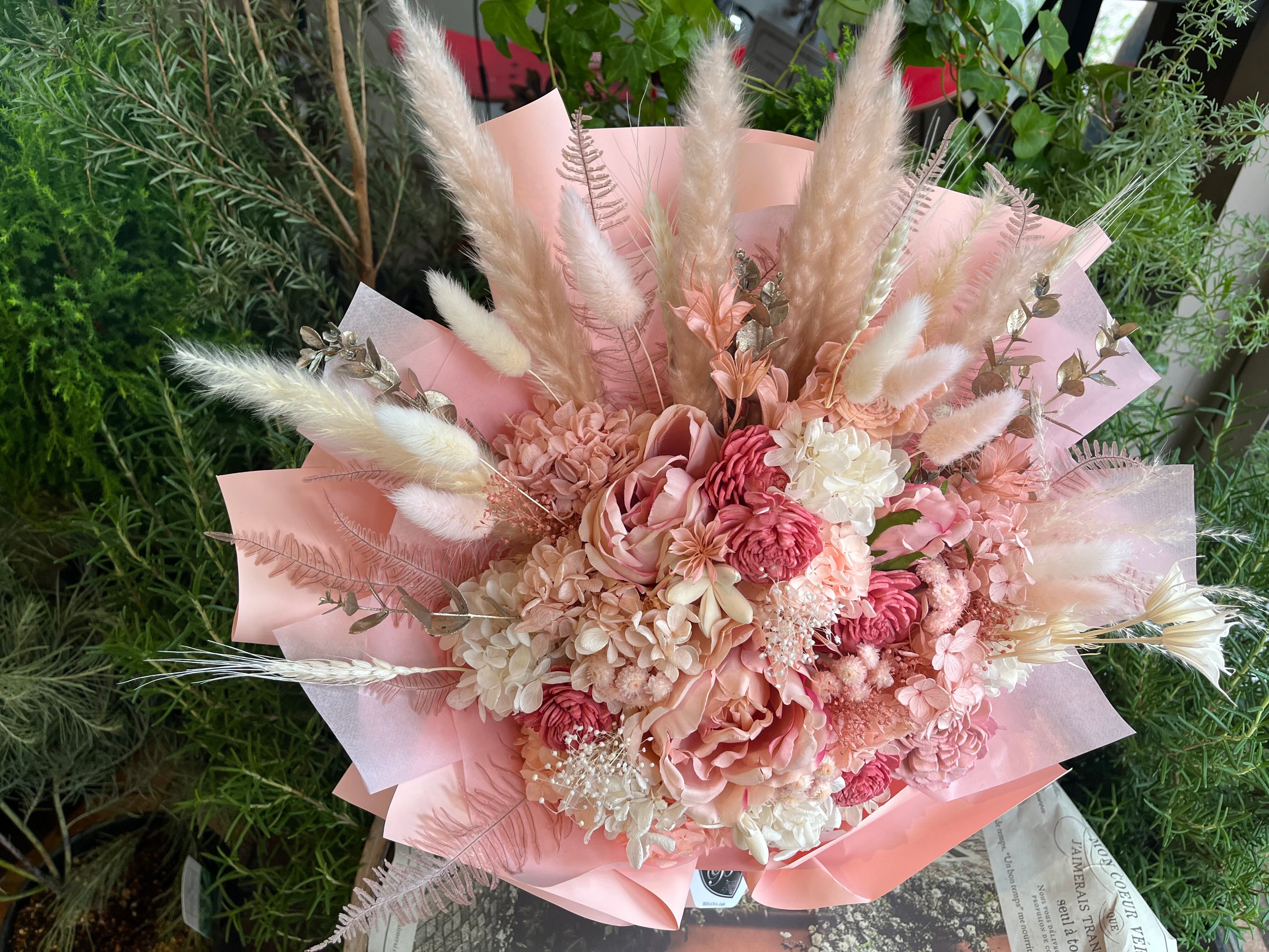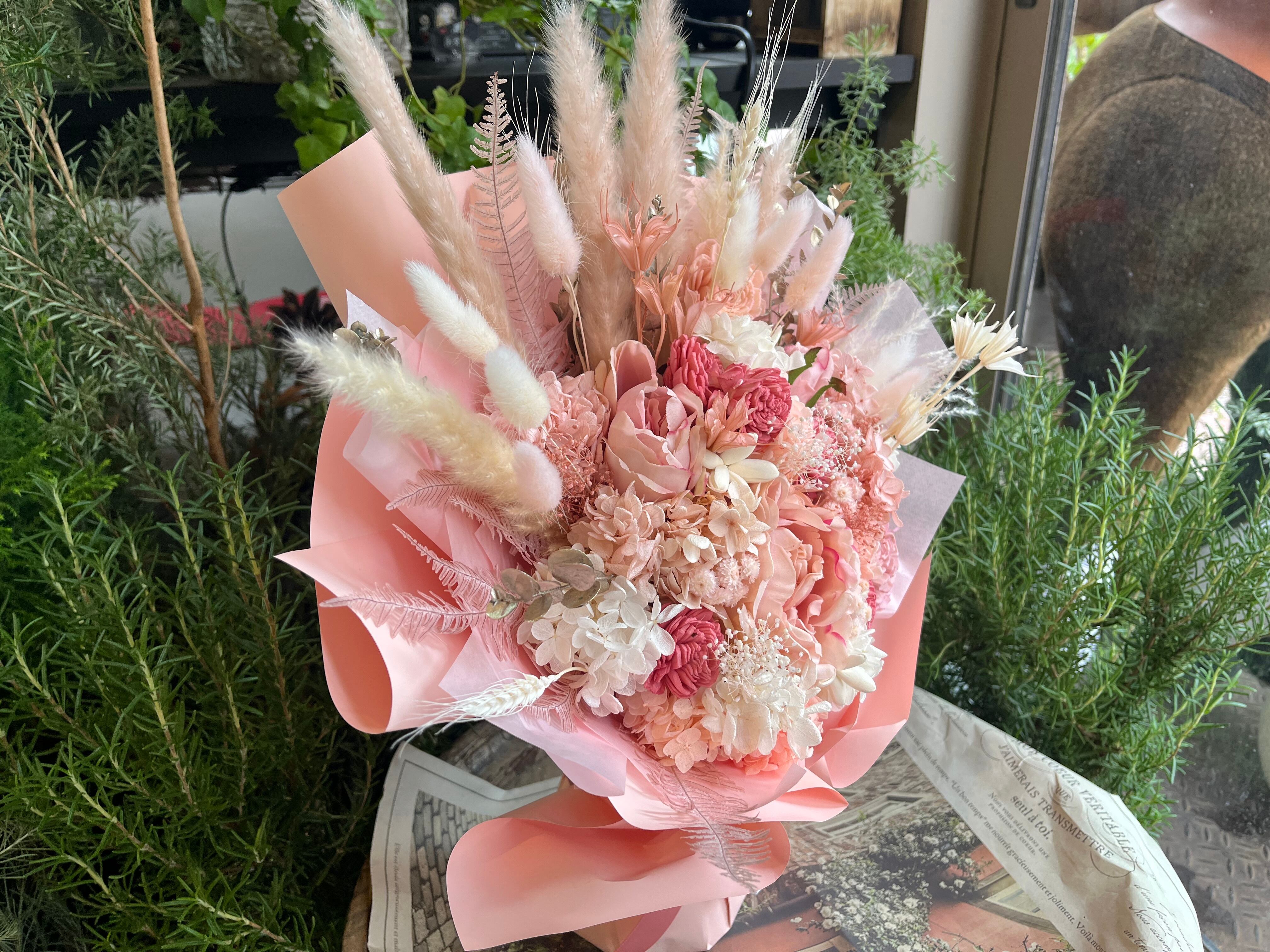 プリザーブドフラワー:あじさい、ラグラス、かすみそう、麦、ユーカリ、山シダ 等