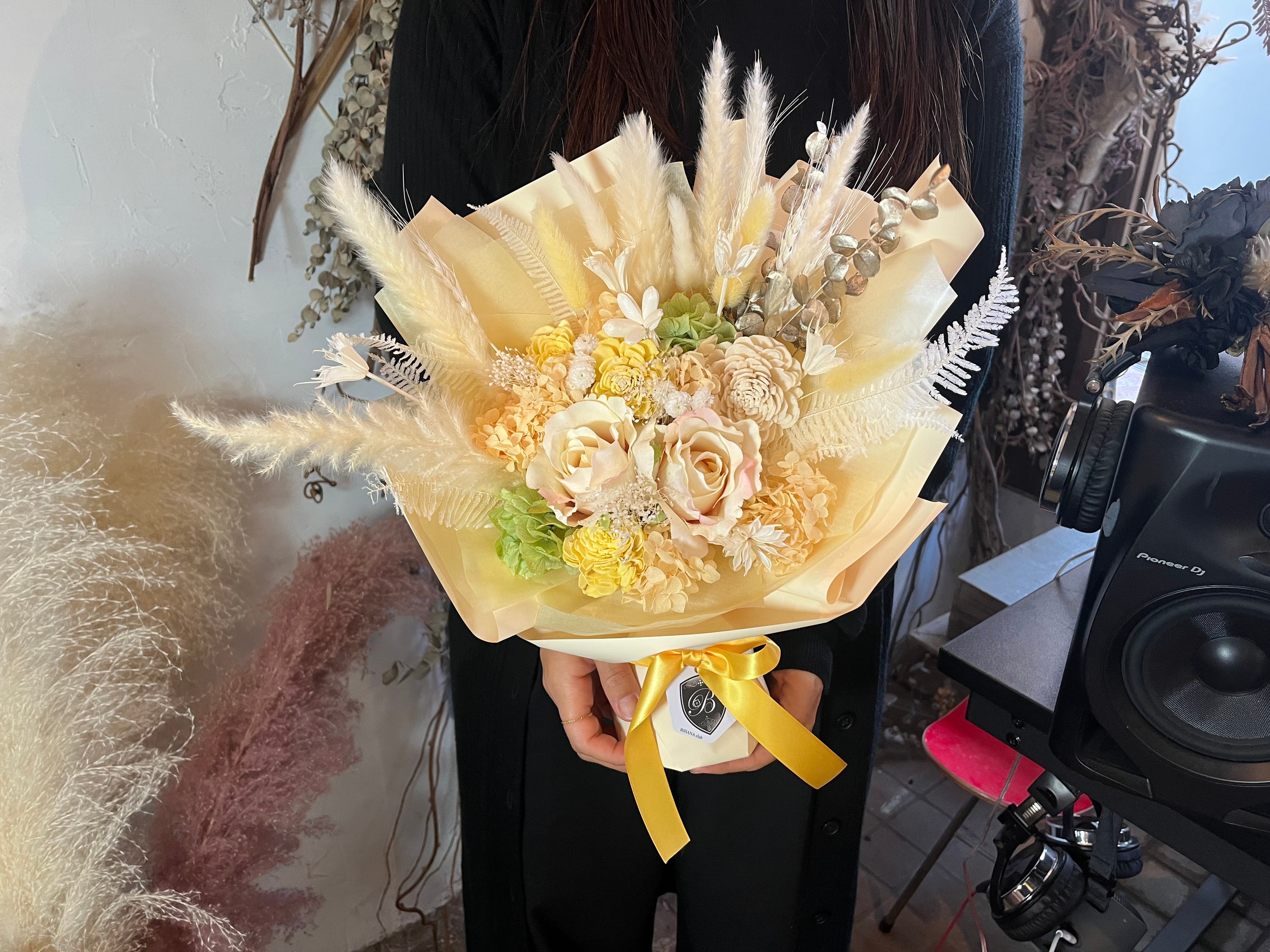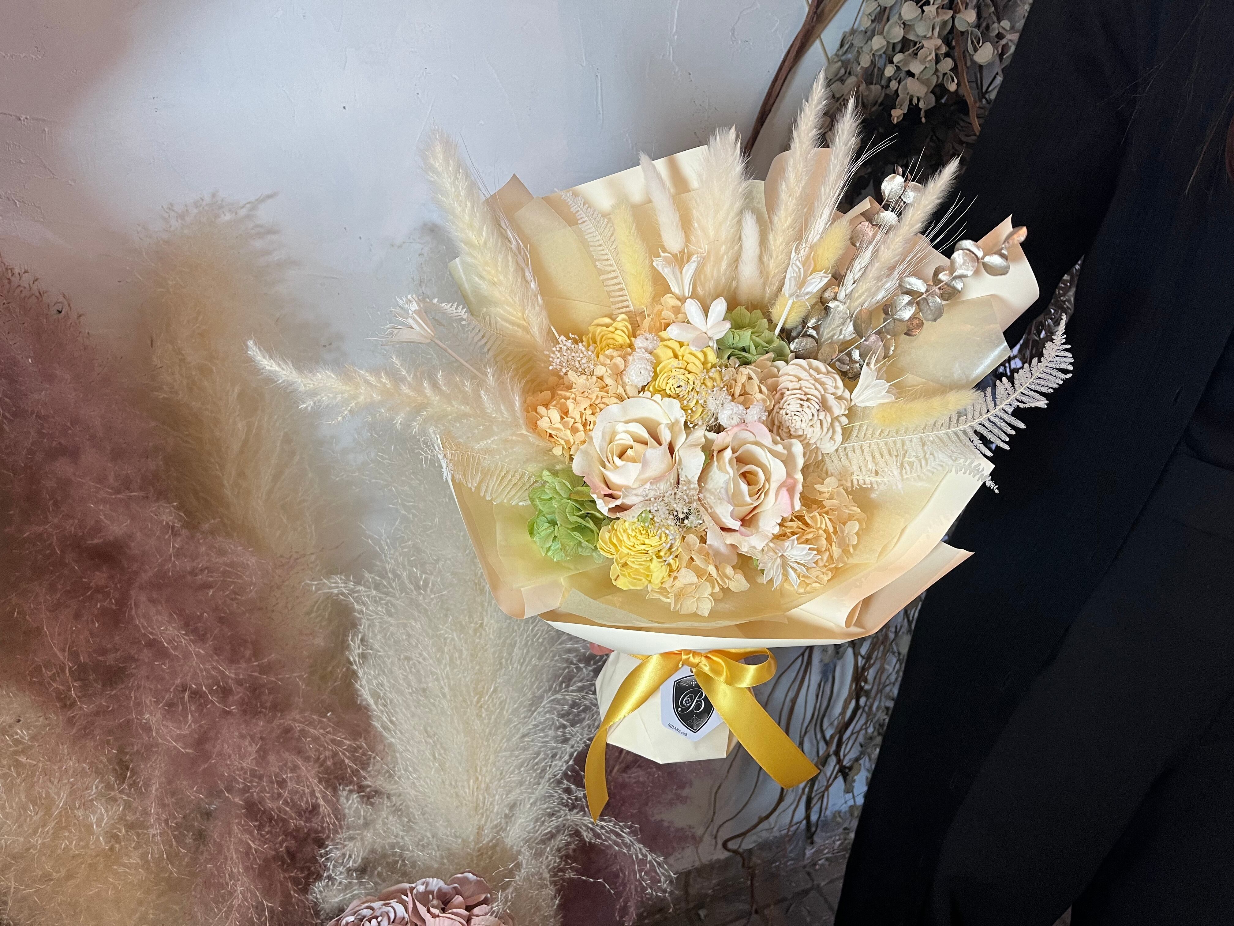 自立型の花束なので花瓶不要、水やりもいらず長く美しさを楽しめます。