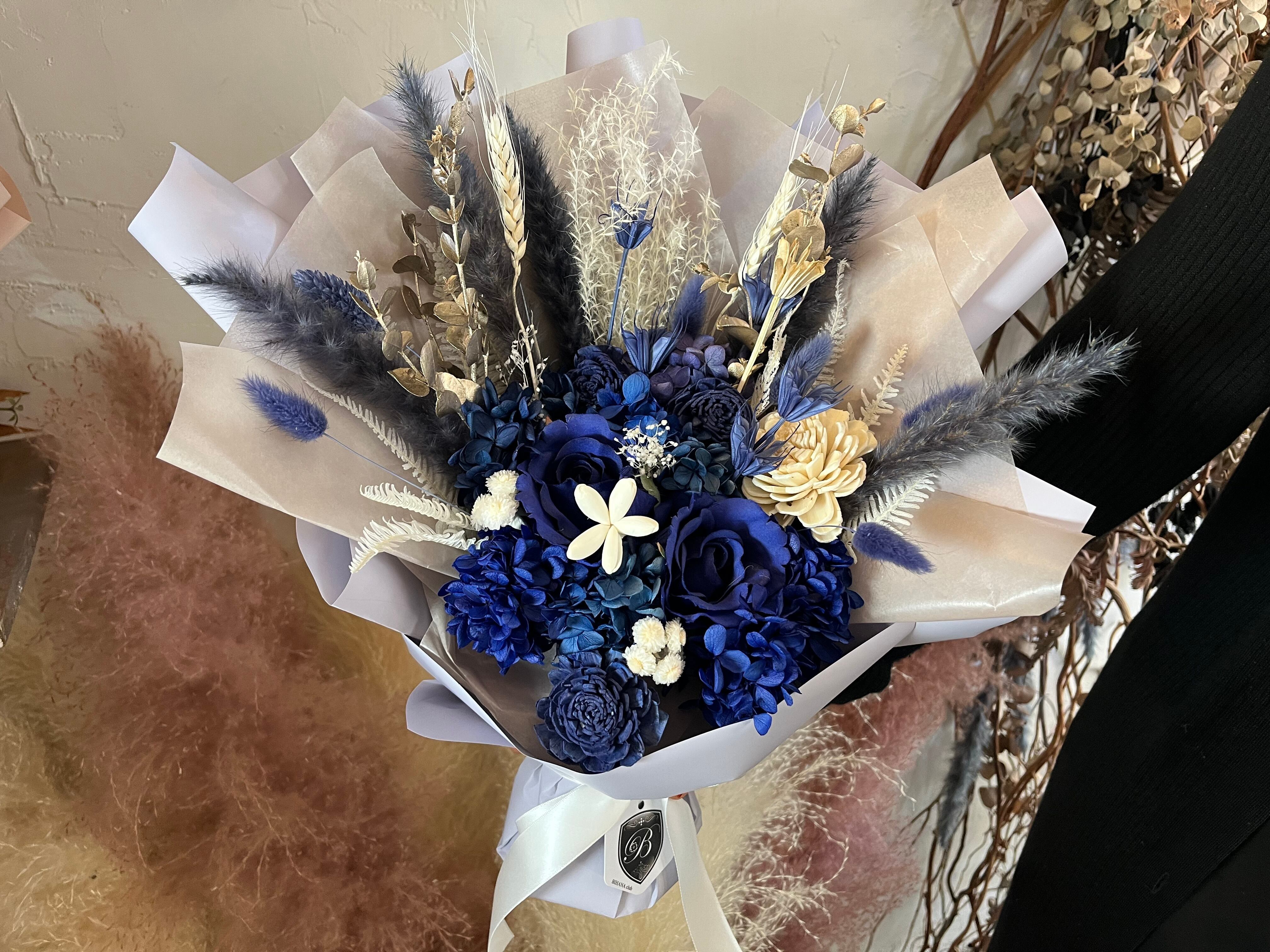 深みのあるブルーが印象的な、プリザーブドフラワーのスタンディングブーケです。