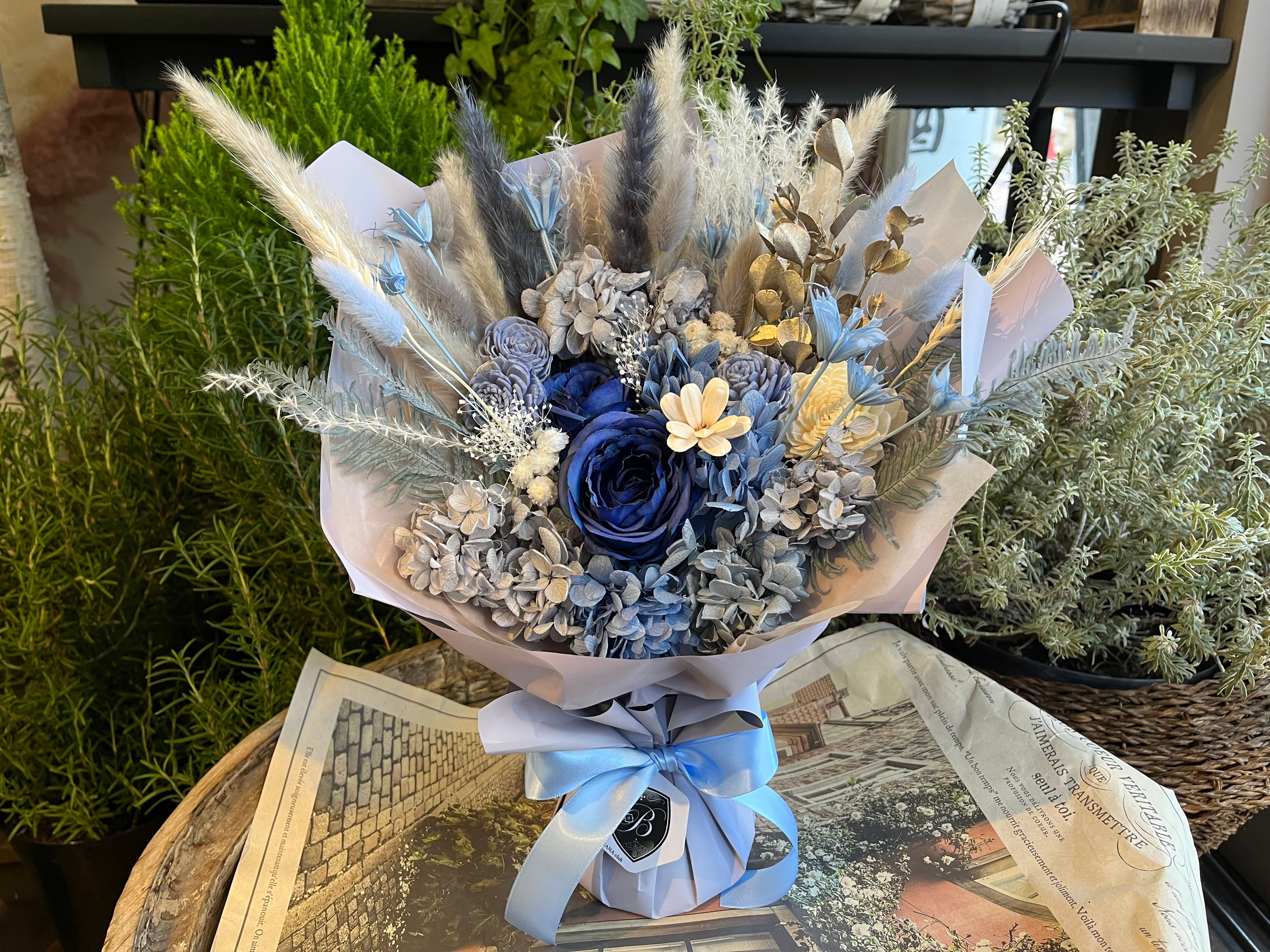 「冬の早朝の空」と「静かな知性の輝き」を束ねて。 プリザーブドフラワー スタンディングブーケ アイスブルーグラデーション|美花倶楽部 BiHANA Club(Hanayue) | 美花倶楽部 BiHANA Club (Hanayue)
