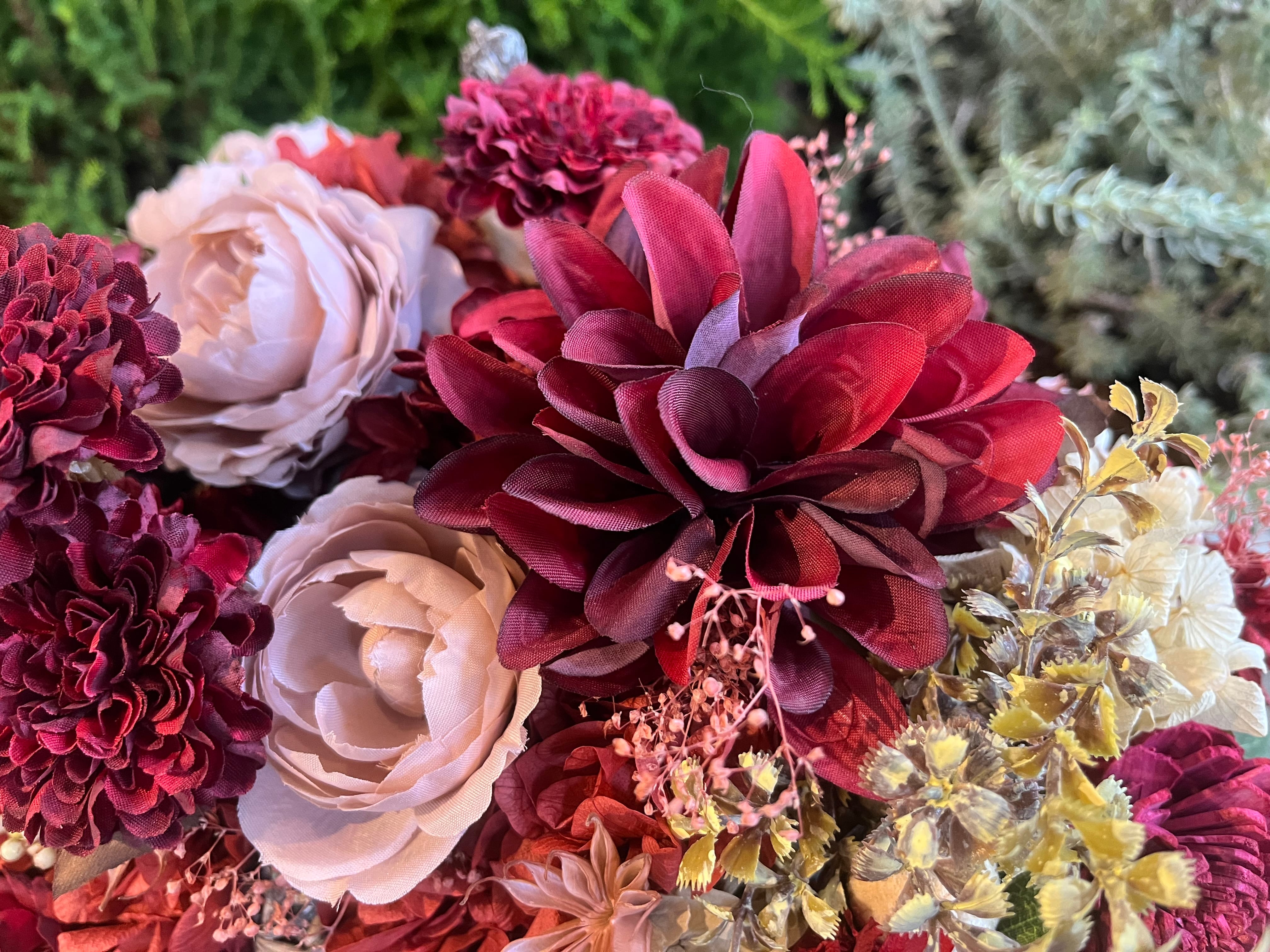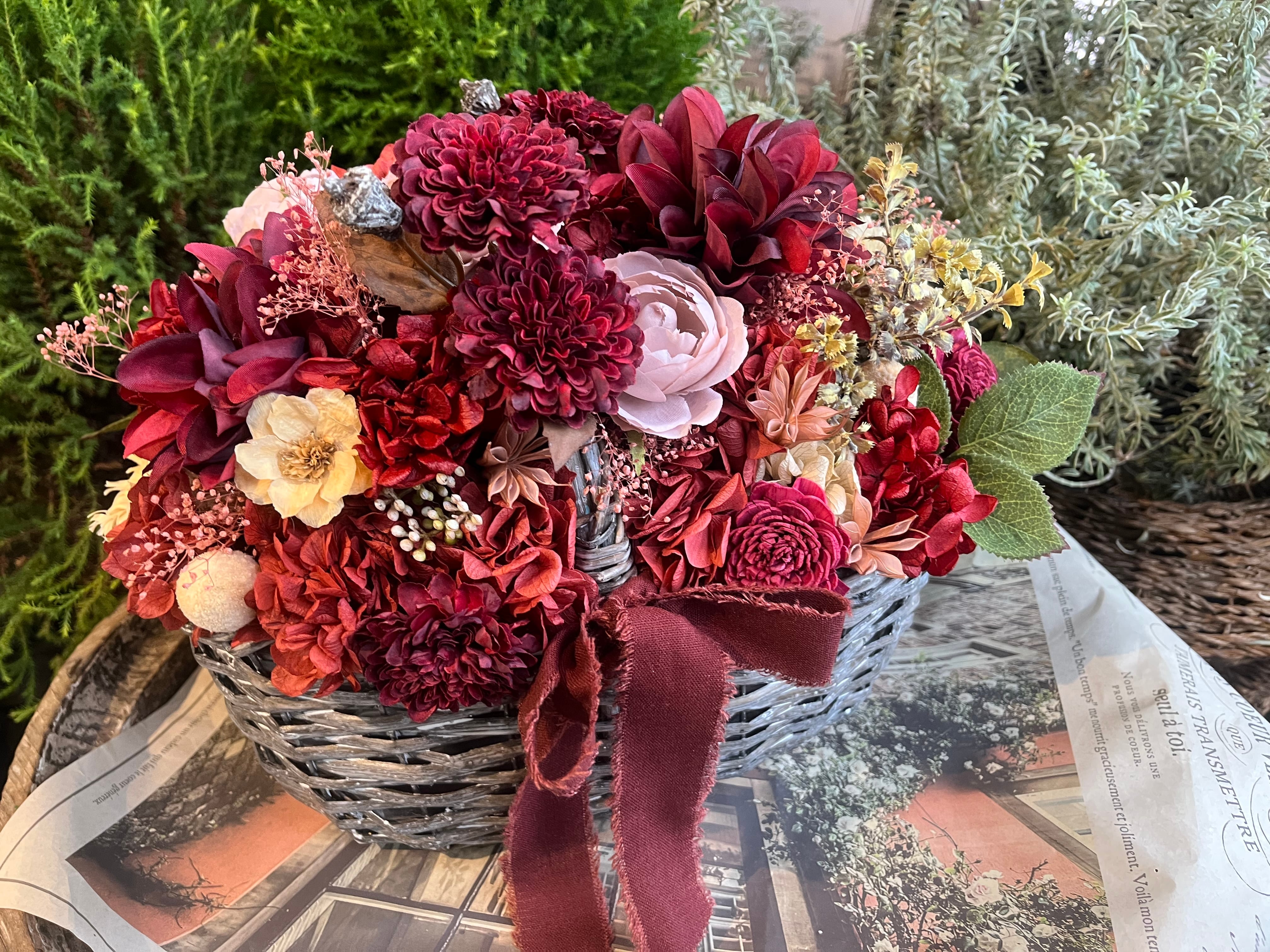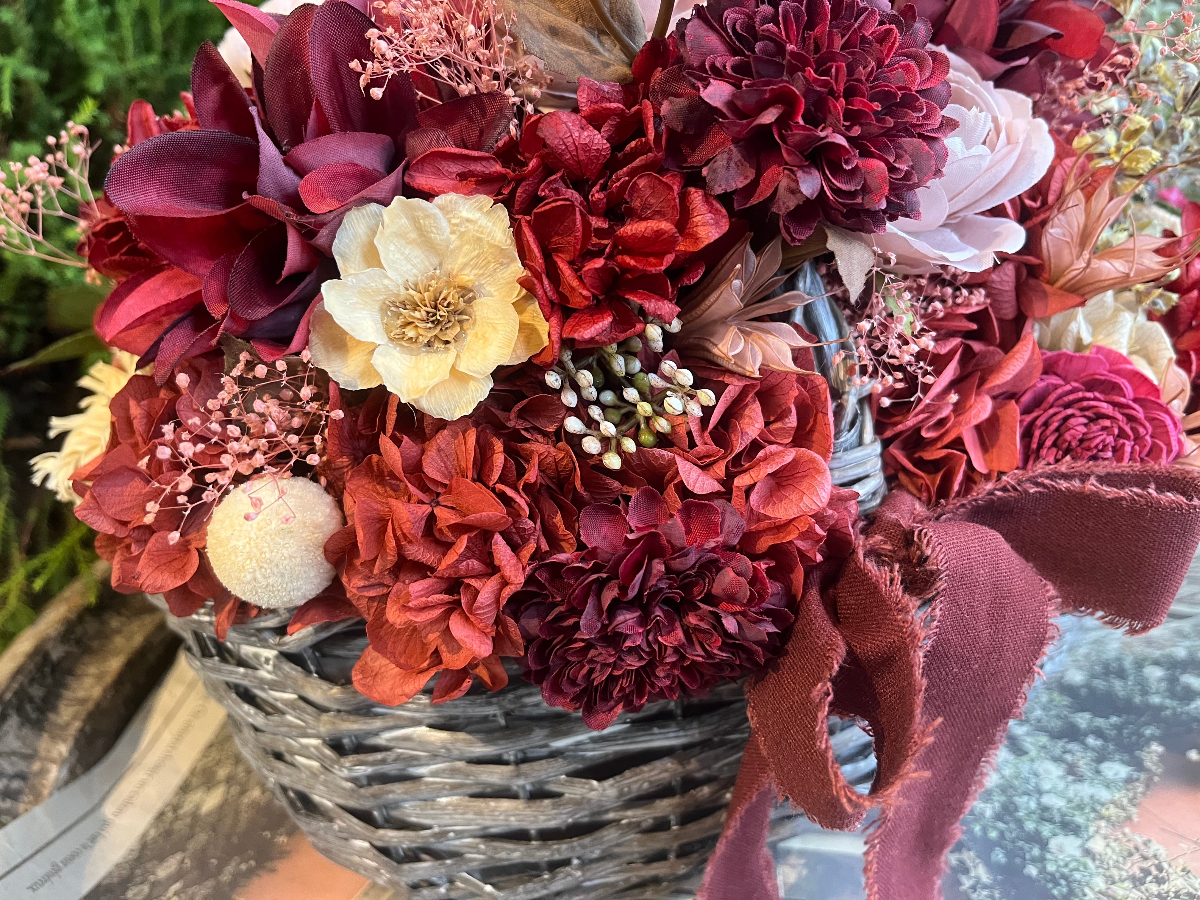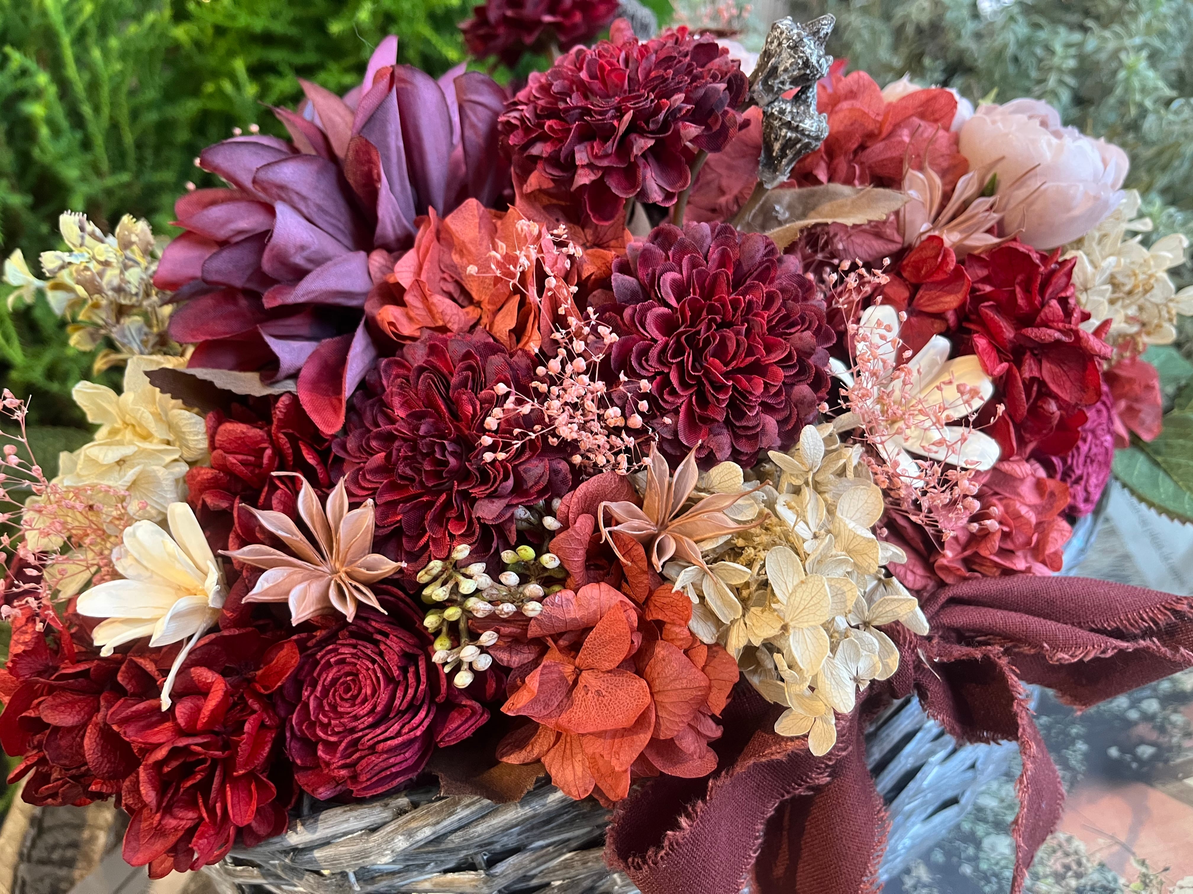厳選された花材:あじさい、ラグラス、かすみそうなどのプリザーブドフラワーに加え、木の皮から作られたソーラーローズや、生花のような美しさを持つ高級造花(薔薇)を厳選し、贅沢に使用しています。