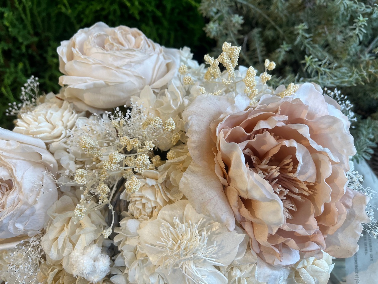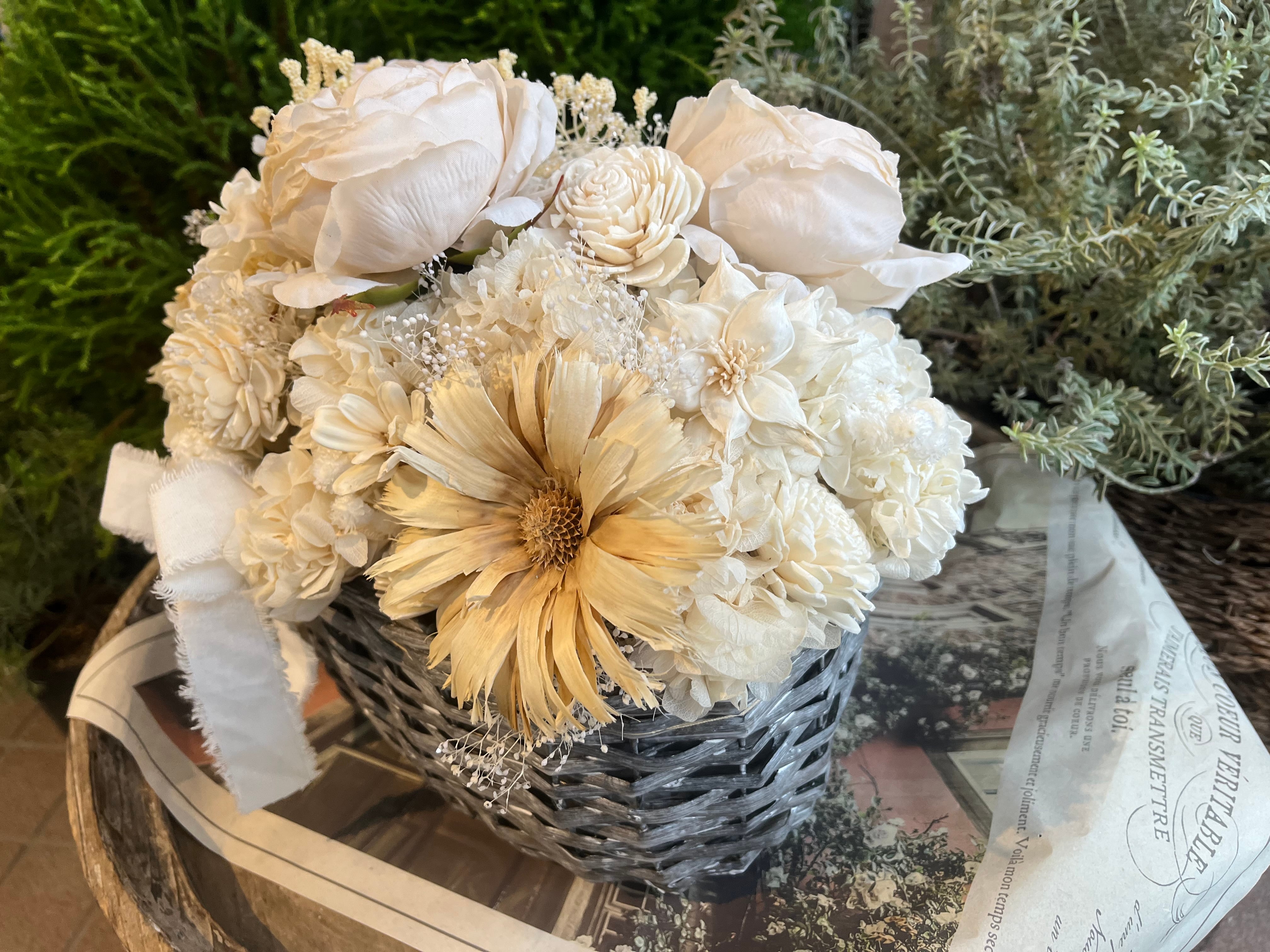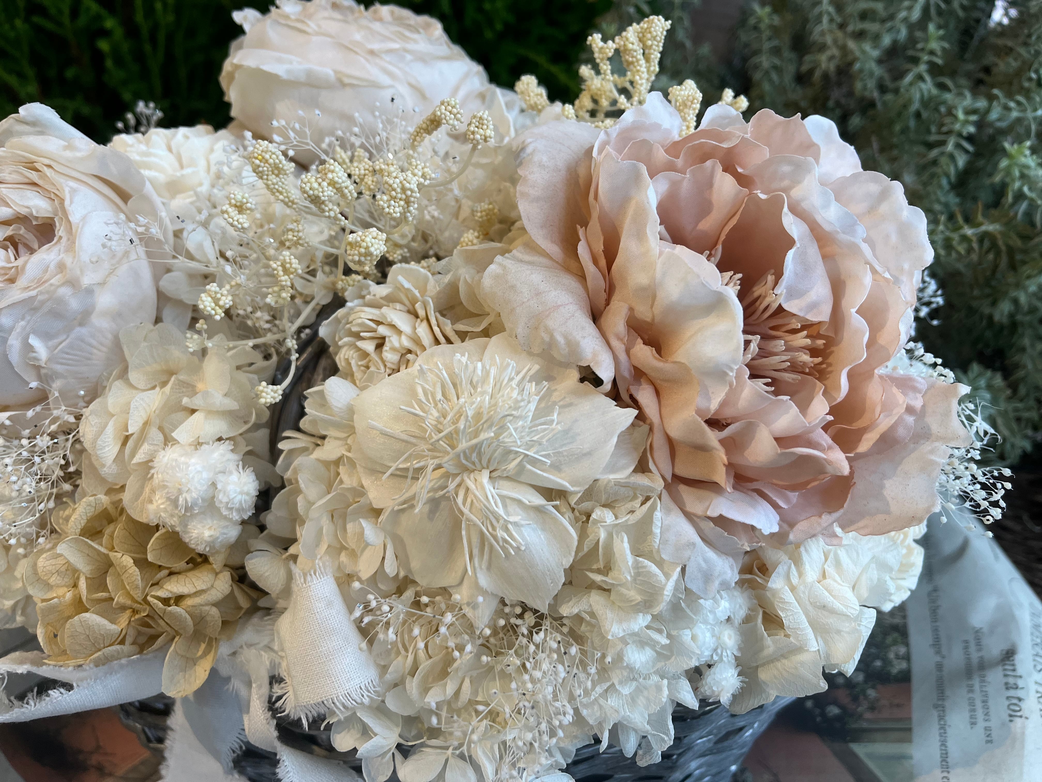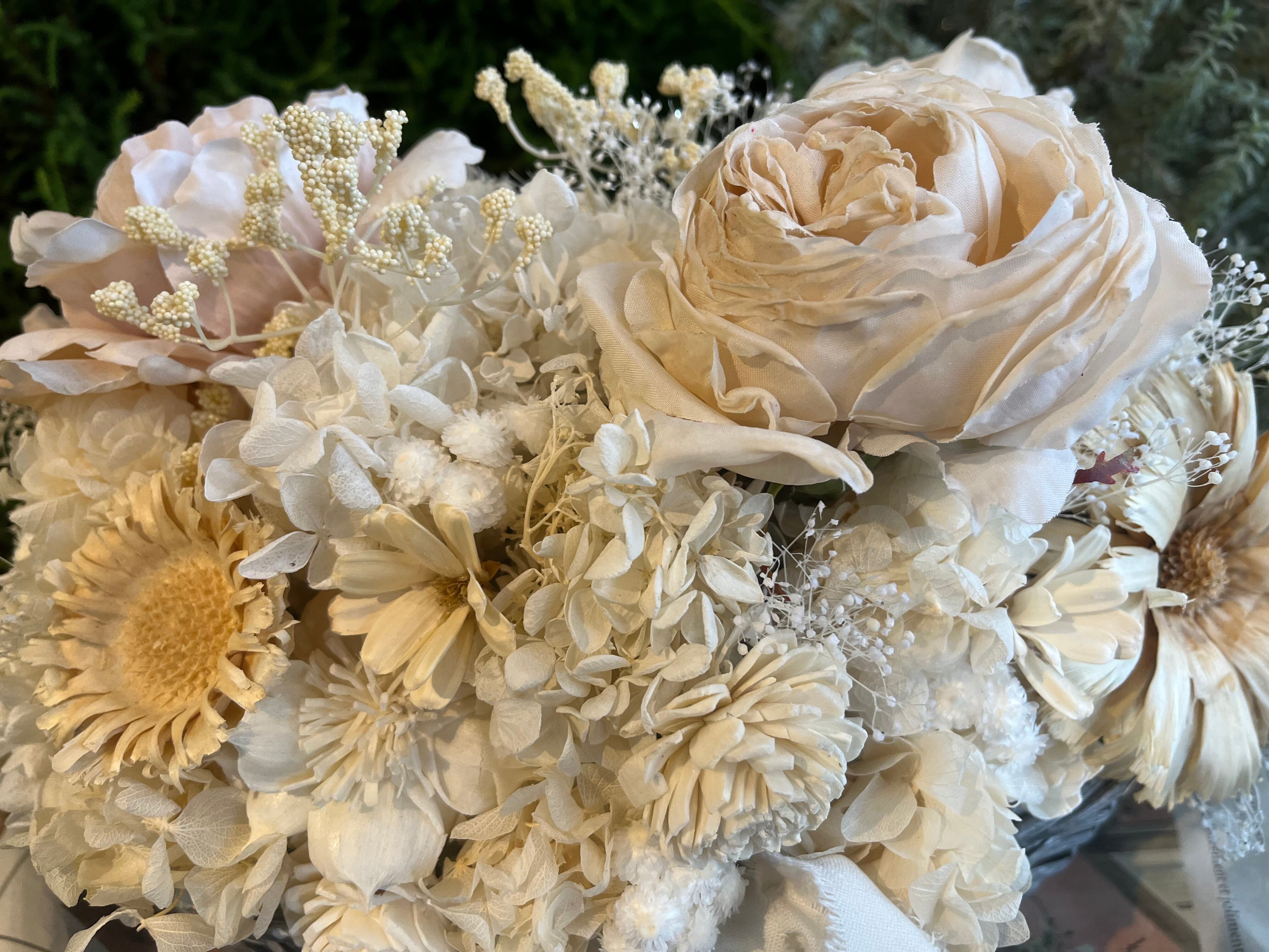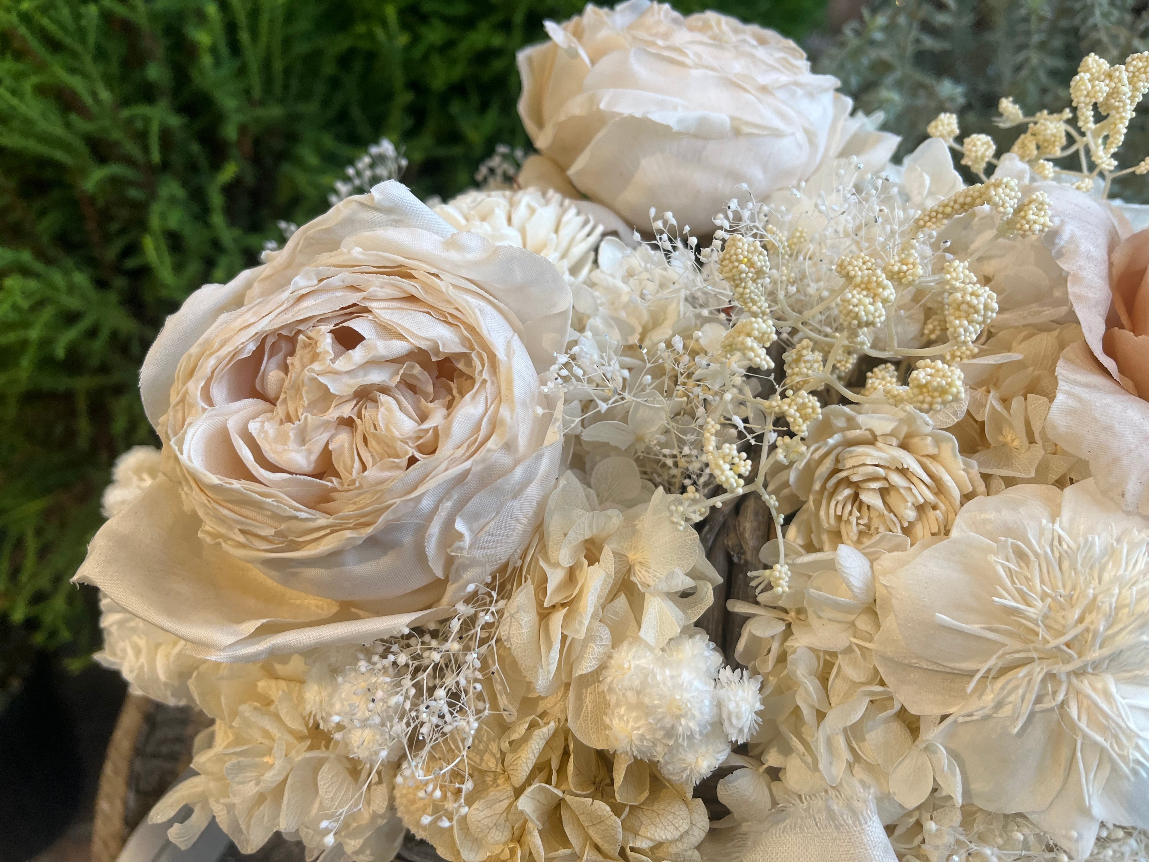 厳選された花材:あじさい、ラグラス、かすみそうなどのプリザーブドフラワーに加え、木の皮から作られたソーラーローズや、生花のような美しさを持つ高級造花(薔薇)を厳選し、贅沢に使用しています。