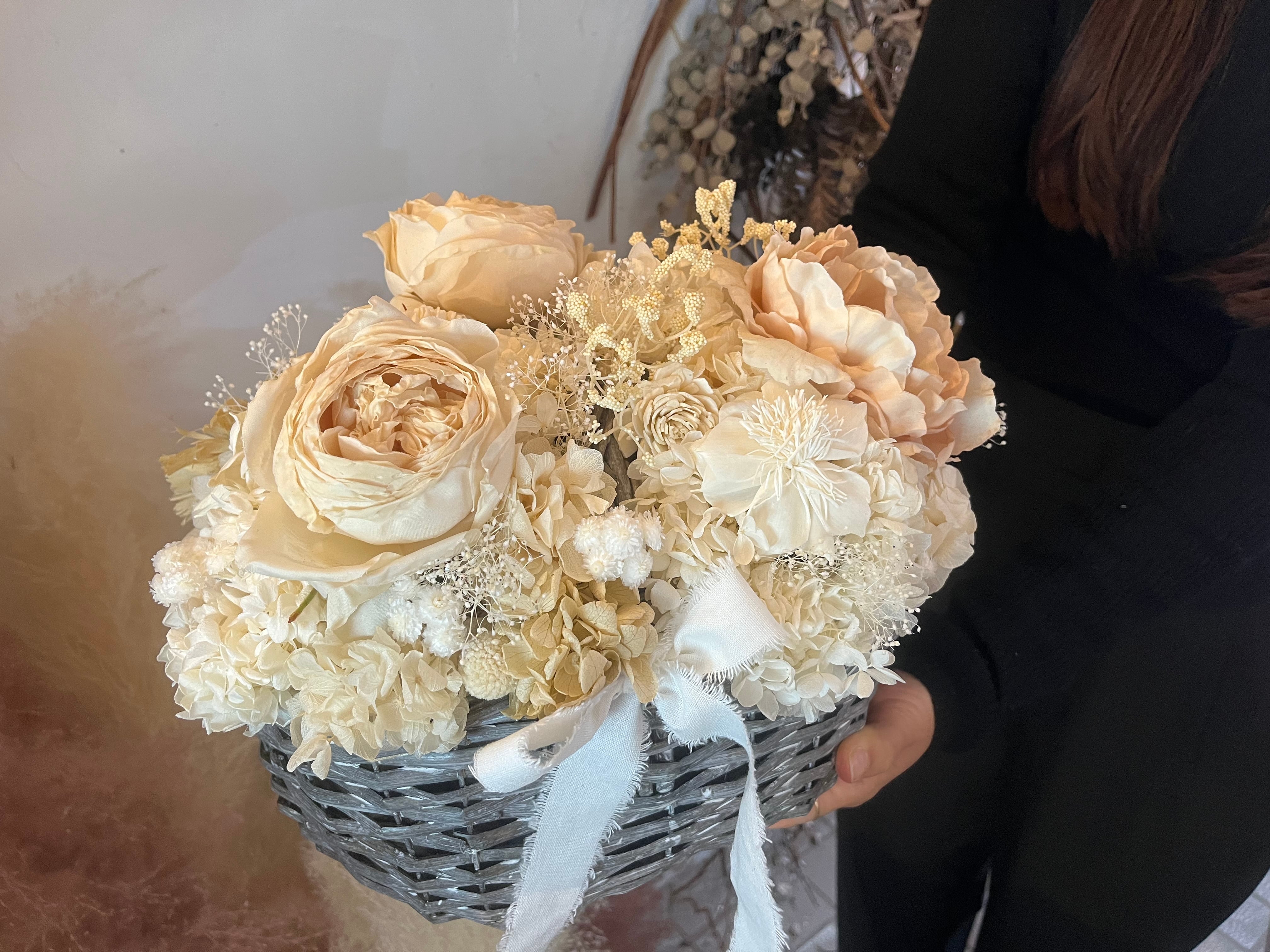 新宿ヒルトンホテル、南青山の花屋でのウェディング・ギフトフラワーなど、長年の現場経験で磨いた “色合わせ・質感・構成” の技術をそのままプリザーブドフラワーにも。