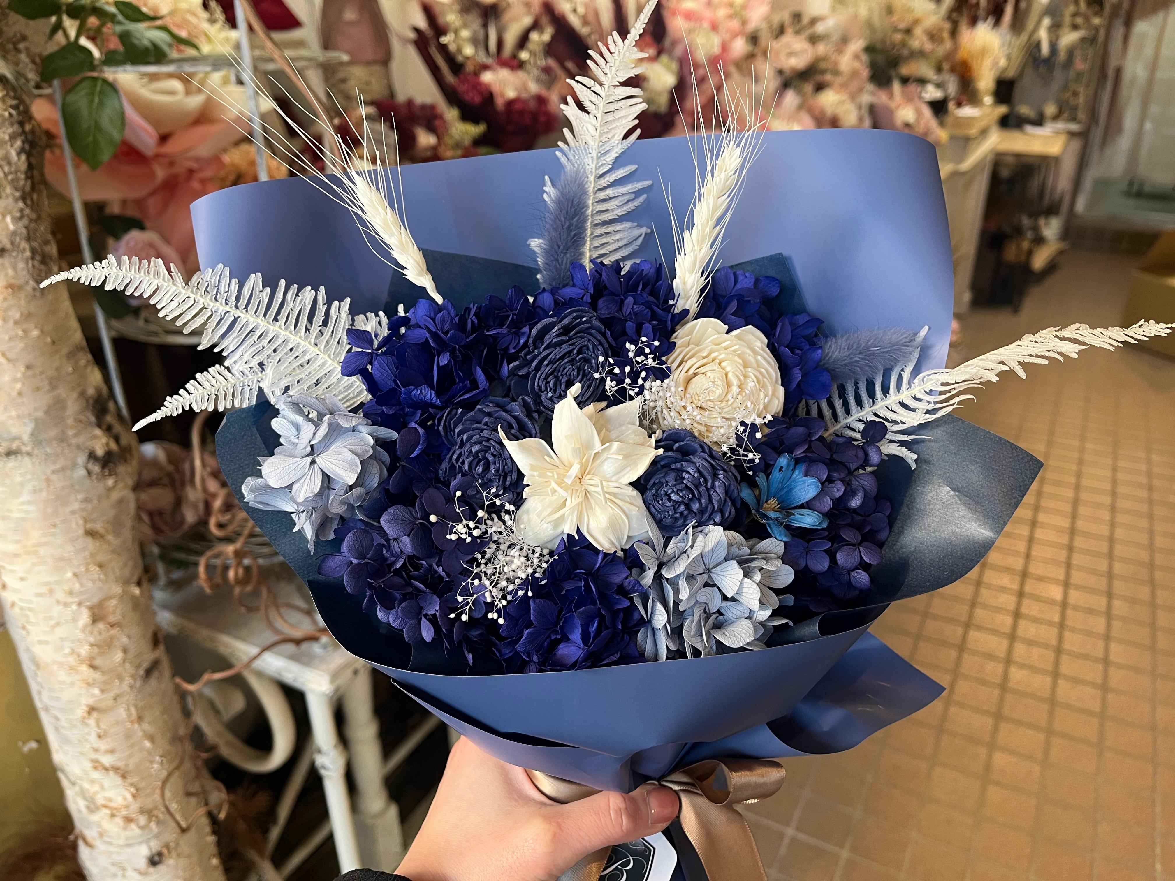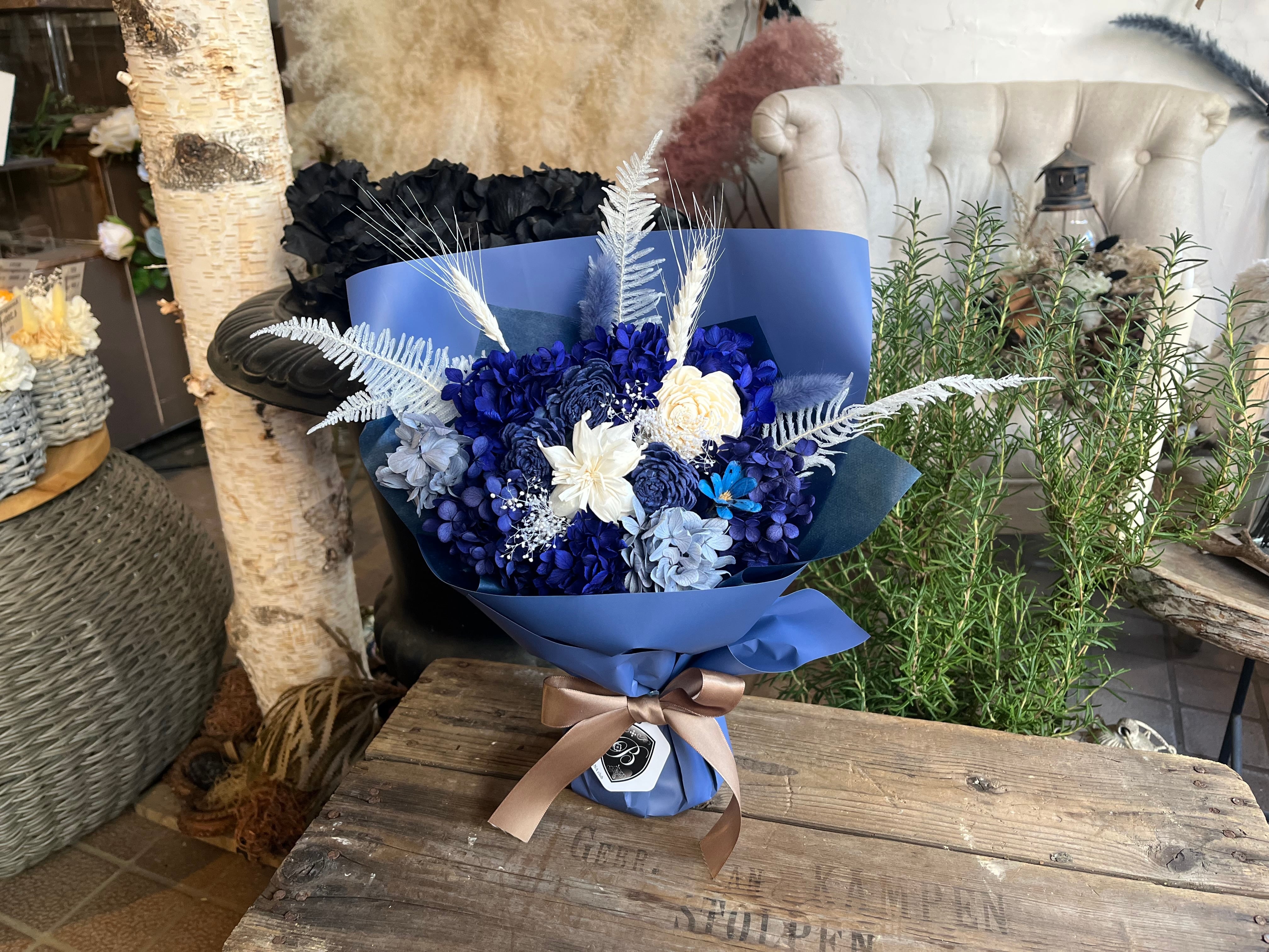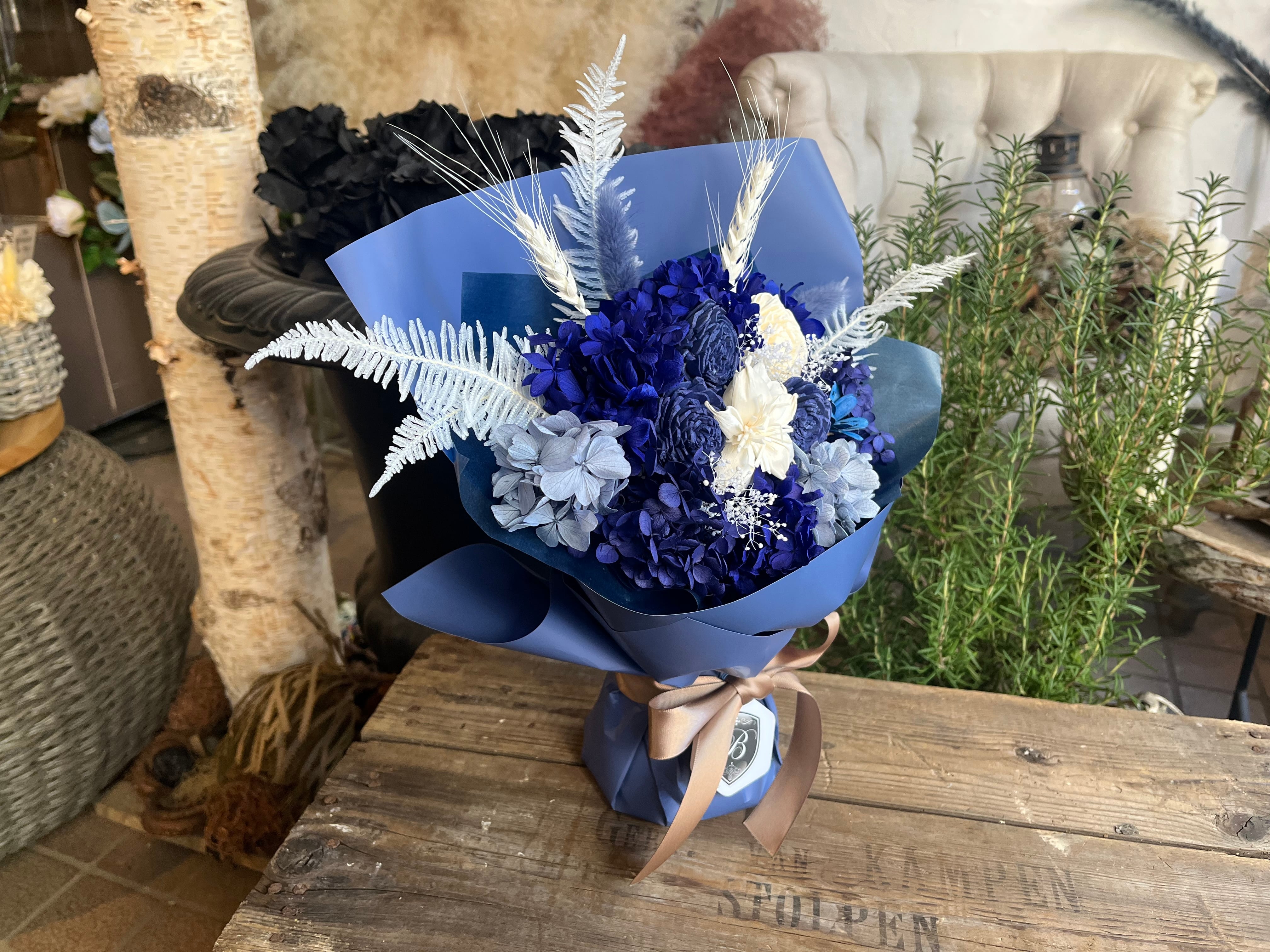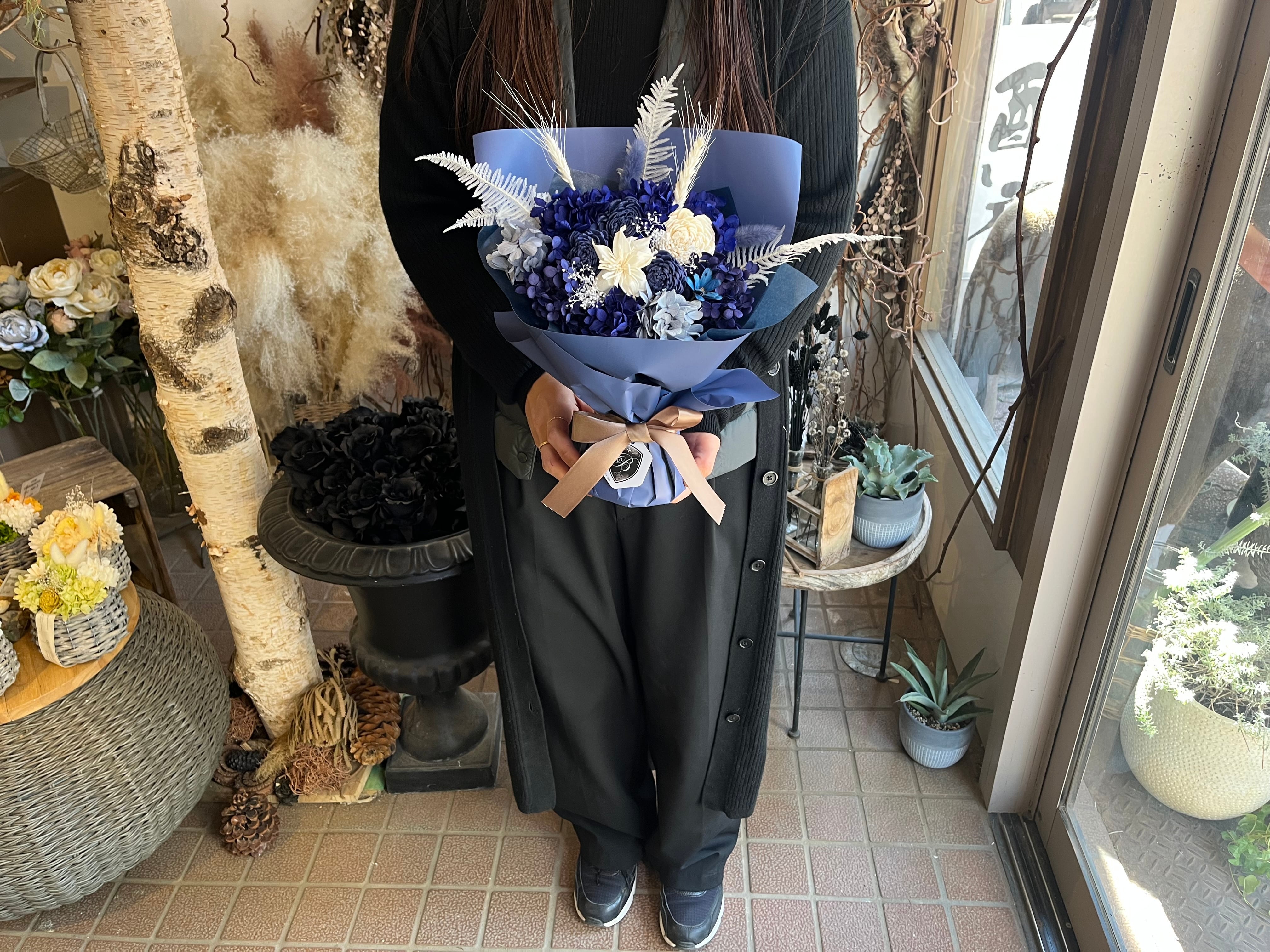 花瓶不要でそのまま飾れる プリザーブドフラワー花束|スタンディングブーケ ディープブルー Mサイズ|誕生日 退職 卒業 還暦祝い 送別ギフト