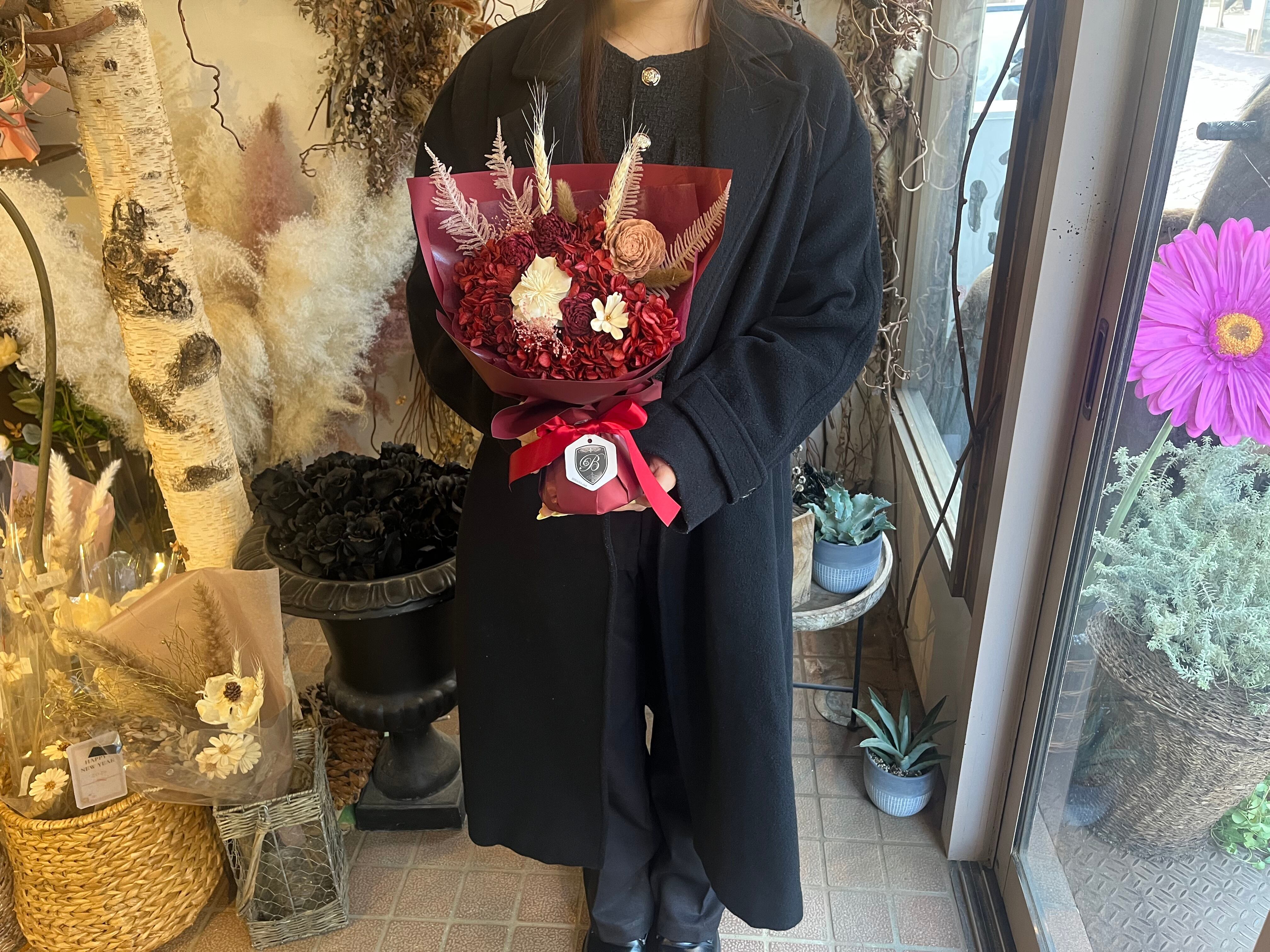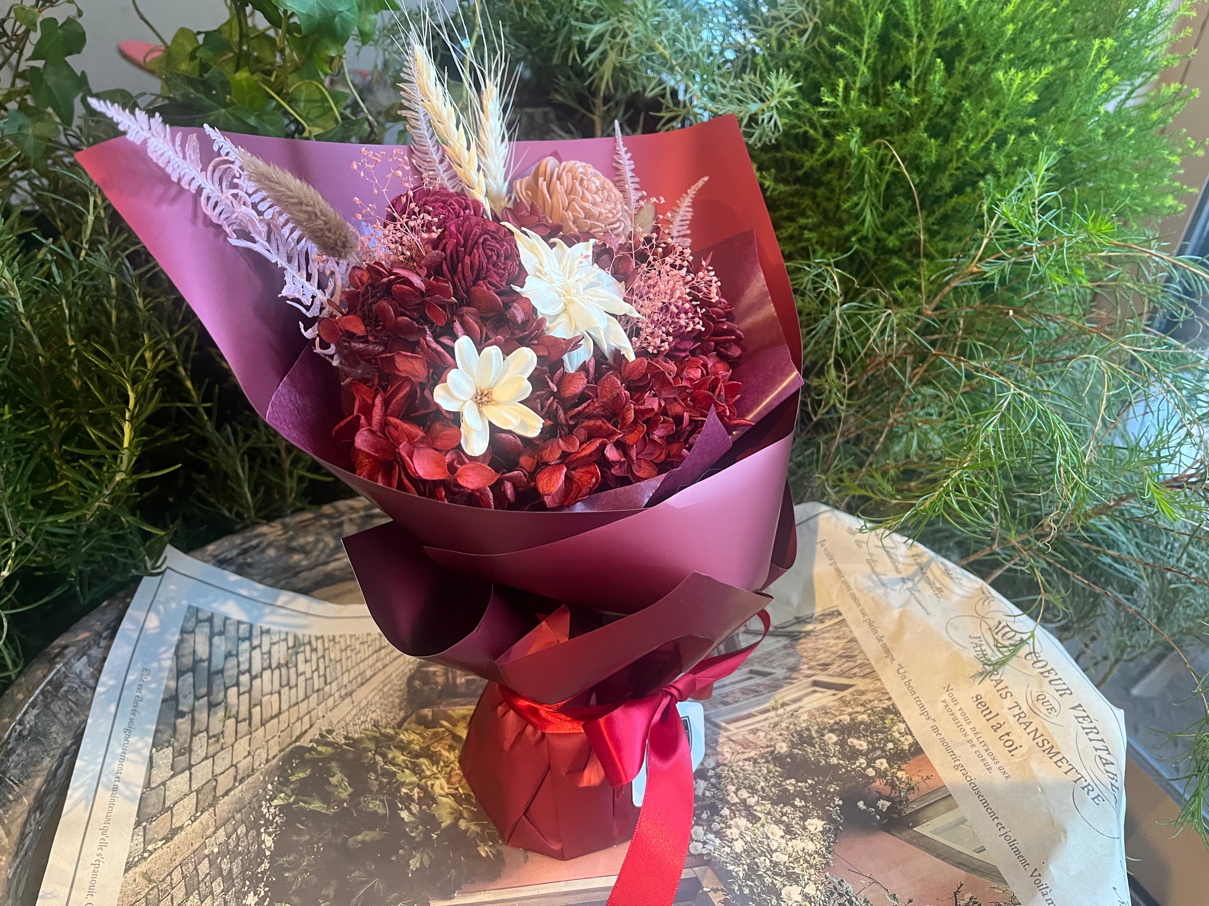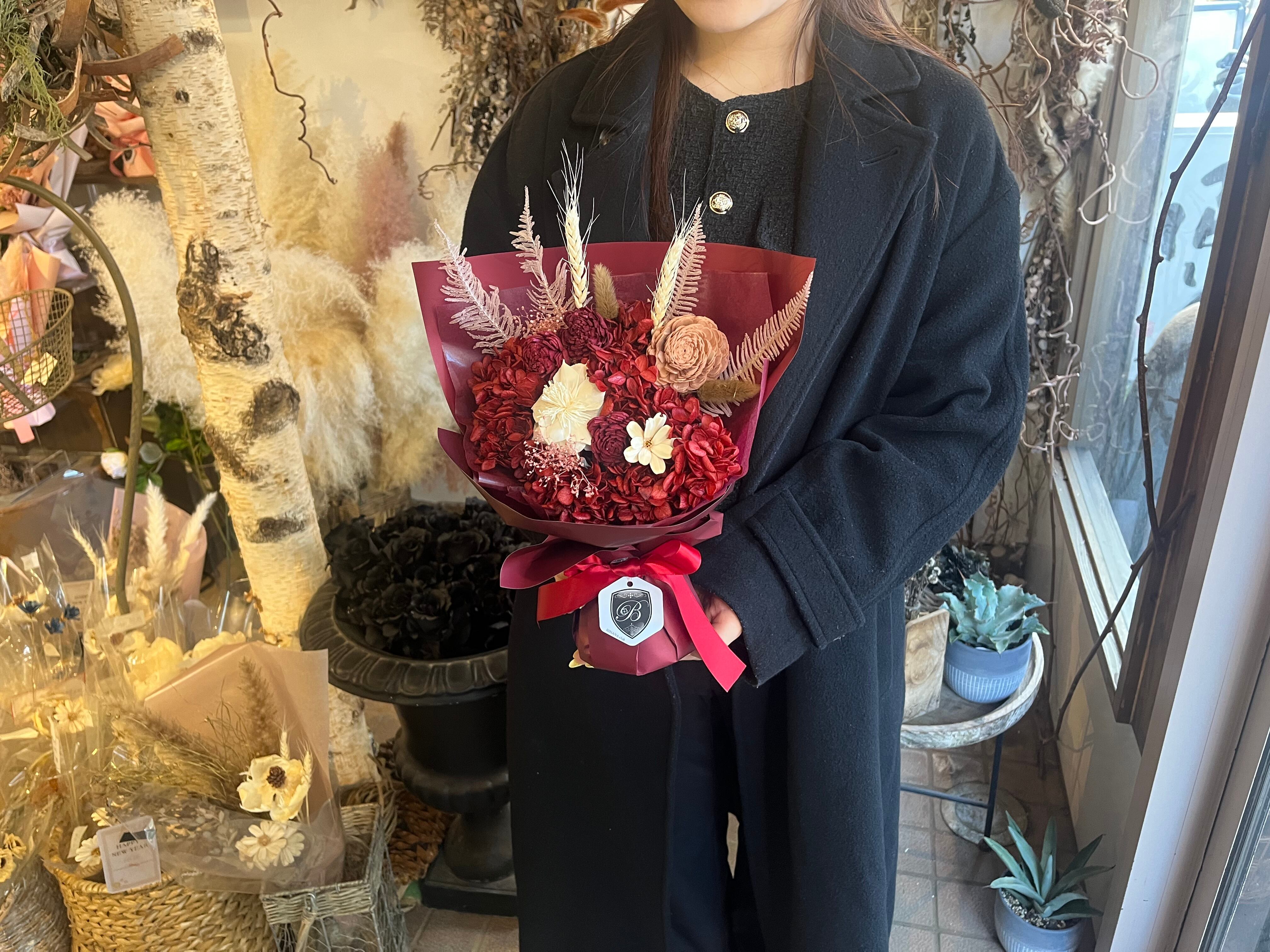 プリザーブドフラワー 花束 ギフト|スタンディングブーケ(自立型・花瓶不要)ワインレッド(M)