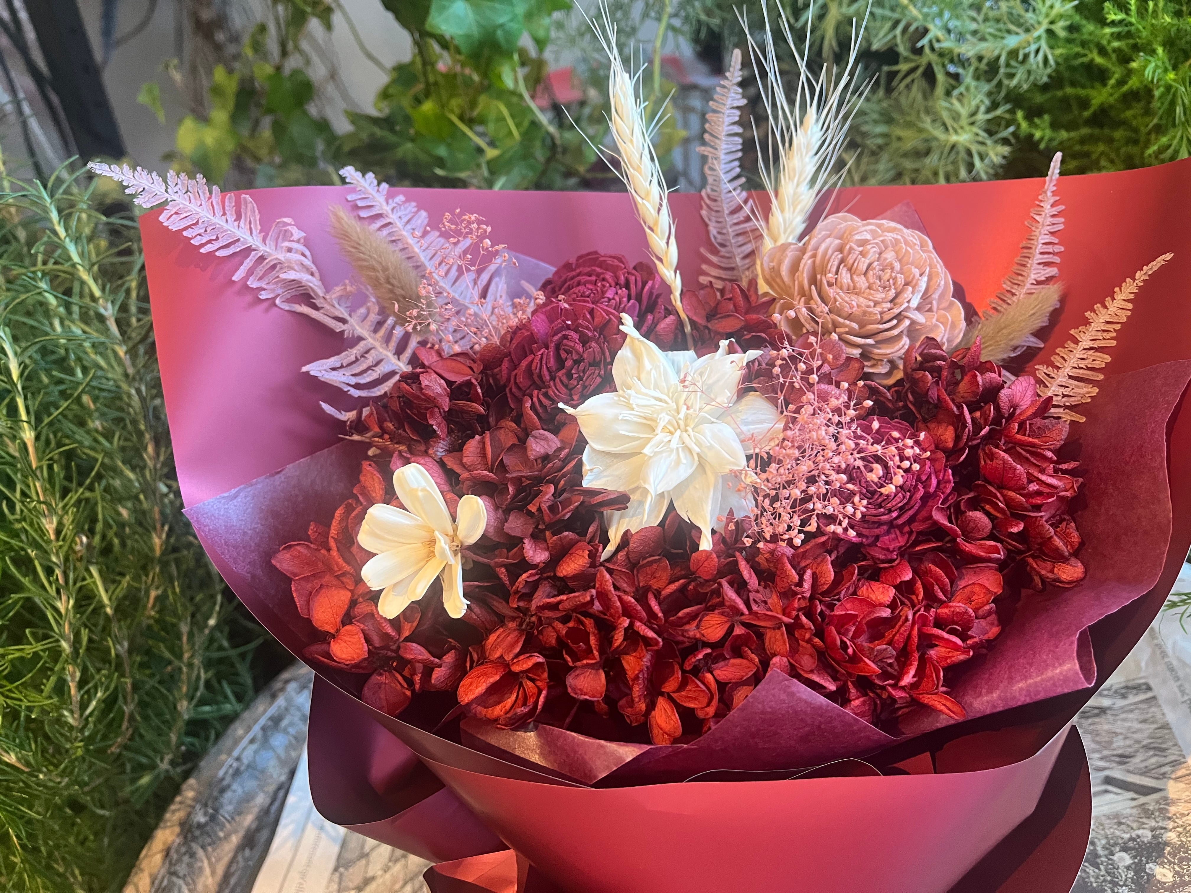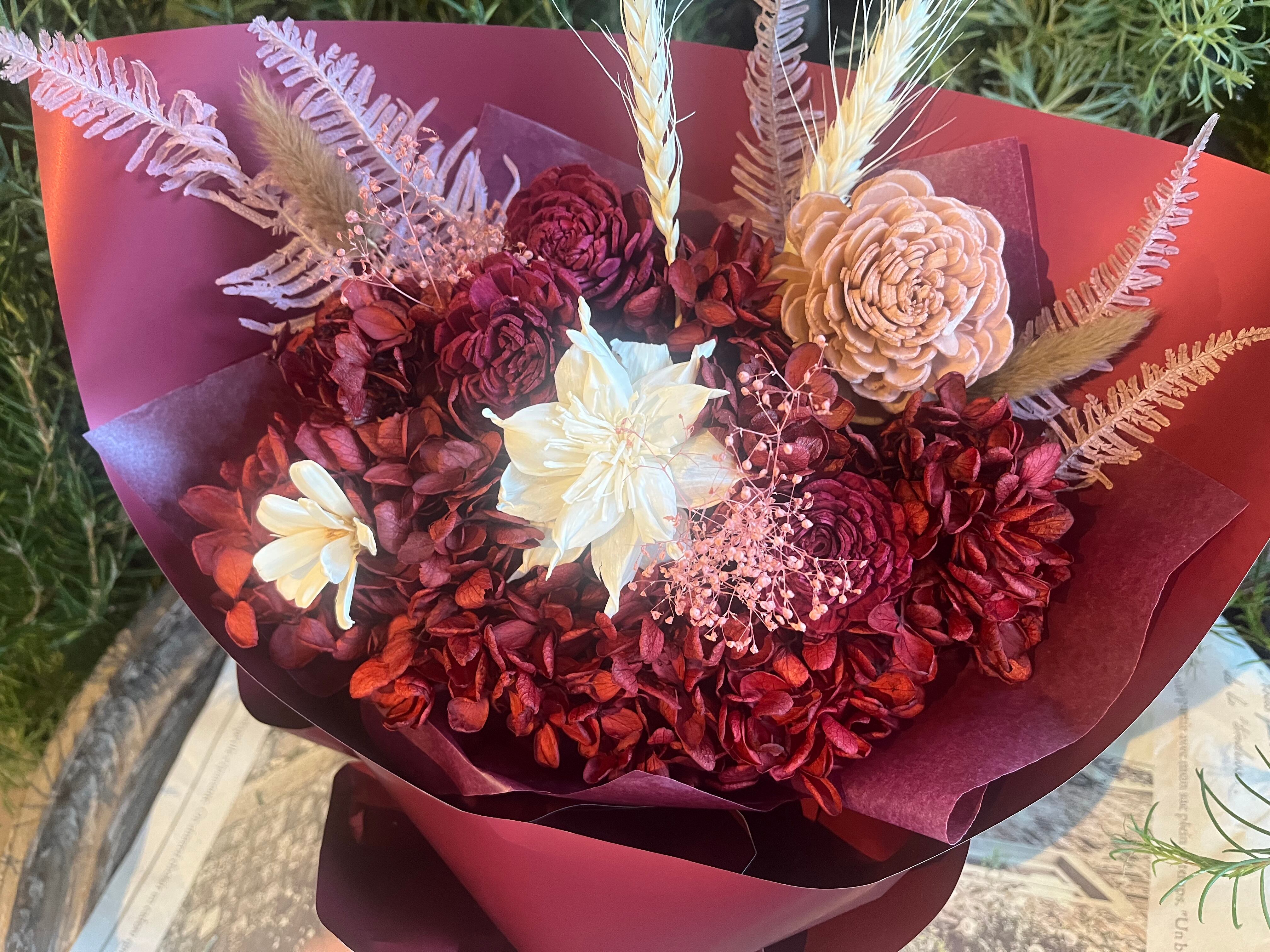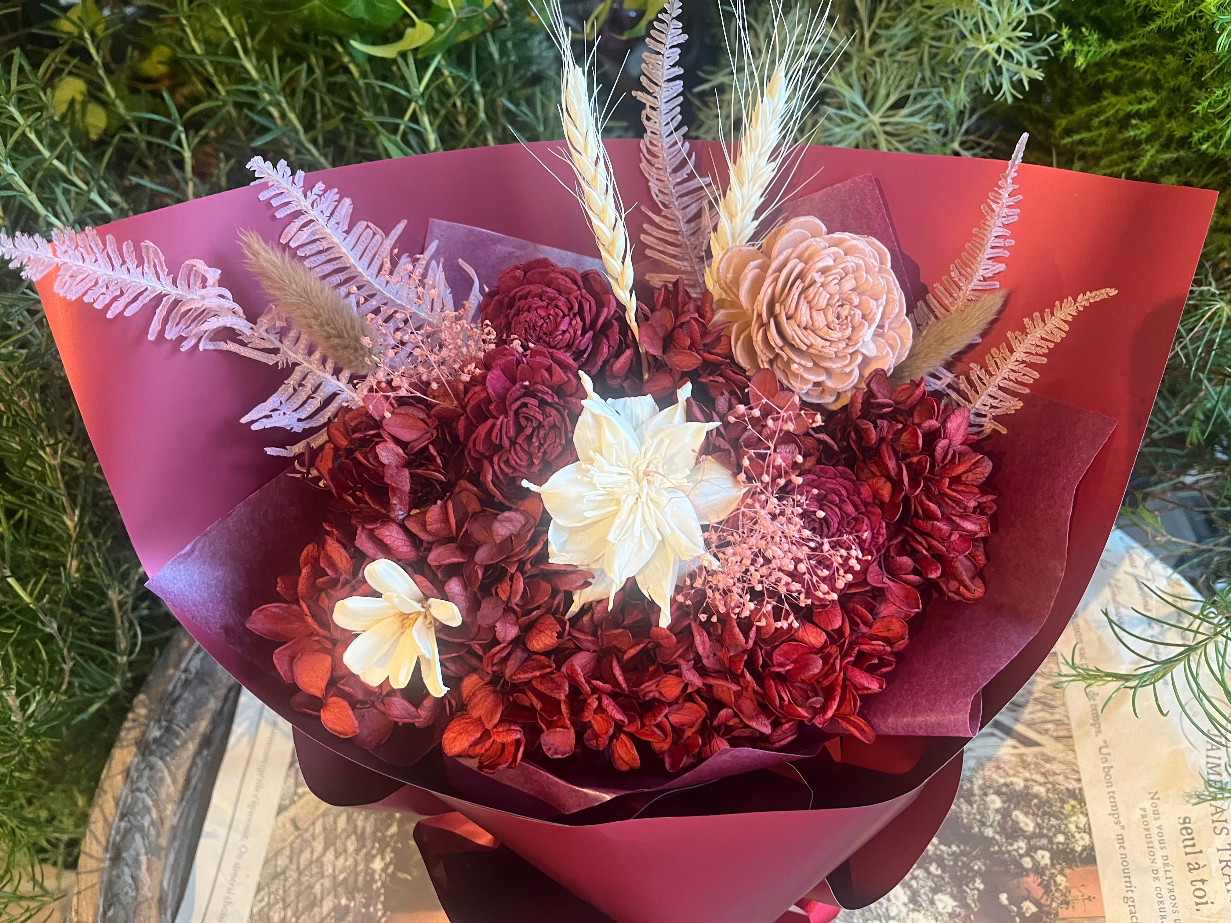 プリザーブドフラワー 花束 ギフト|スタンディングブーケ(自立型・花瓶不要)ワインレッド(M)