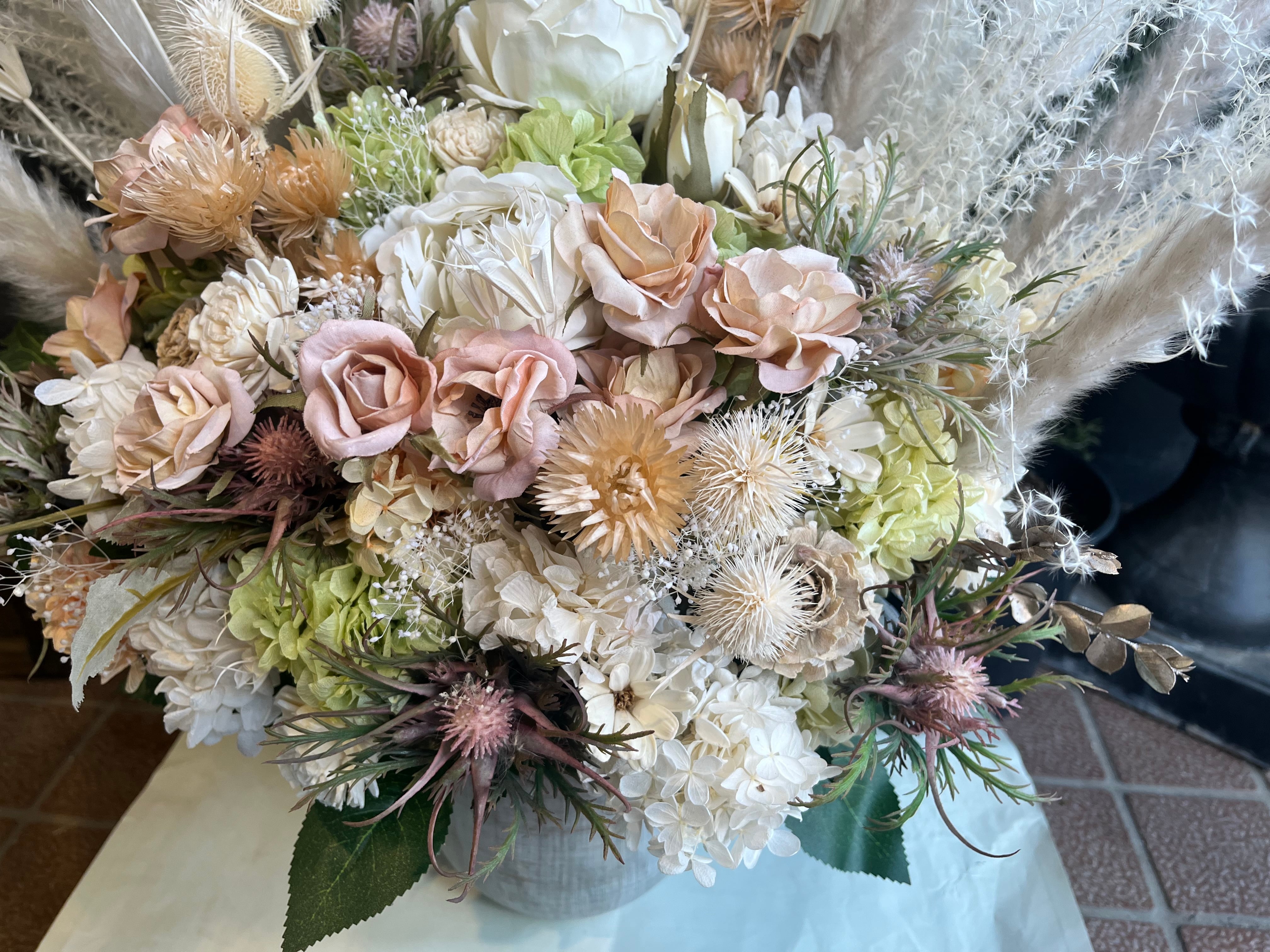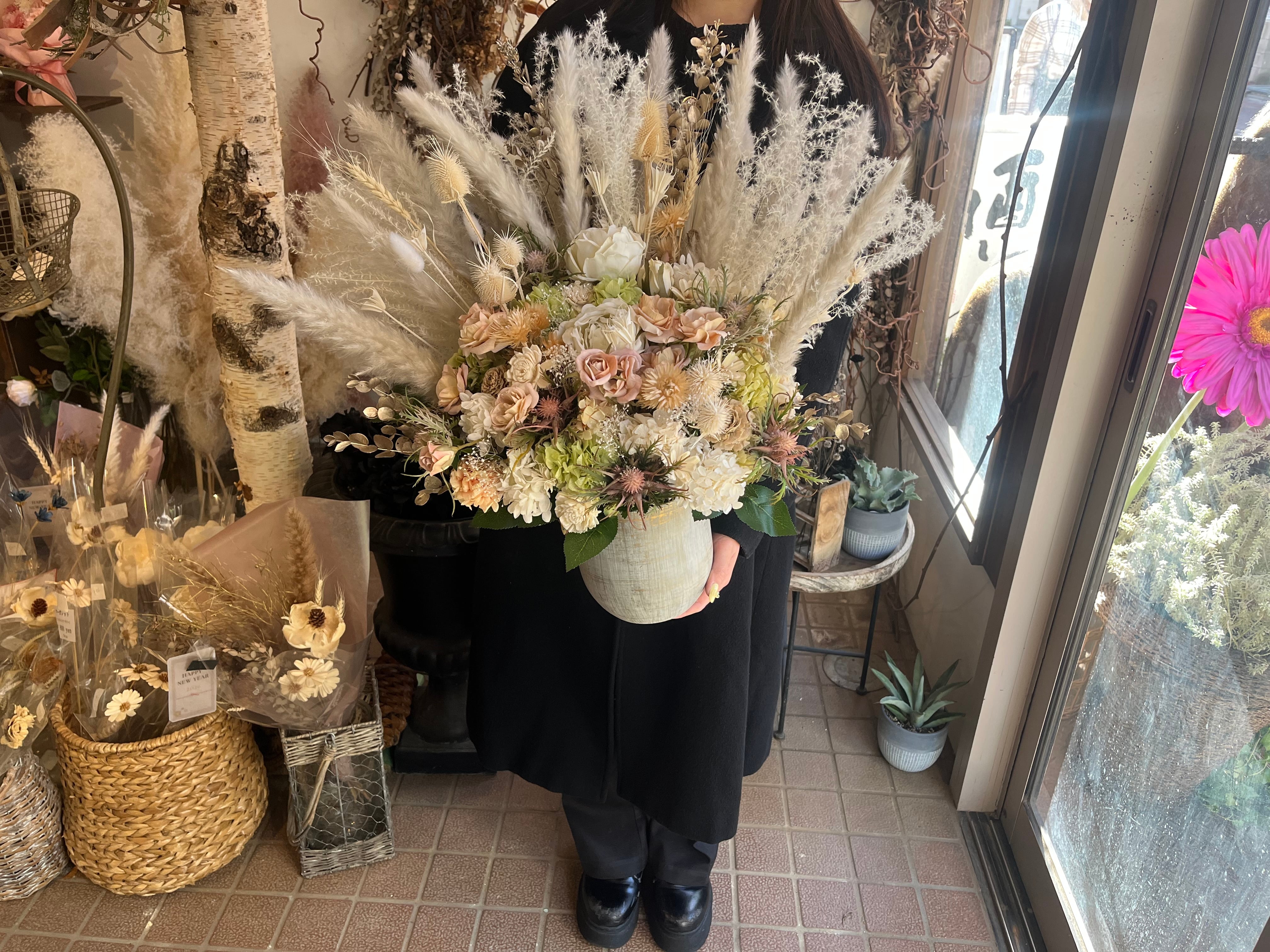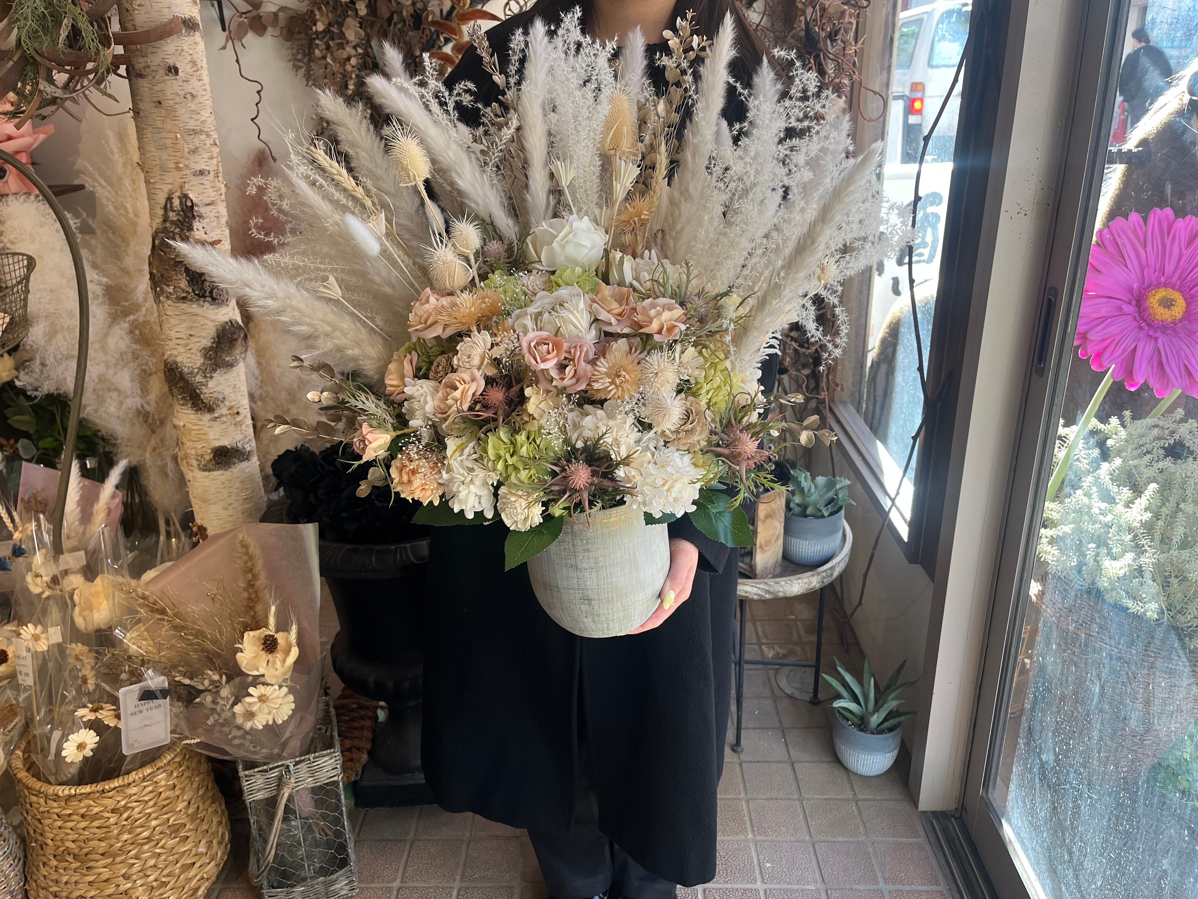 華やかで上品な大型プリザーブドフラワーアレンジメント。