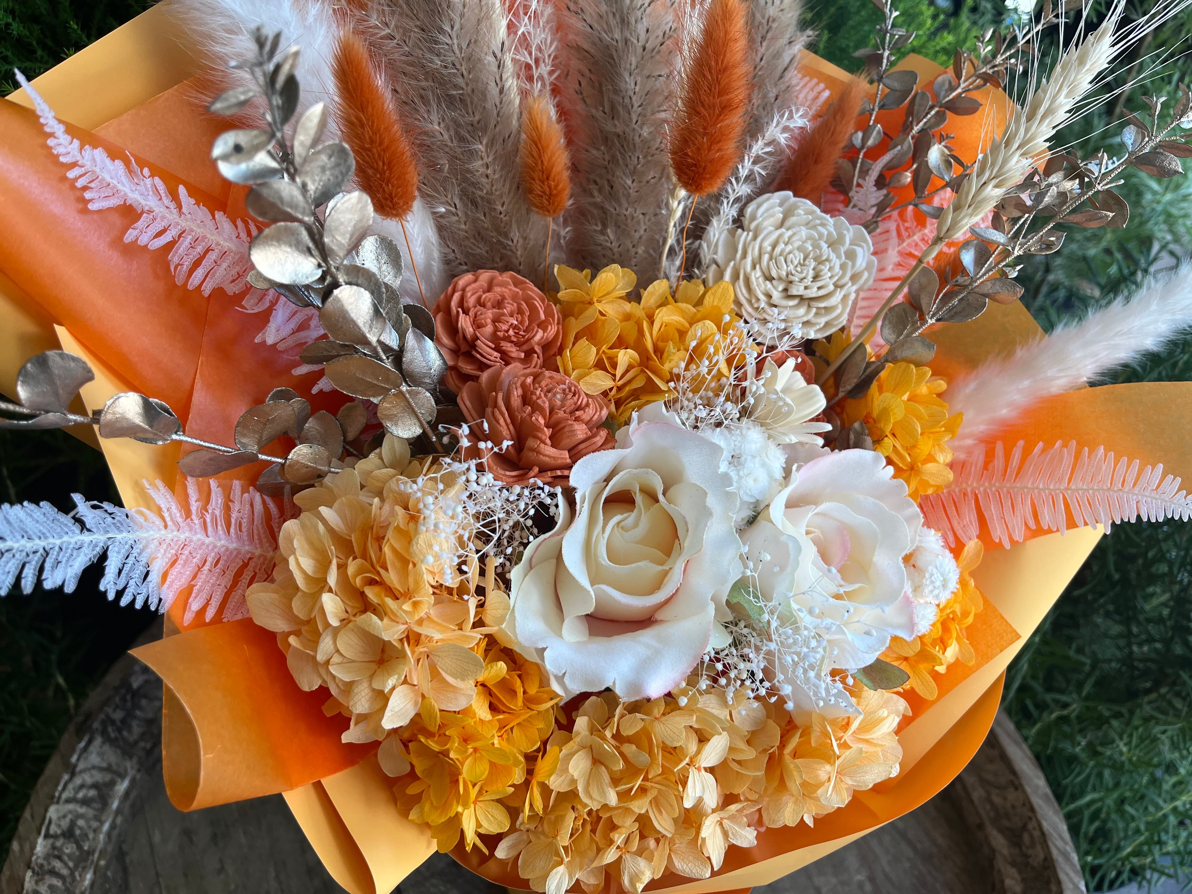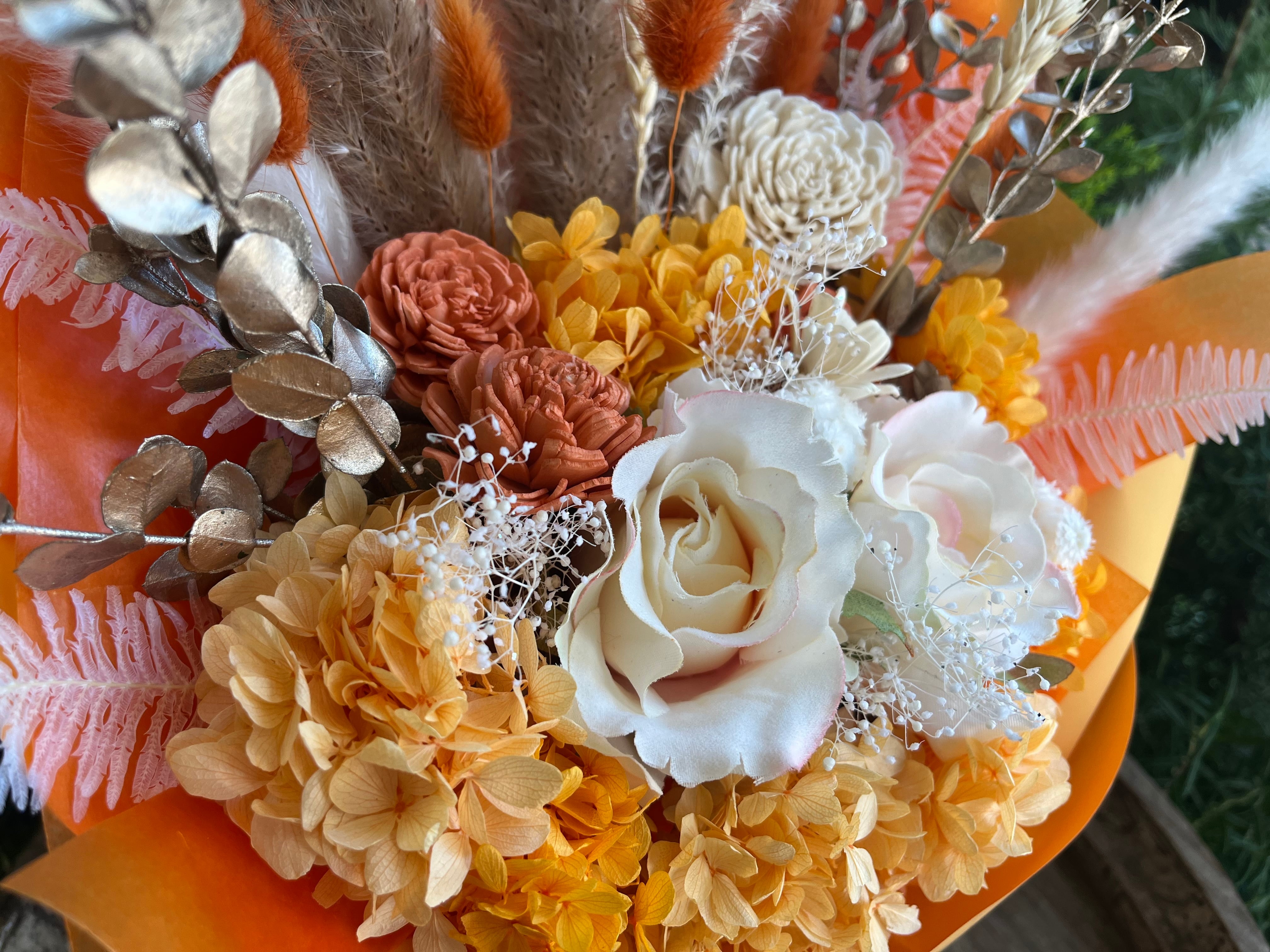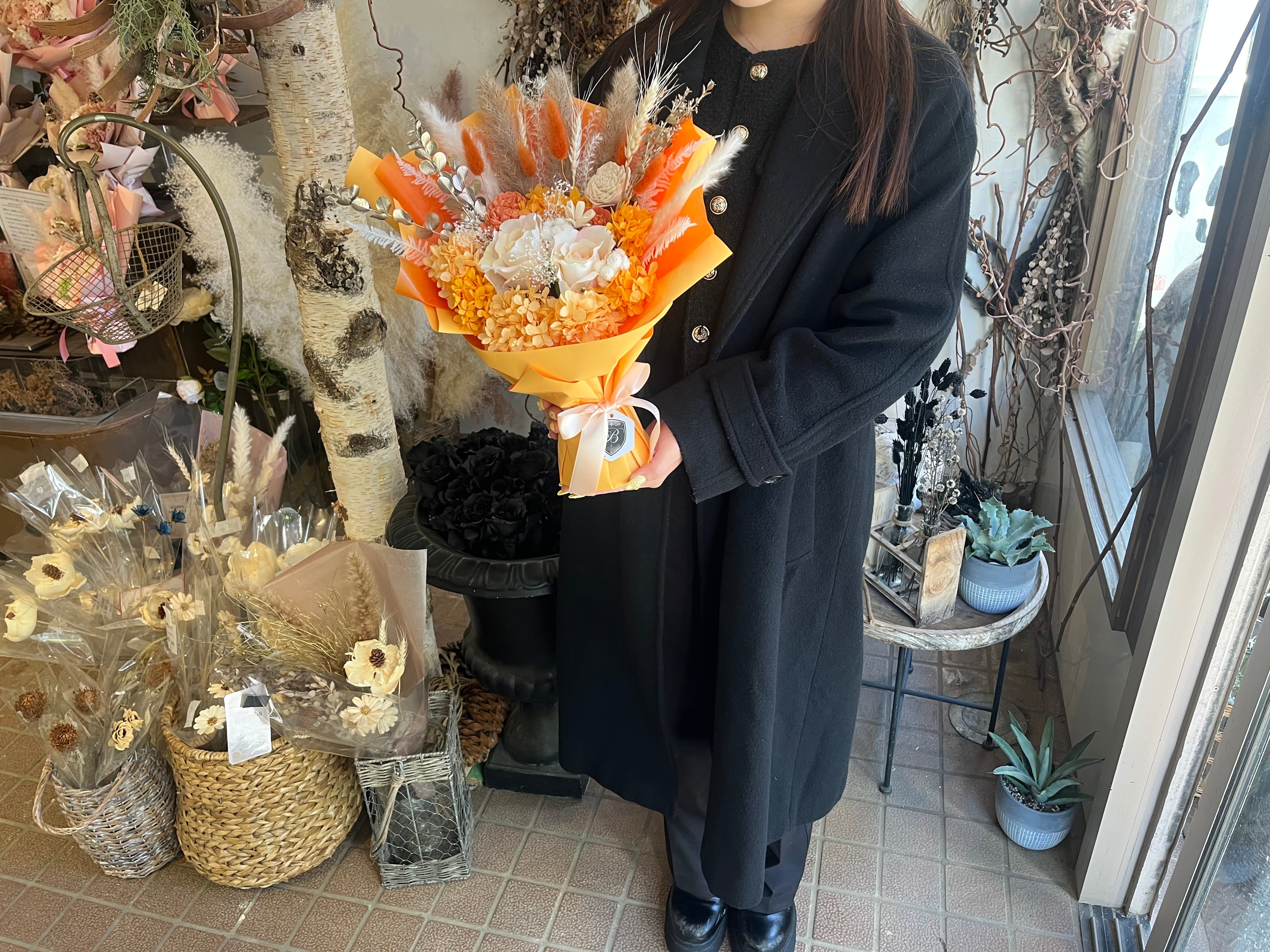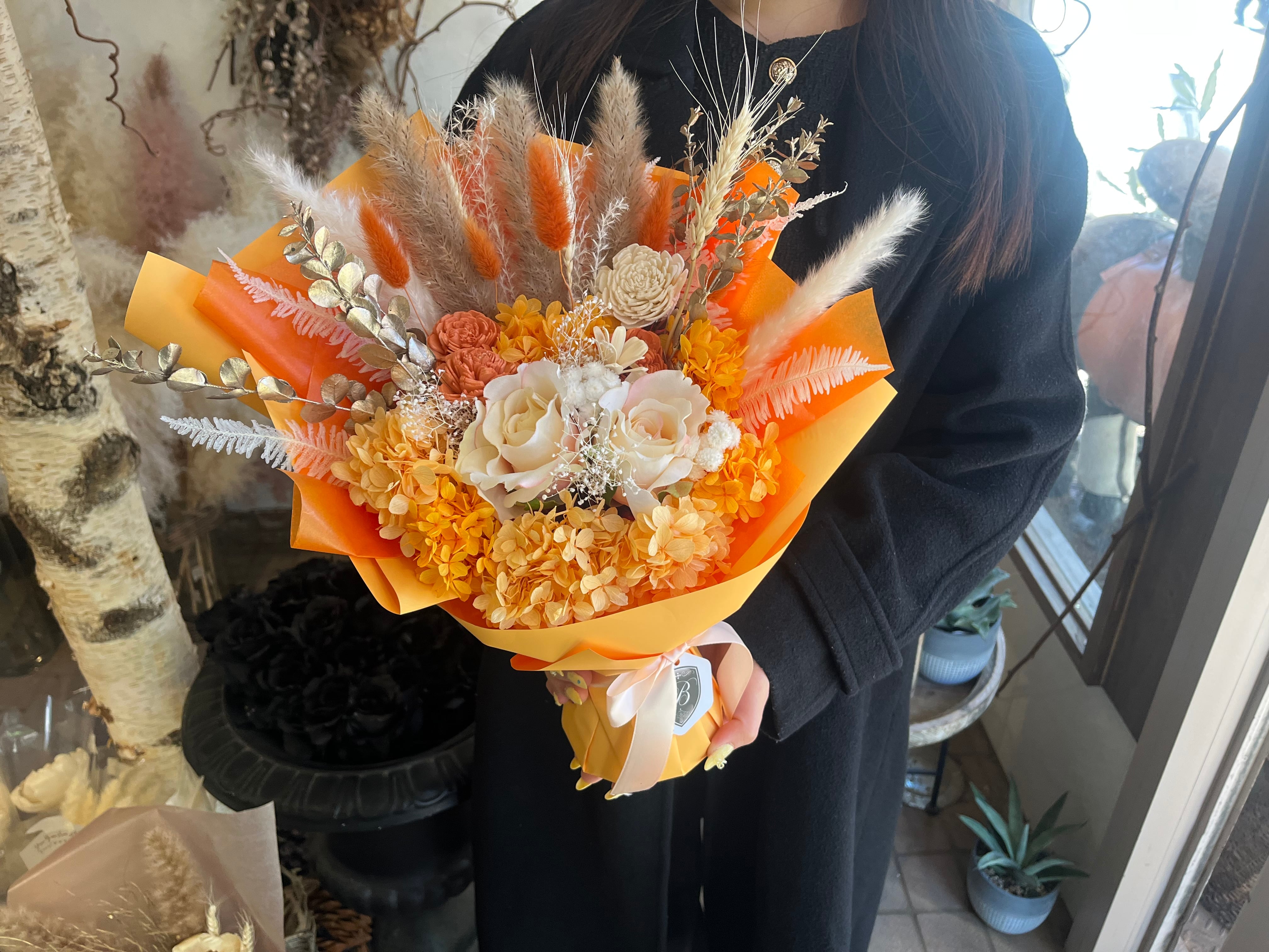 自立型の花束なので花瓶不要、水やりもいらず、空間にあたたかな彩りを添えます。