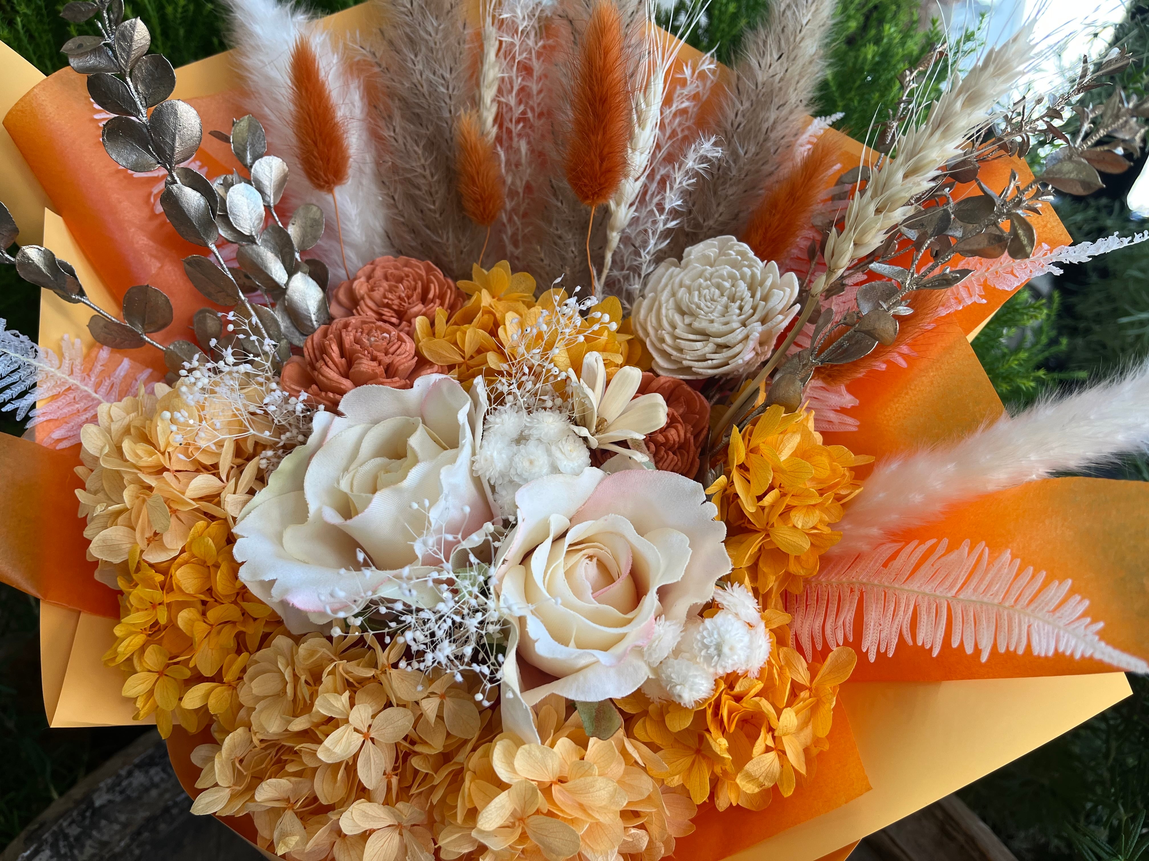 自立型の花束なので花瓶不要、水やりもいらず、空間にあたたかな彩りを添えます。