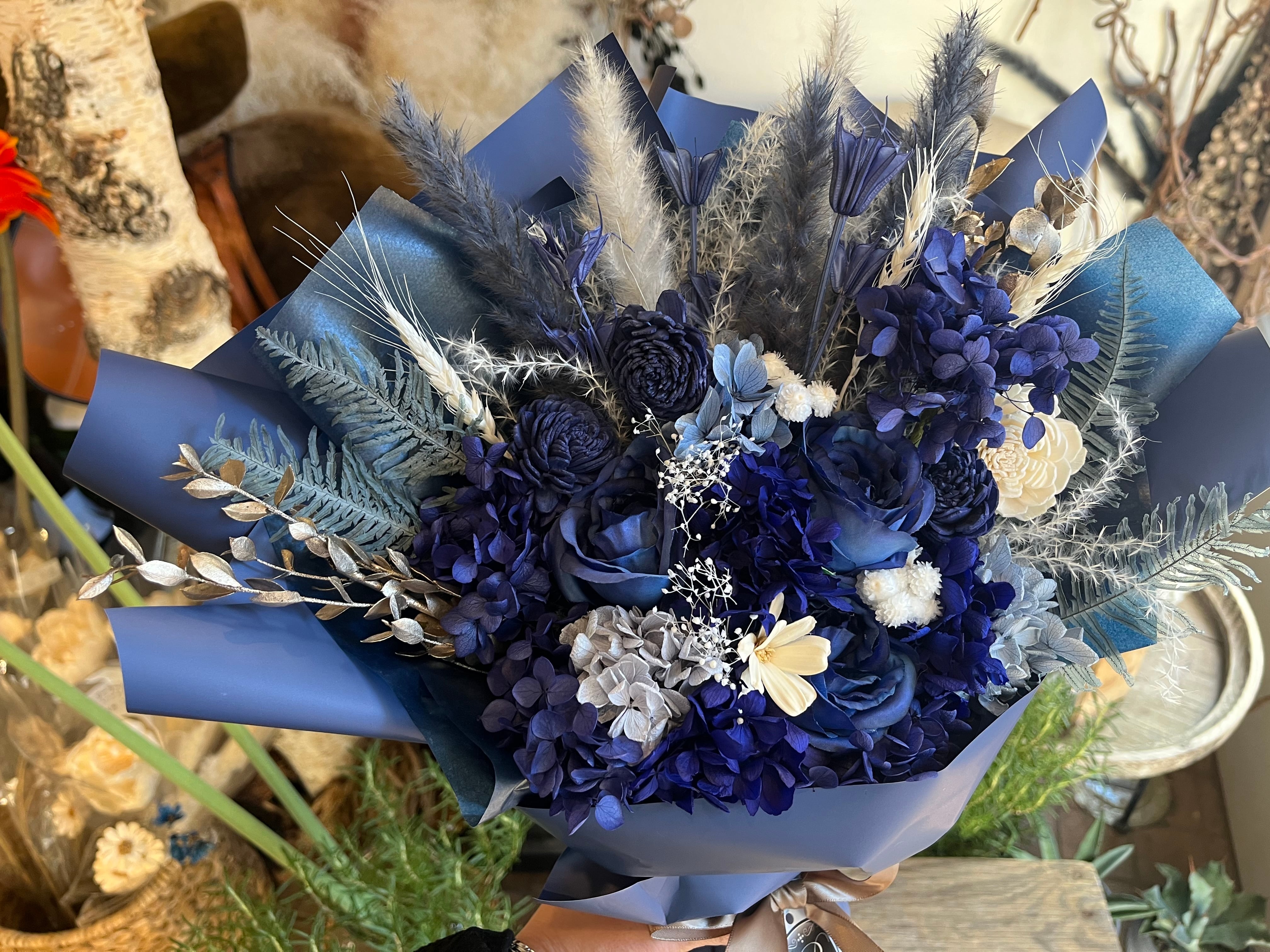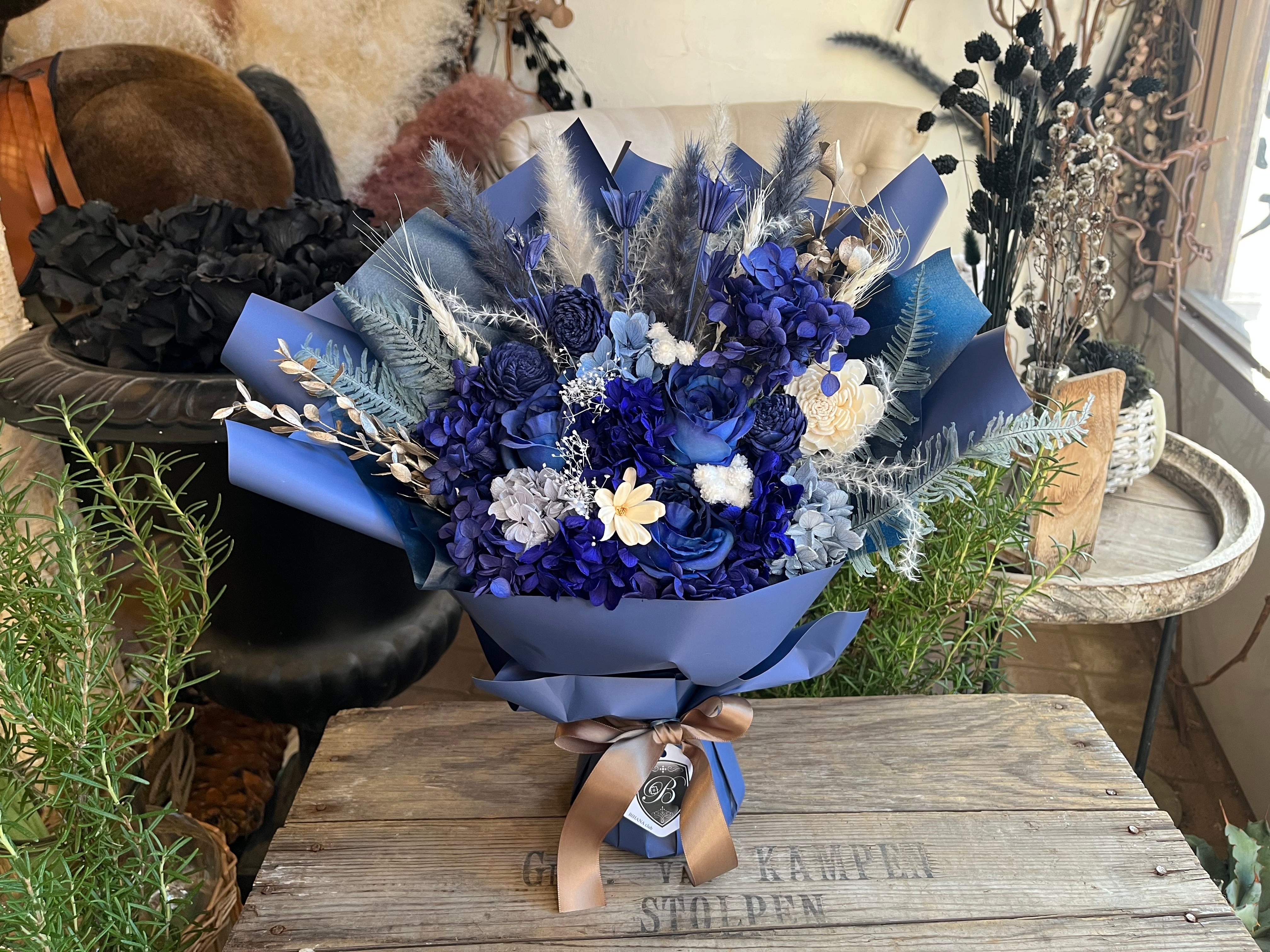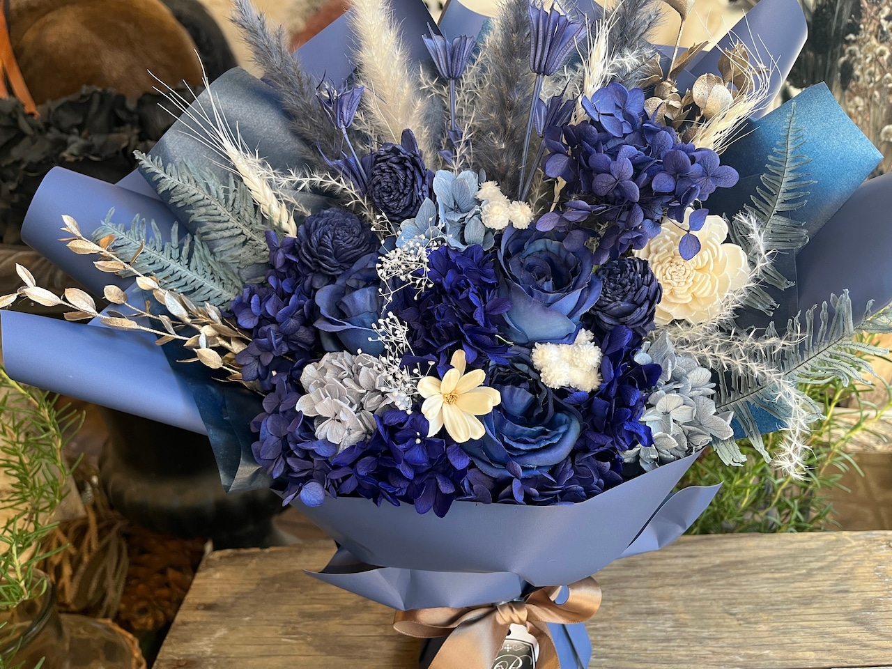 夜空の静けさと深い海の落ち着きを感じさせる、ディープブルーのプリザーブドフラワー スタンディングブーケです。