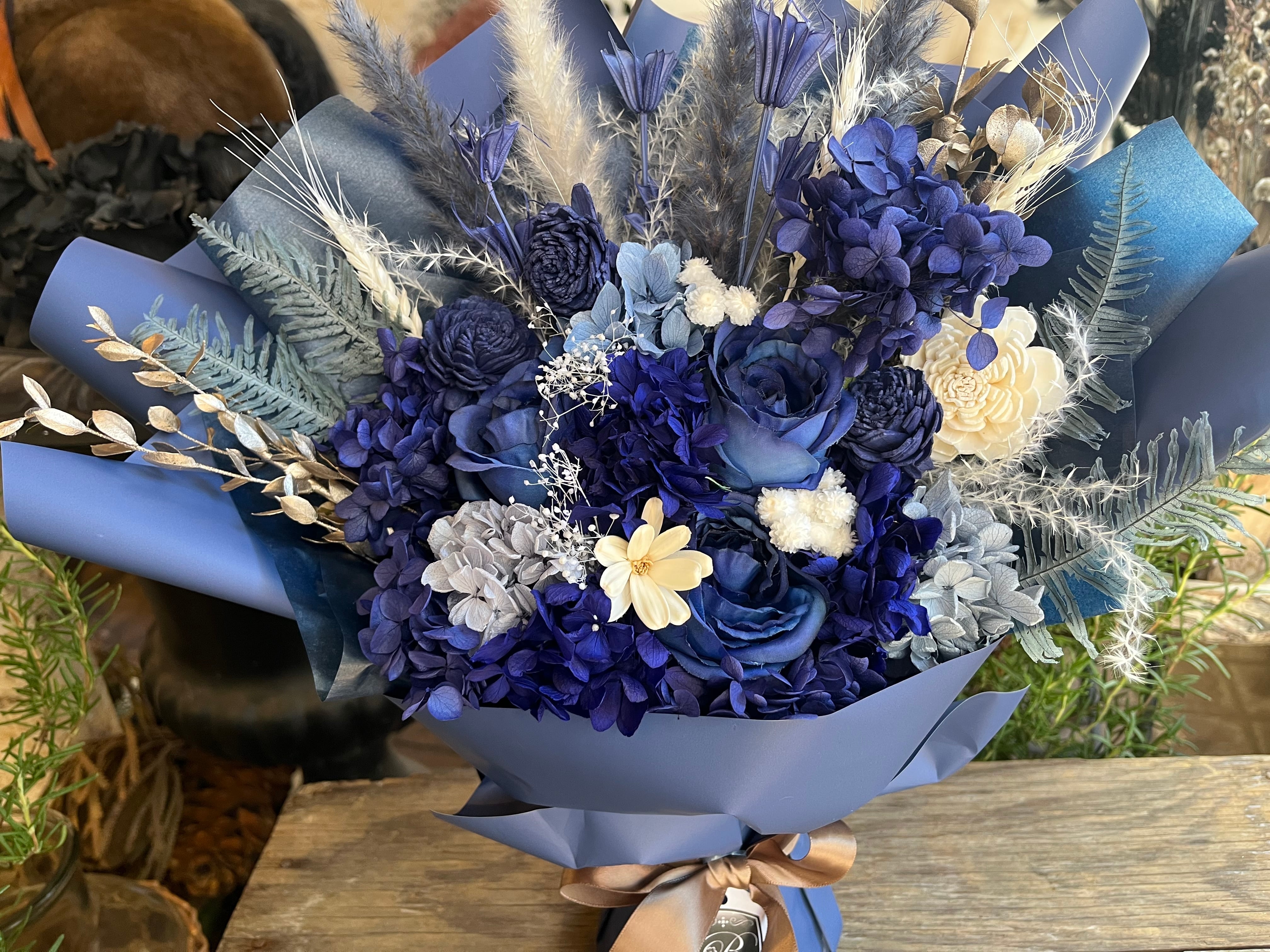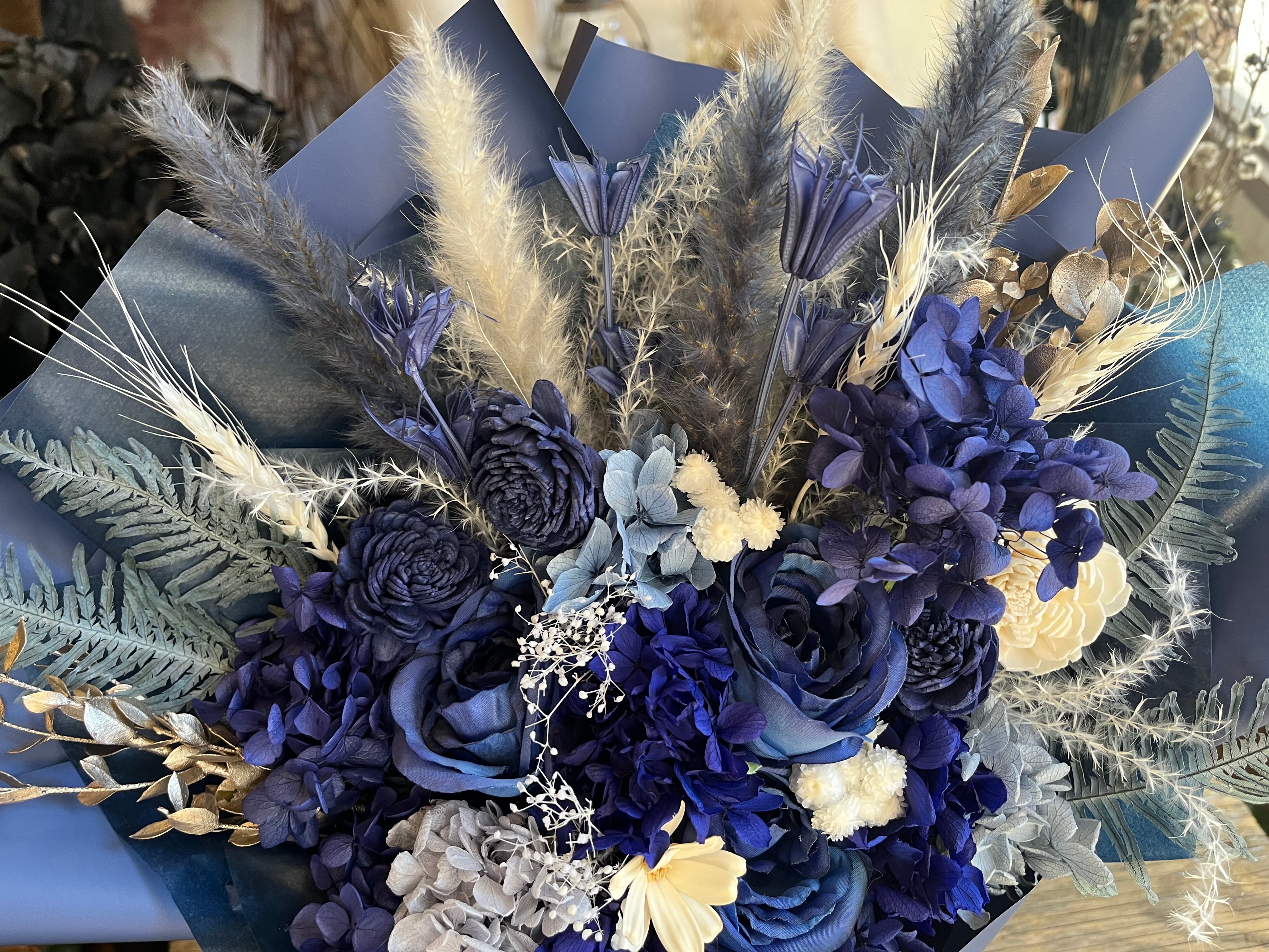 プリザーブドフラワー 花束 ギフト|スタンディングブーケ(自立型・花瓶不要)ディープブルーL①