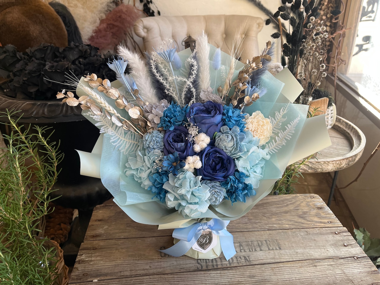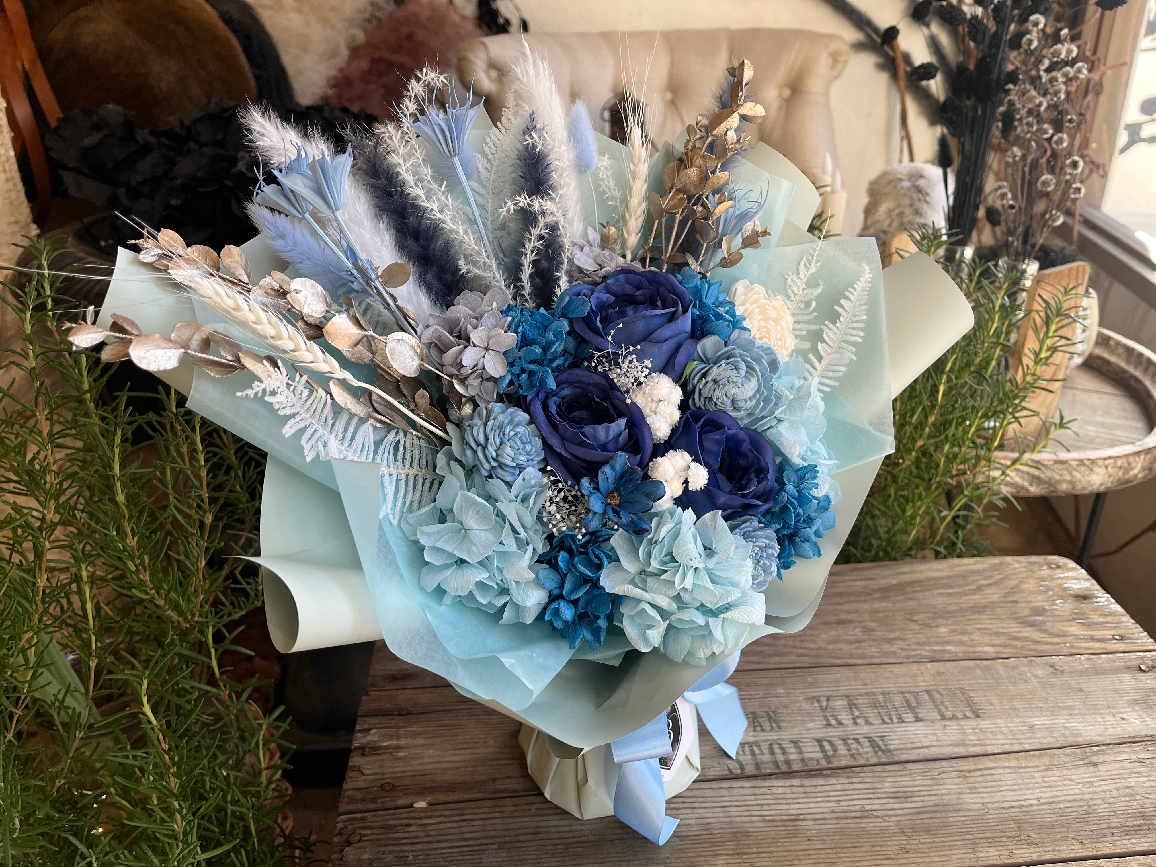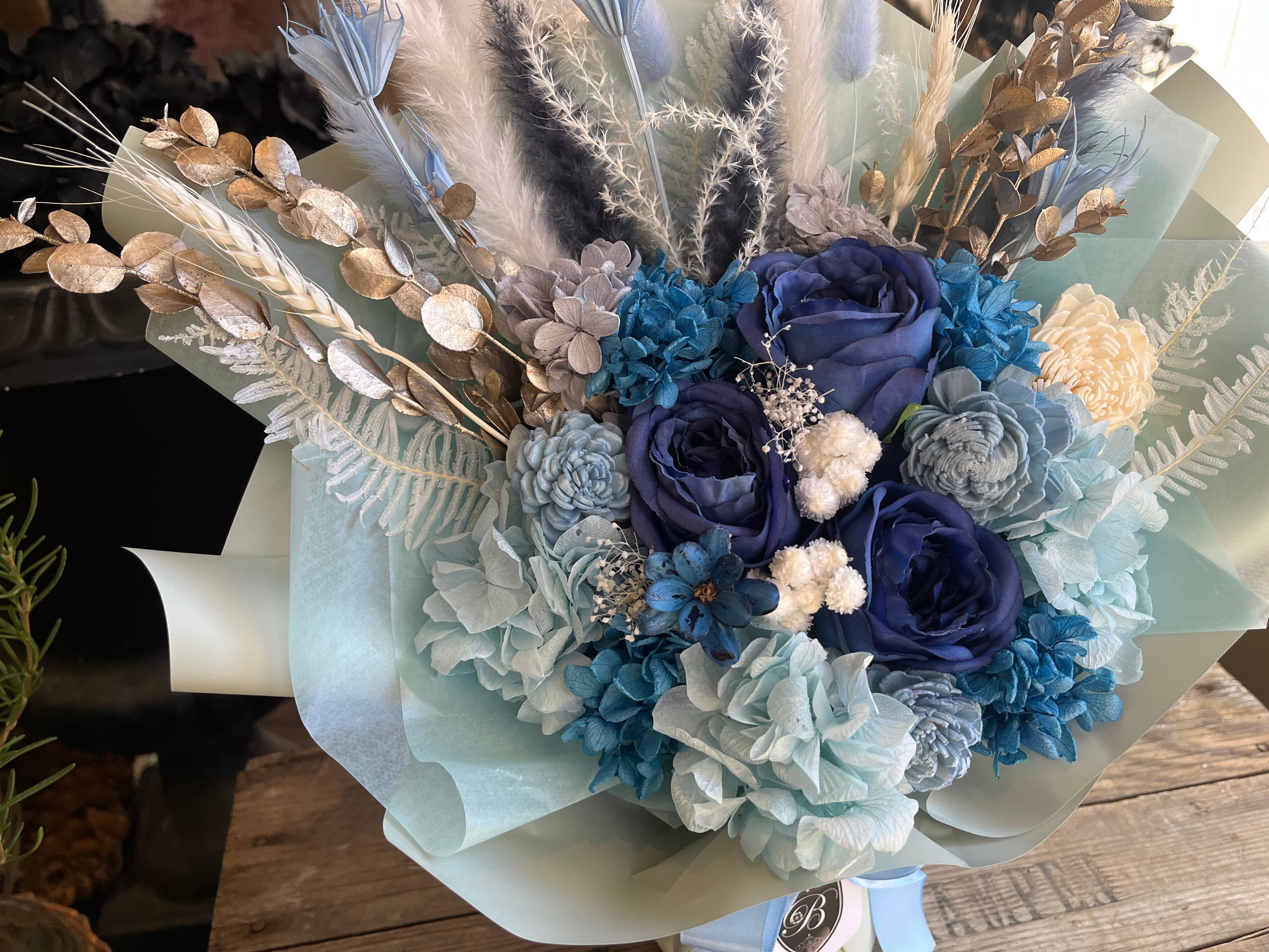深い海を思わせる「ディープオーシャンブルー」が印象的な、プリザーブドフラワーのスタンディングブーケです。