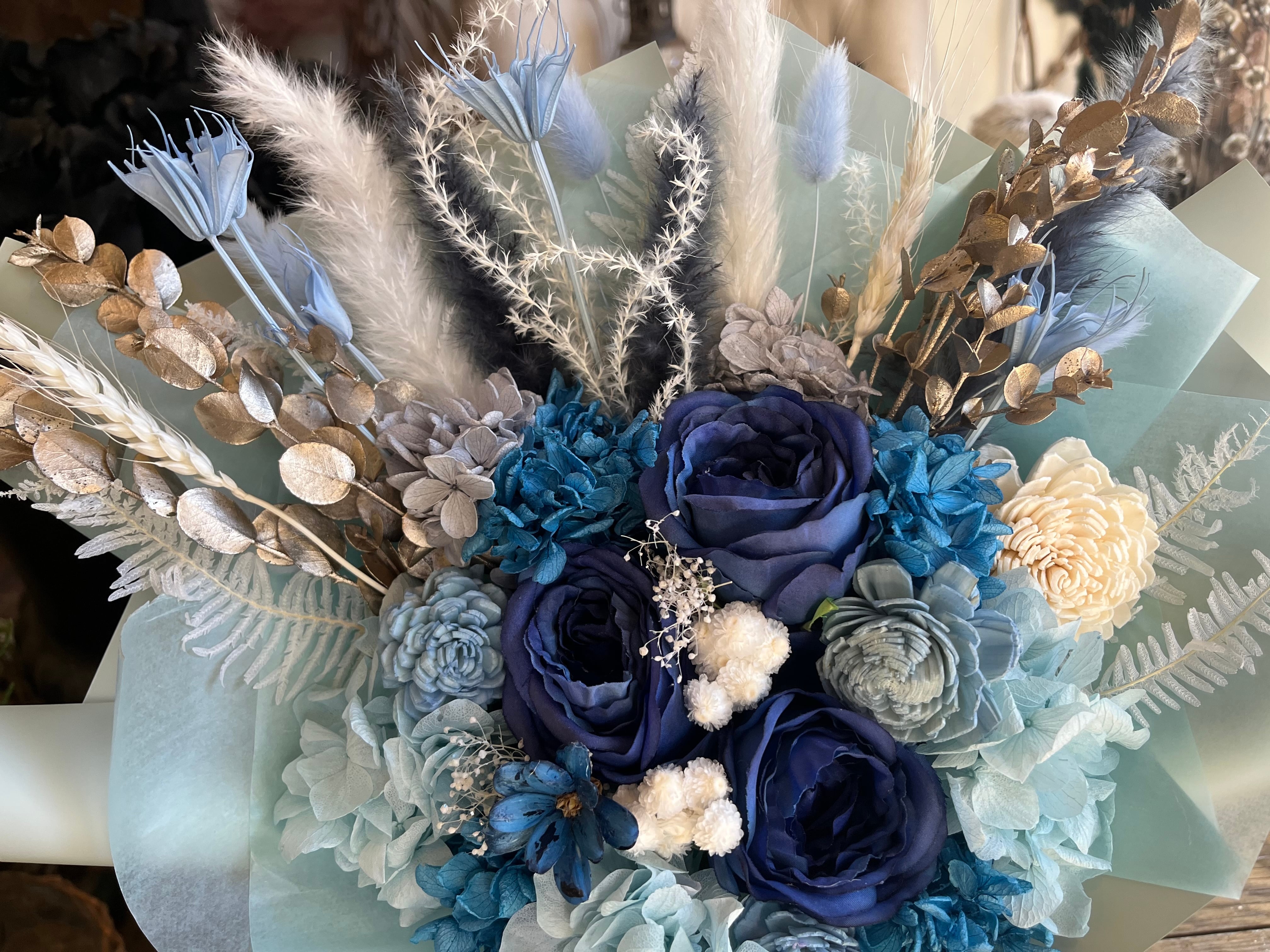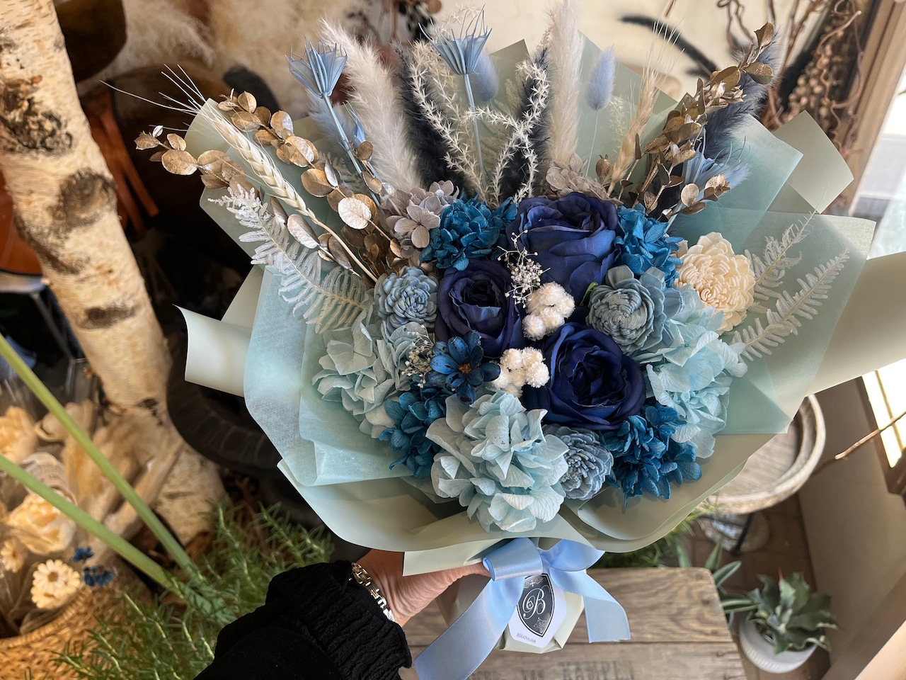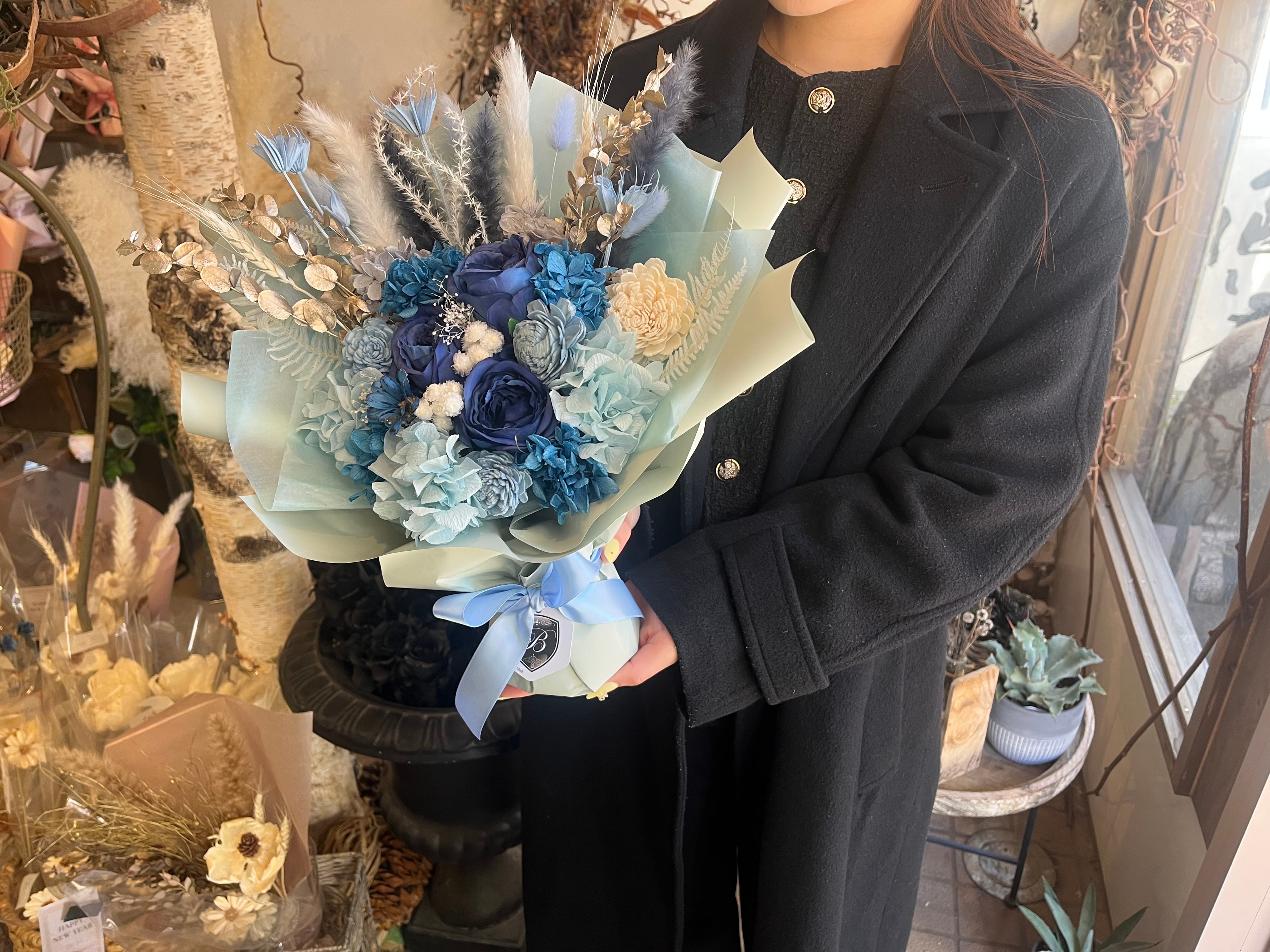 深い海を思わせる「ディープオーシャンブルー」が印象的な、プリザーブドフラワーのスタンディングブーケです。