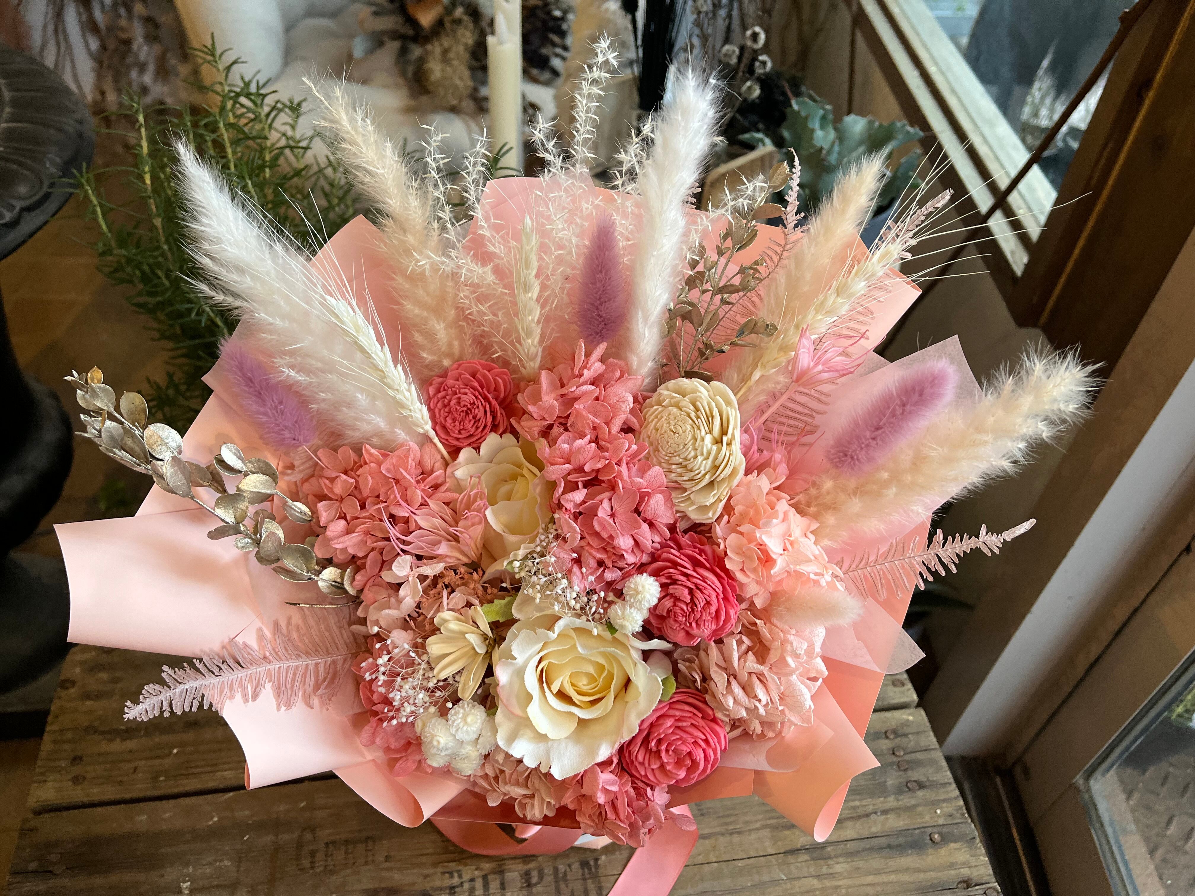 柔らかなピンクを主役にした、上品なスタンディングブーケ「ピンクシルエット」。