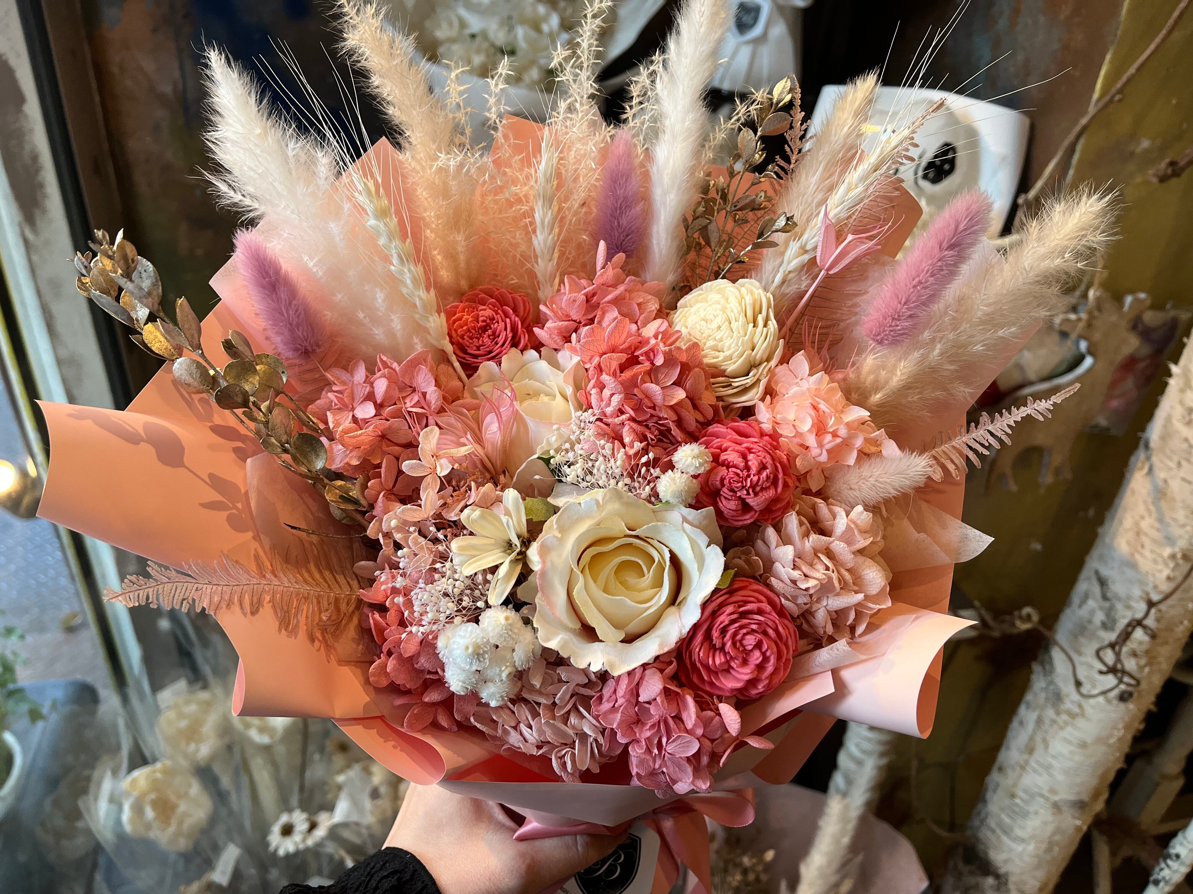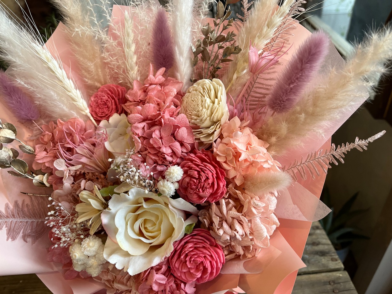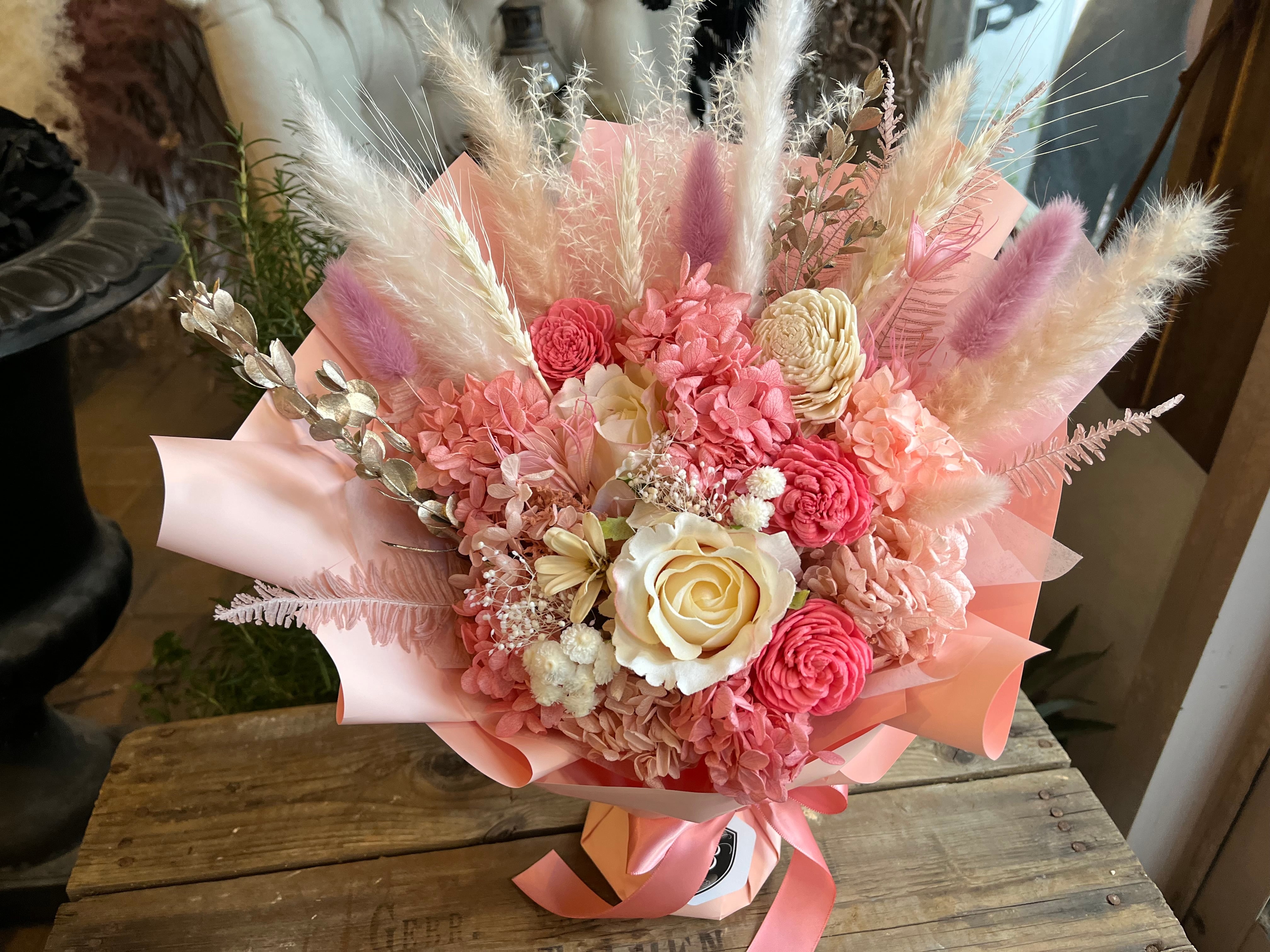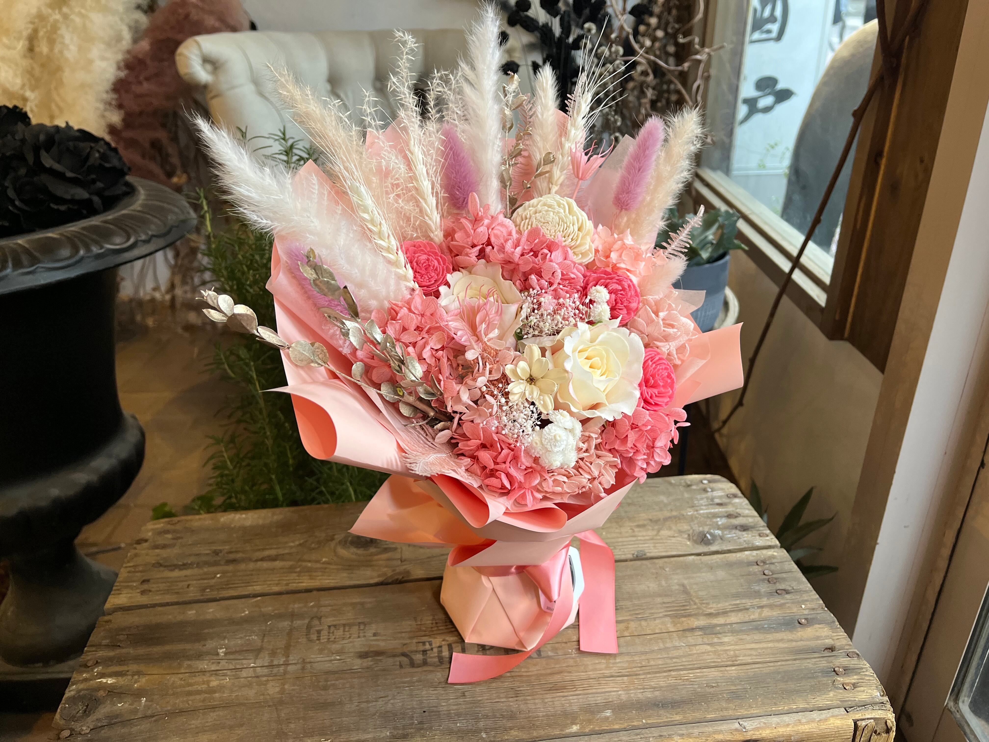 花束は自立する仕様のため花瓶をご用意いただく必要がなく、水やりも不要で長く美しさを楽しめます。