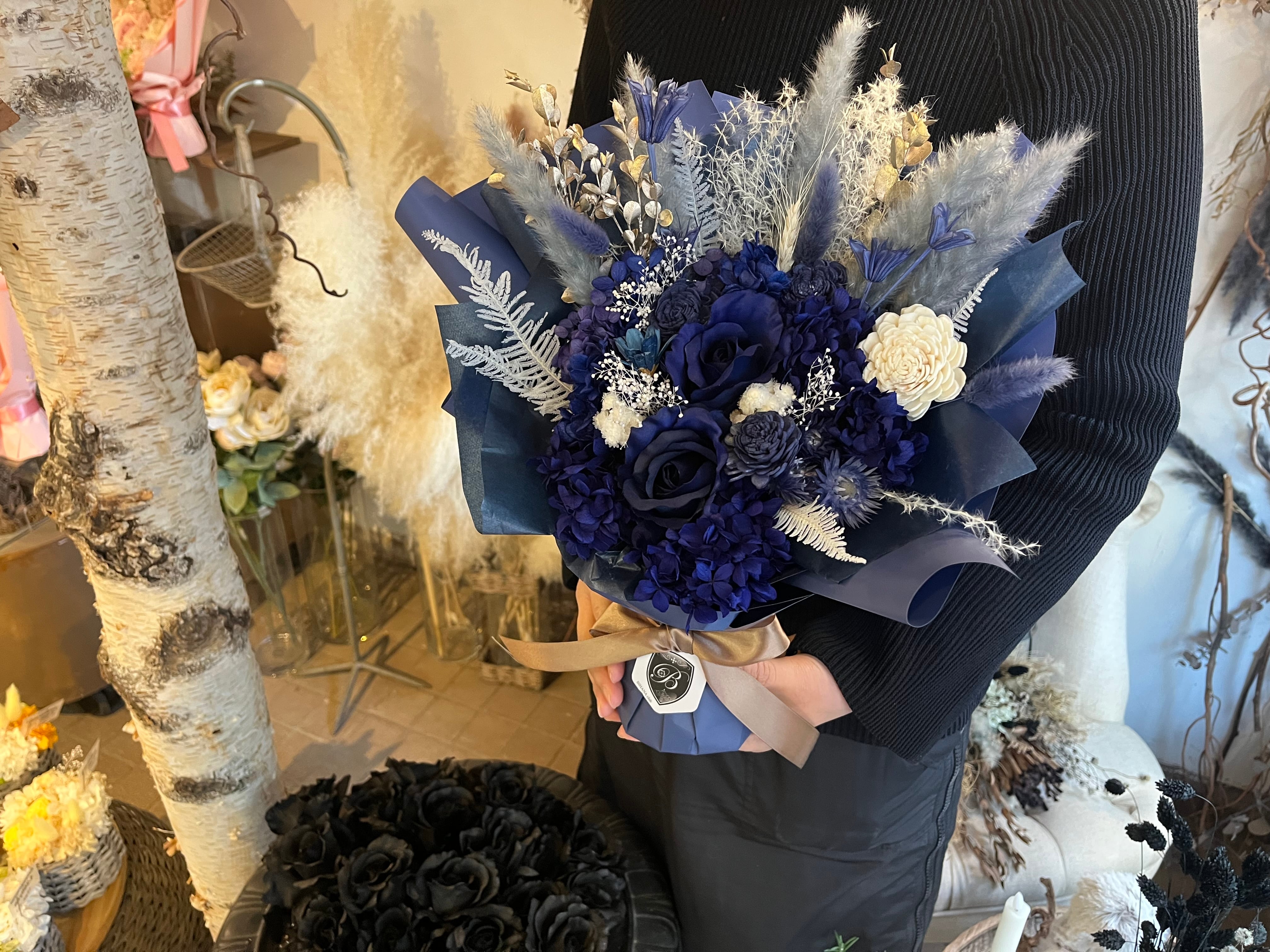夜空の静けさと深い海の落ち着きを感じさせる、ディープブルーのプリザーブドフラワーブーケです。