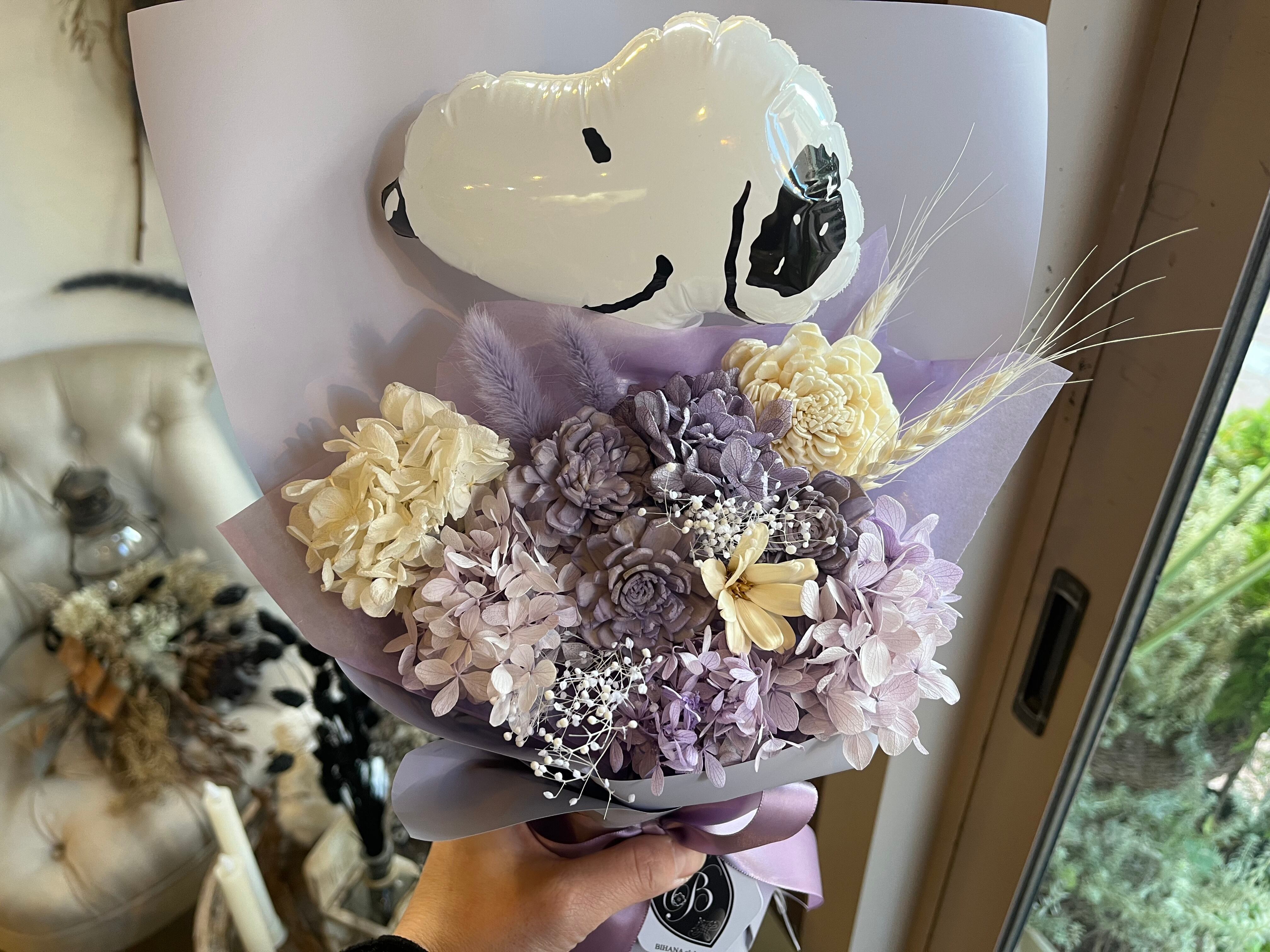 花瓶不要でそのまま飾れる スヌーピー プリザーブドフラワー花束|バルーン付 スタンディングブーケ パープル|卒業祝い 退職 卒園 誕生日ギフト | 美花倶楽部 BiHANA Club (Hanayue)