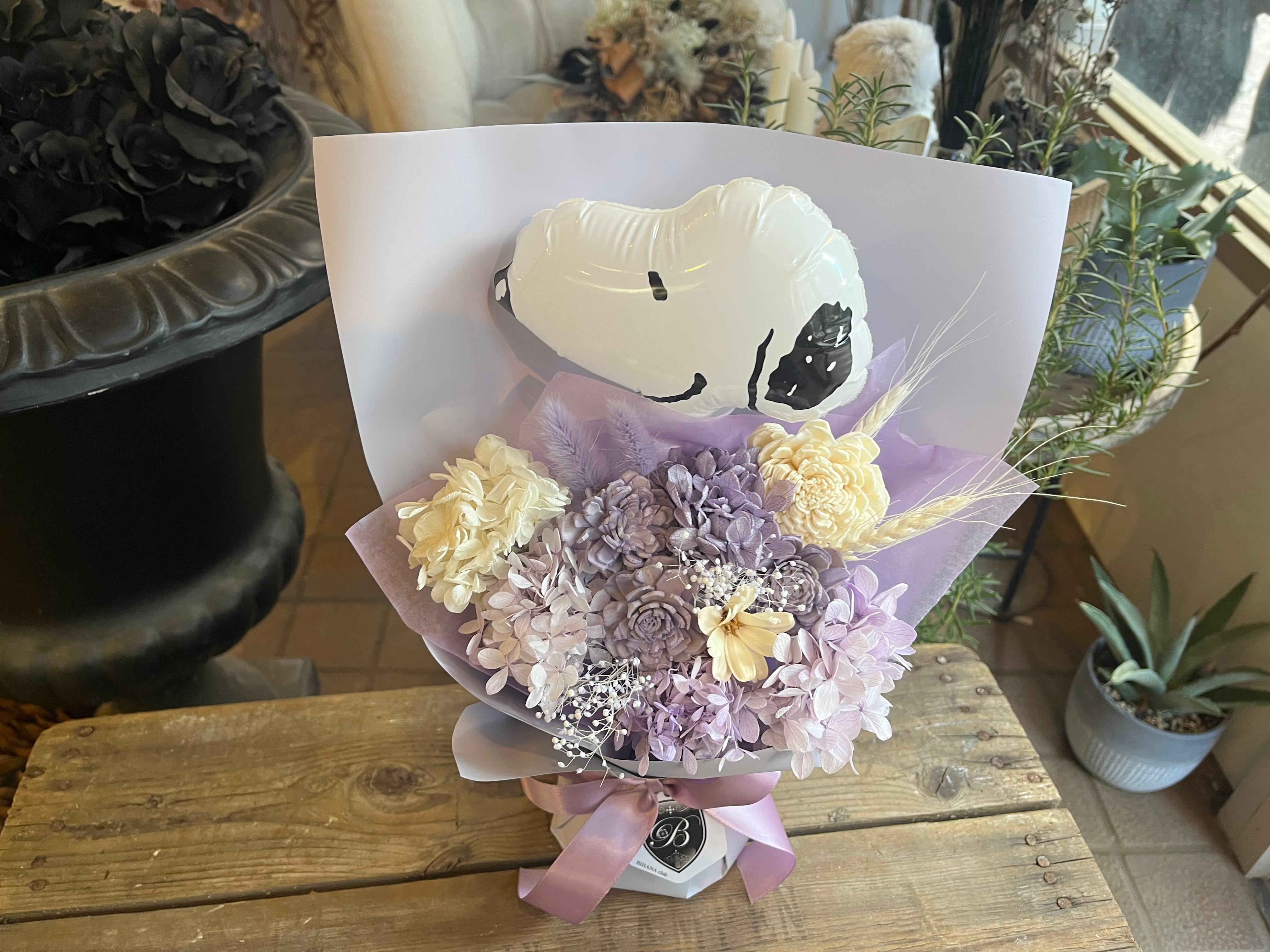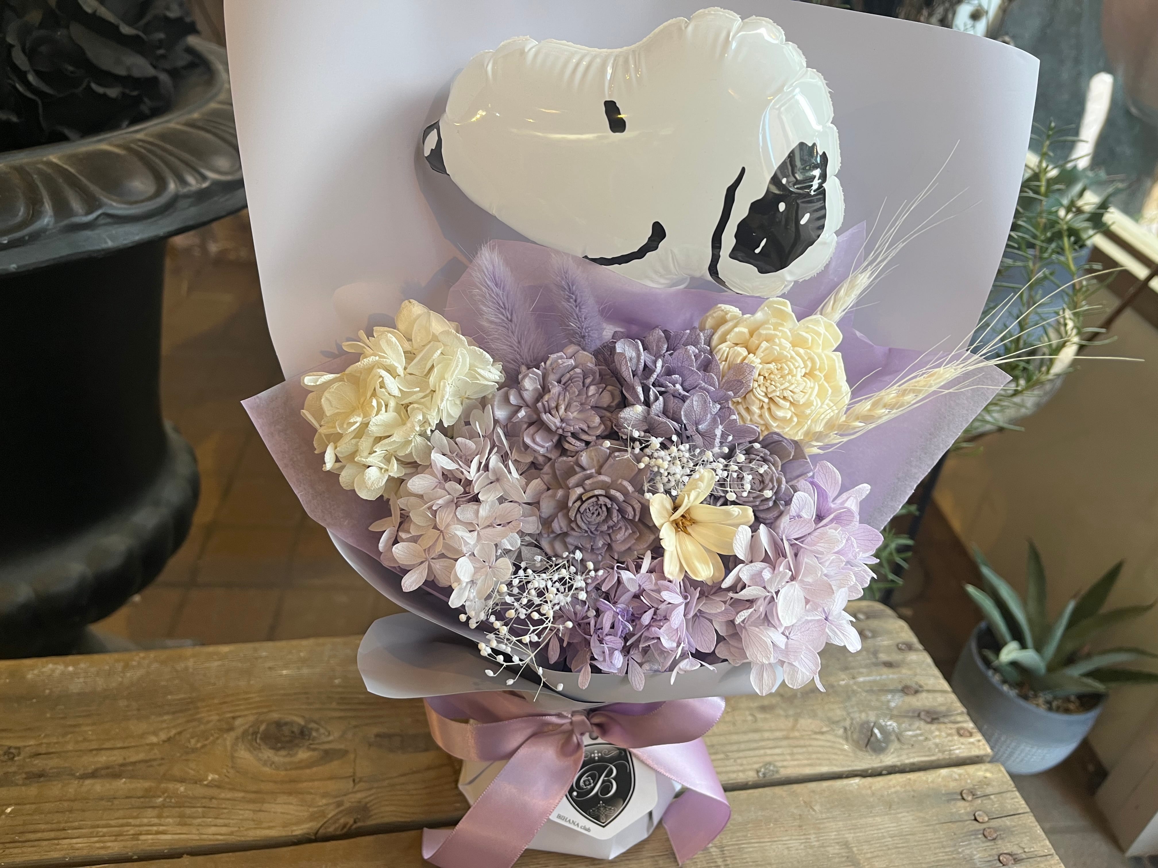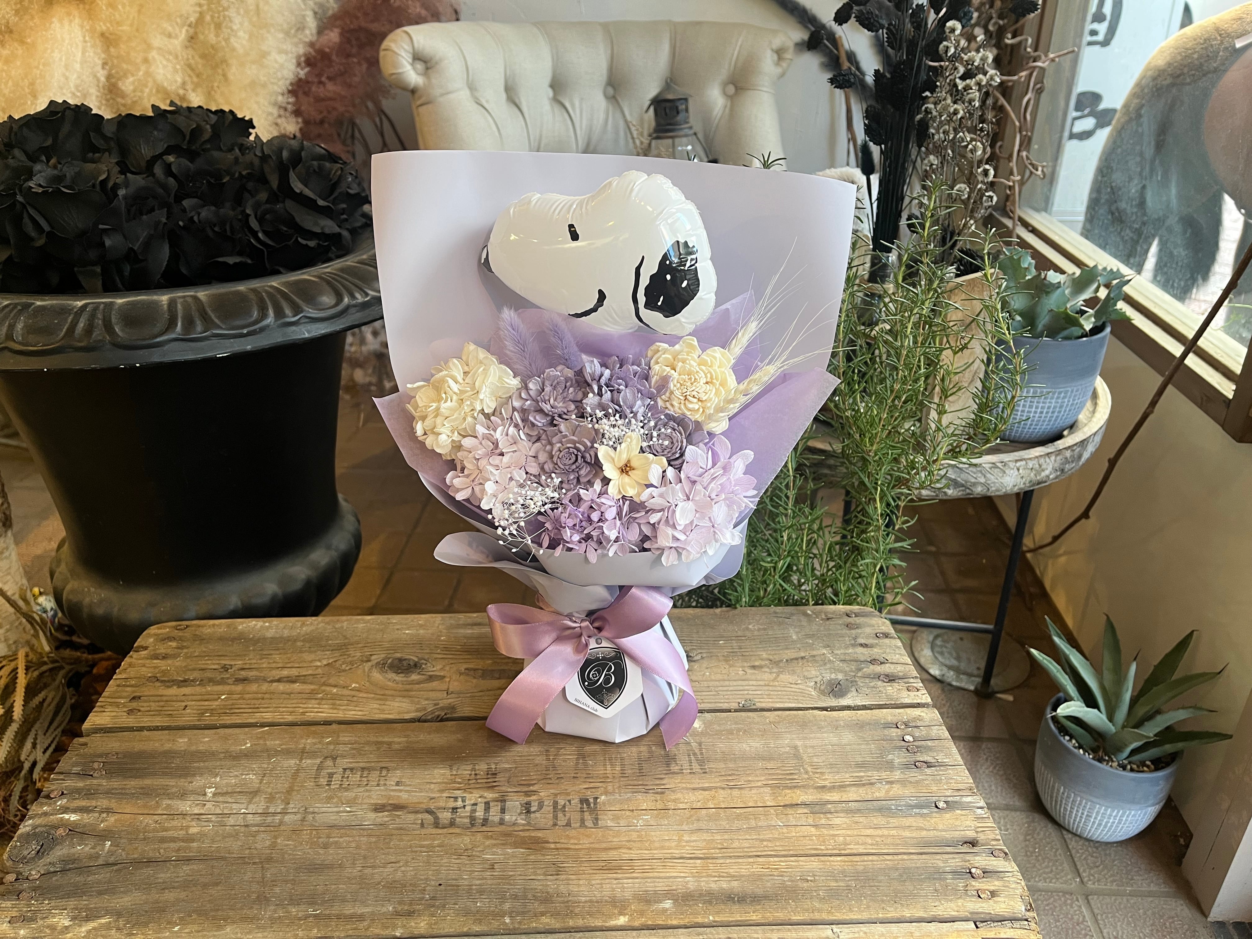 【美花倶楽部のスヌーピーバルーン付き スタンディングブーケ】