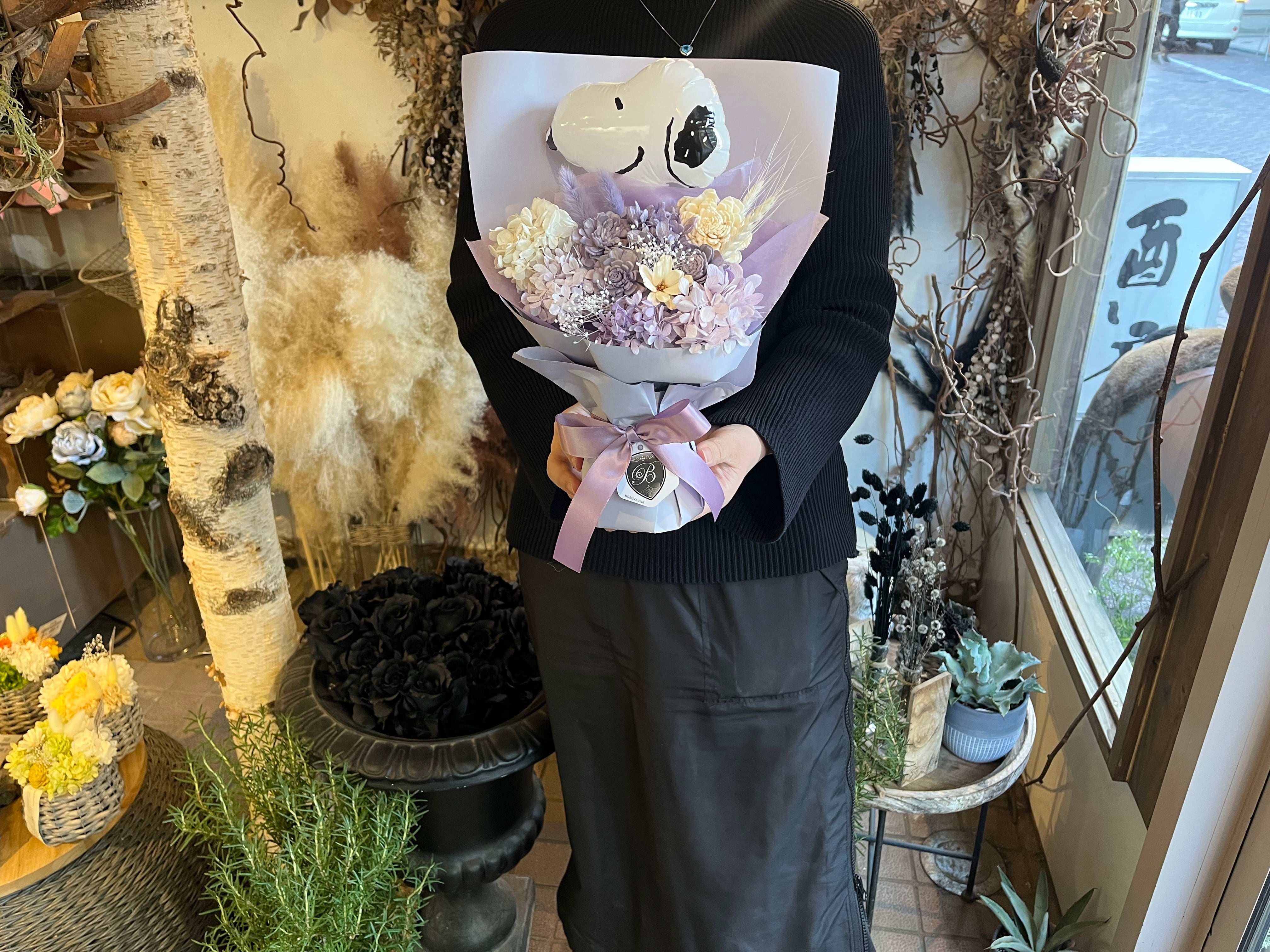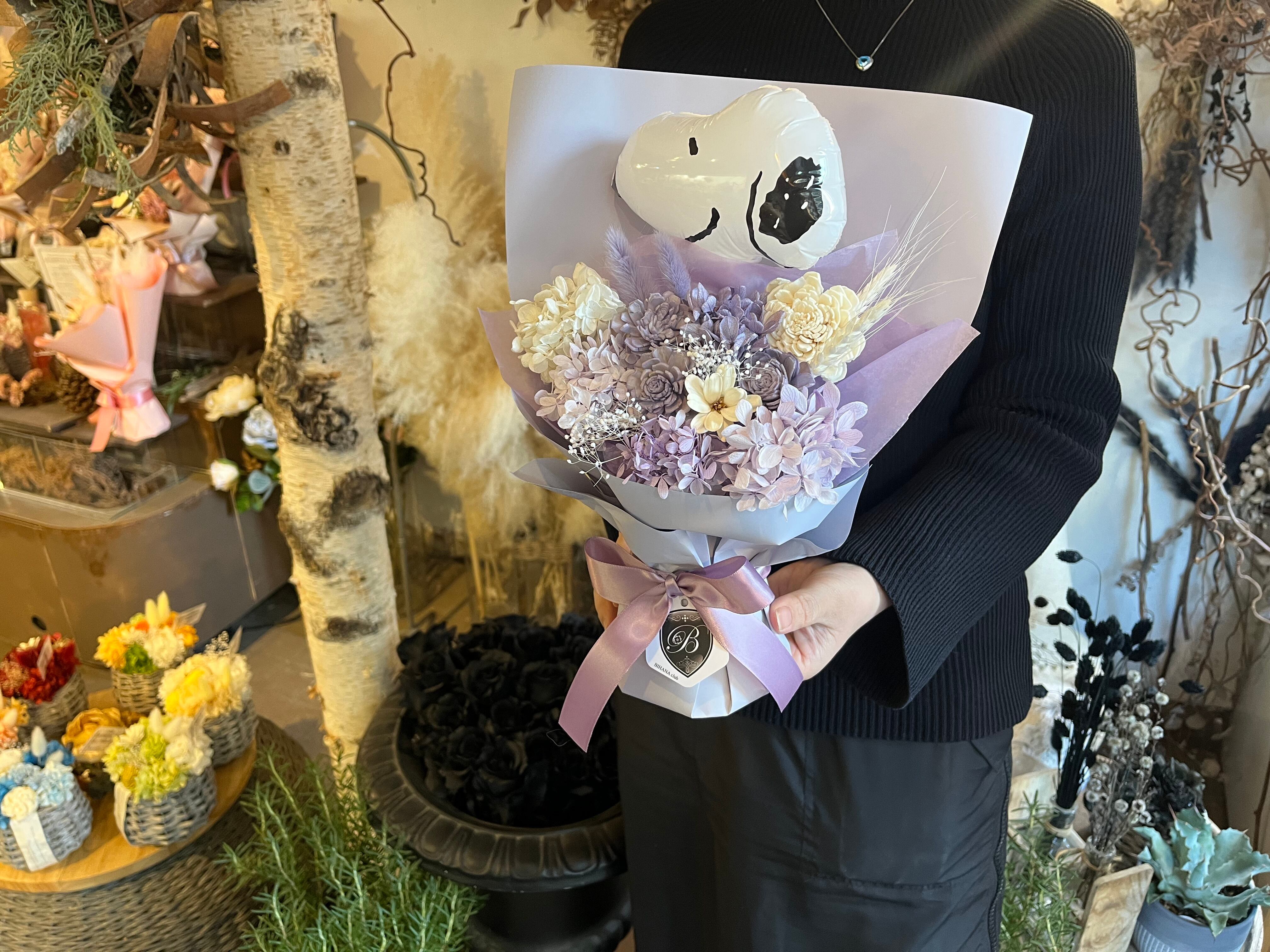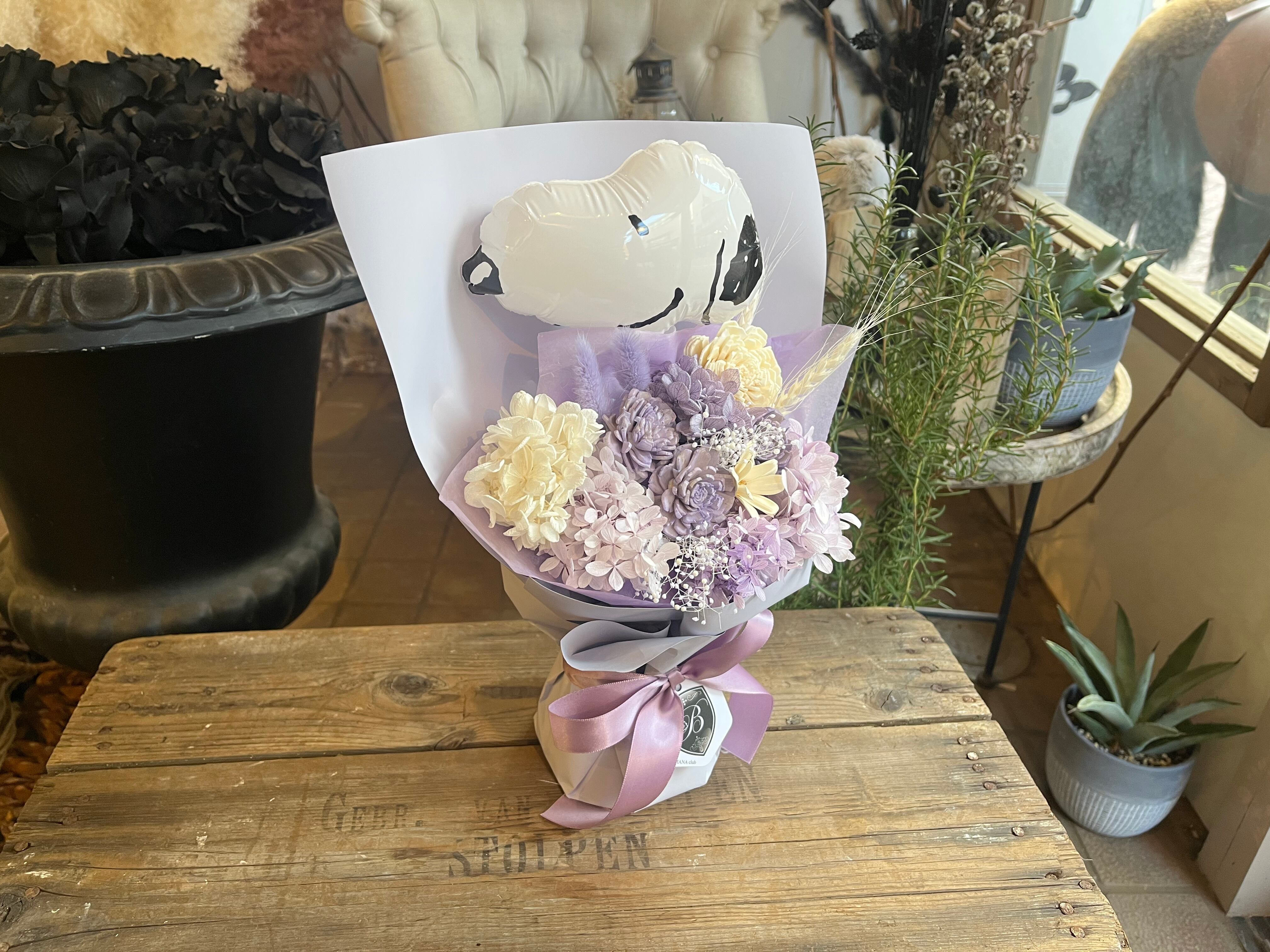 【美花倶楽部のスヌーピーバルーン付き スタンディングブーケ】