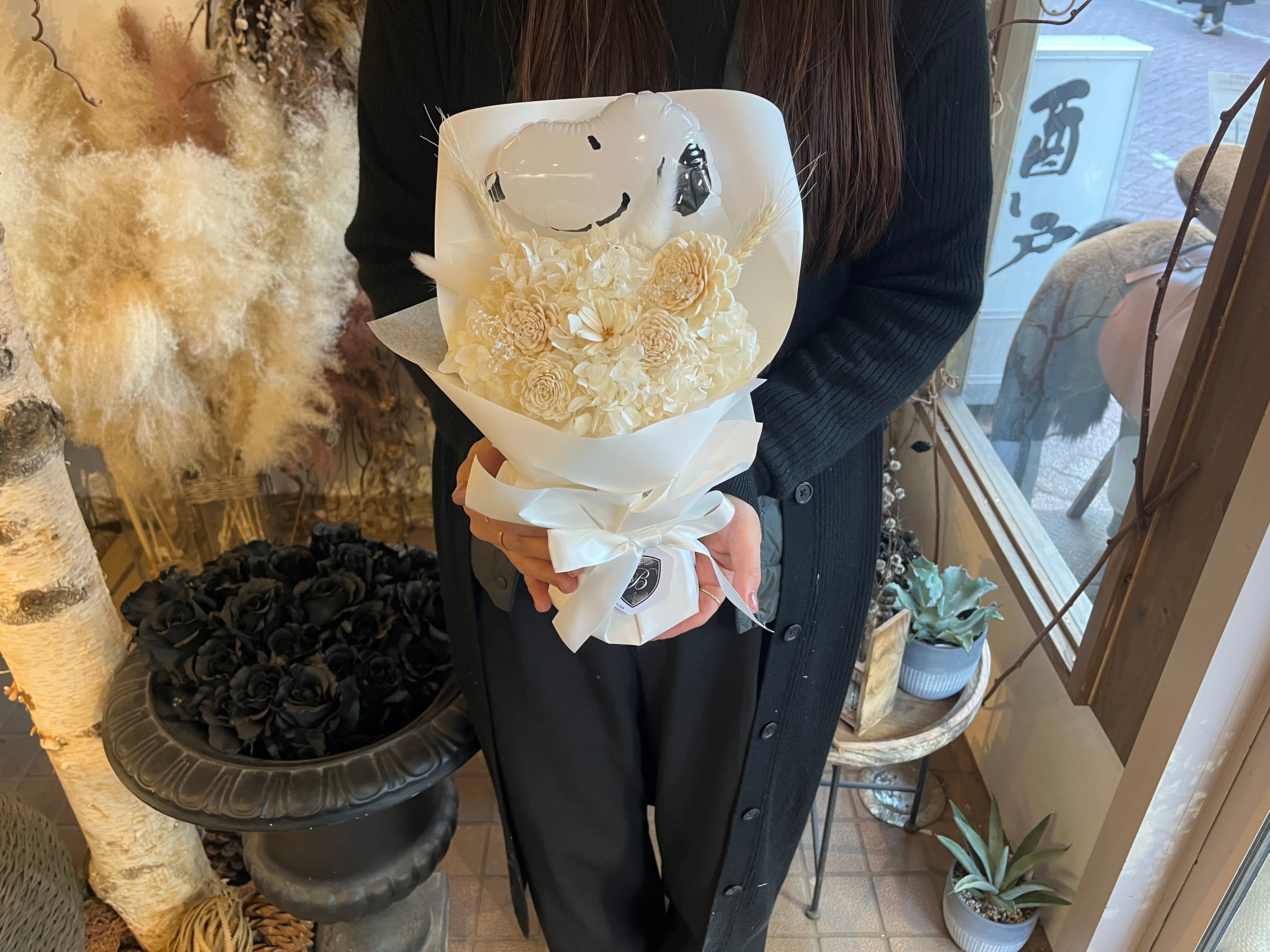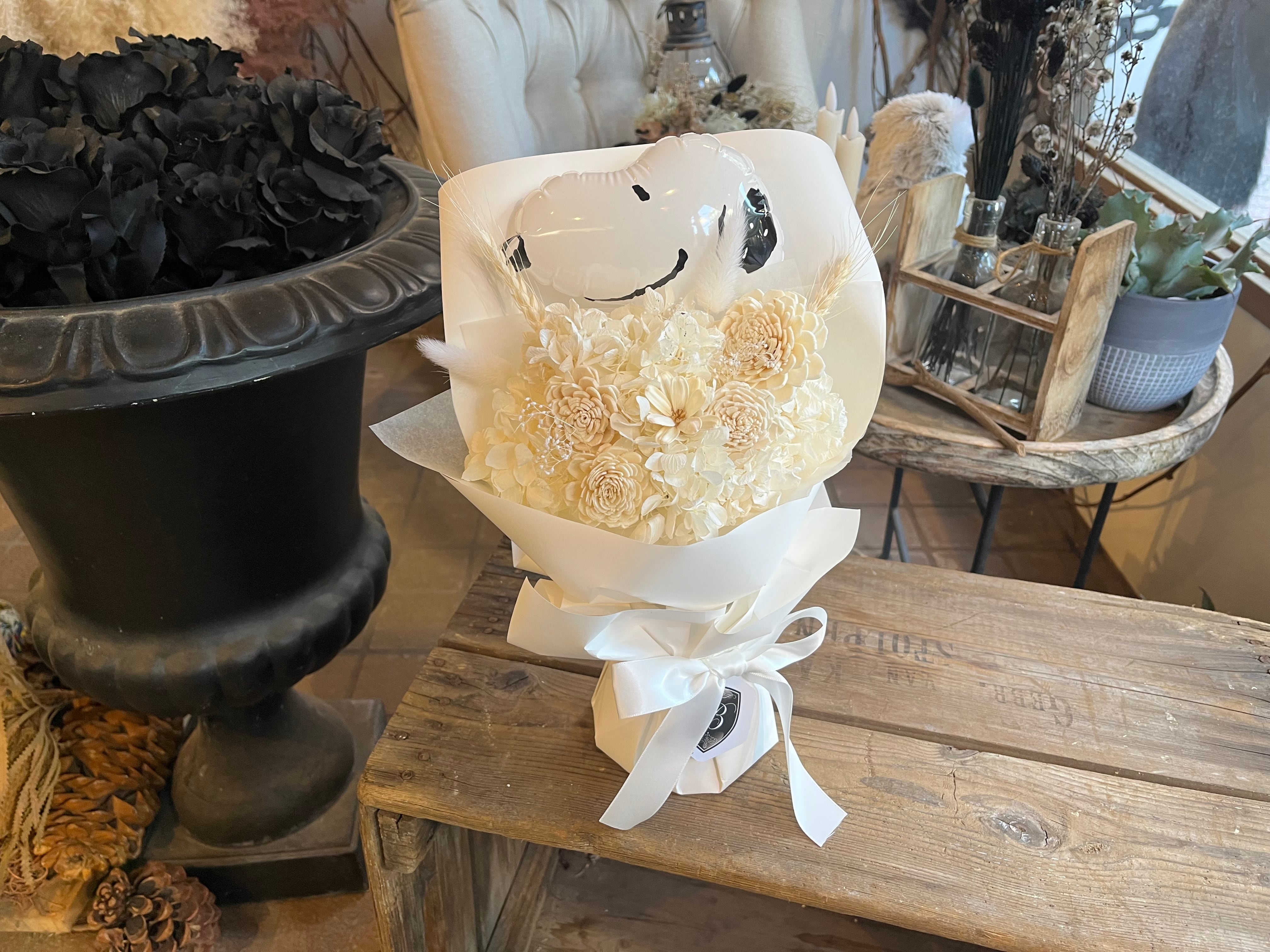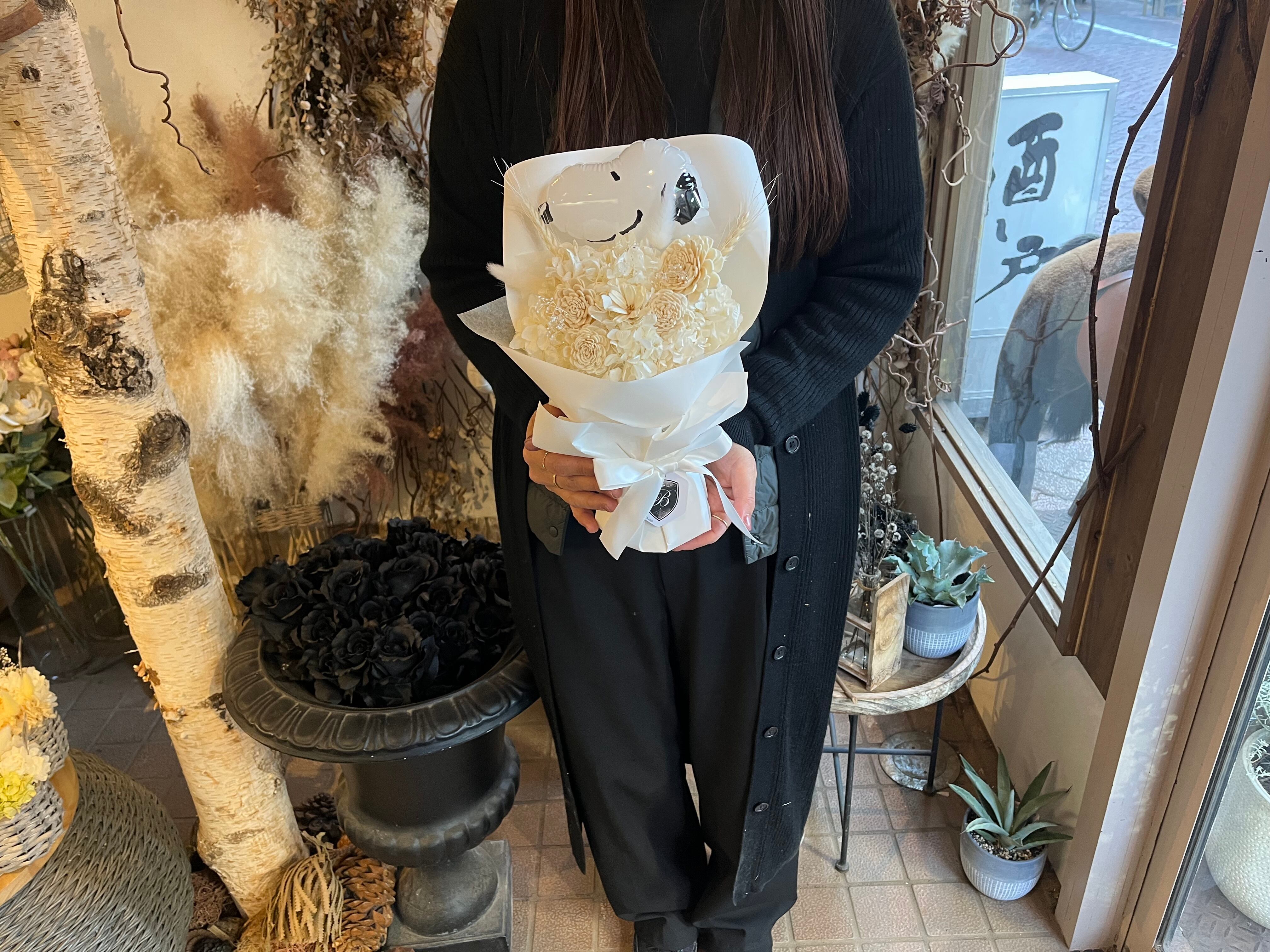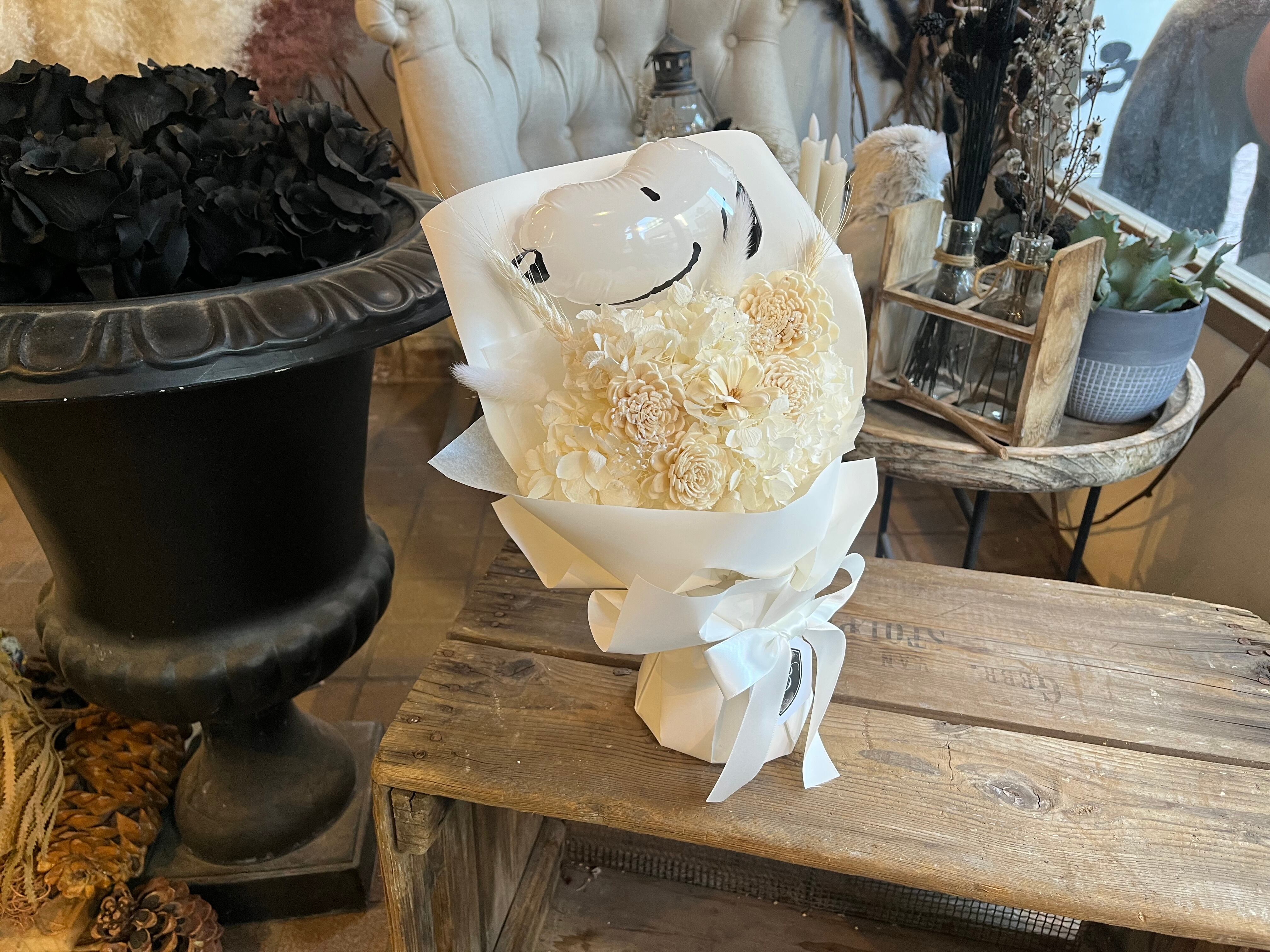 【美花倶楽部のスヌーピーバルーン付き スタンディングブーケ】