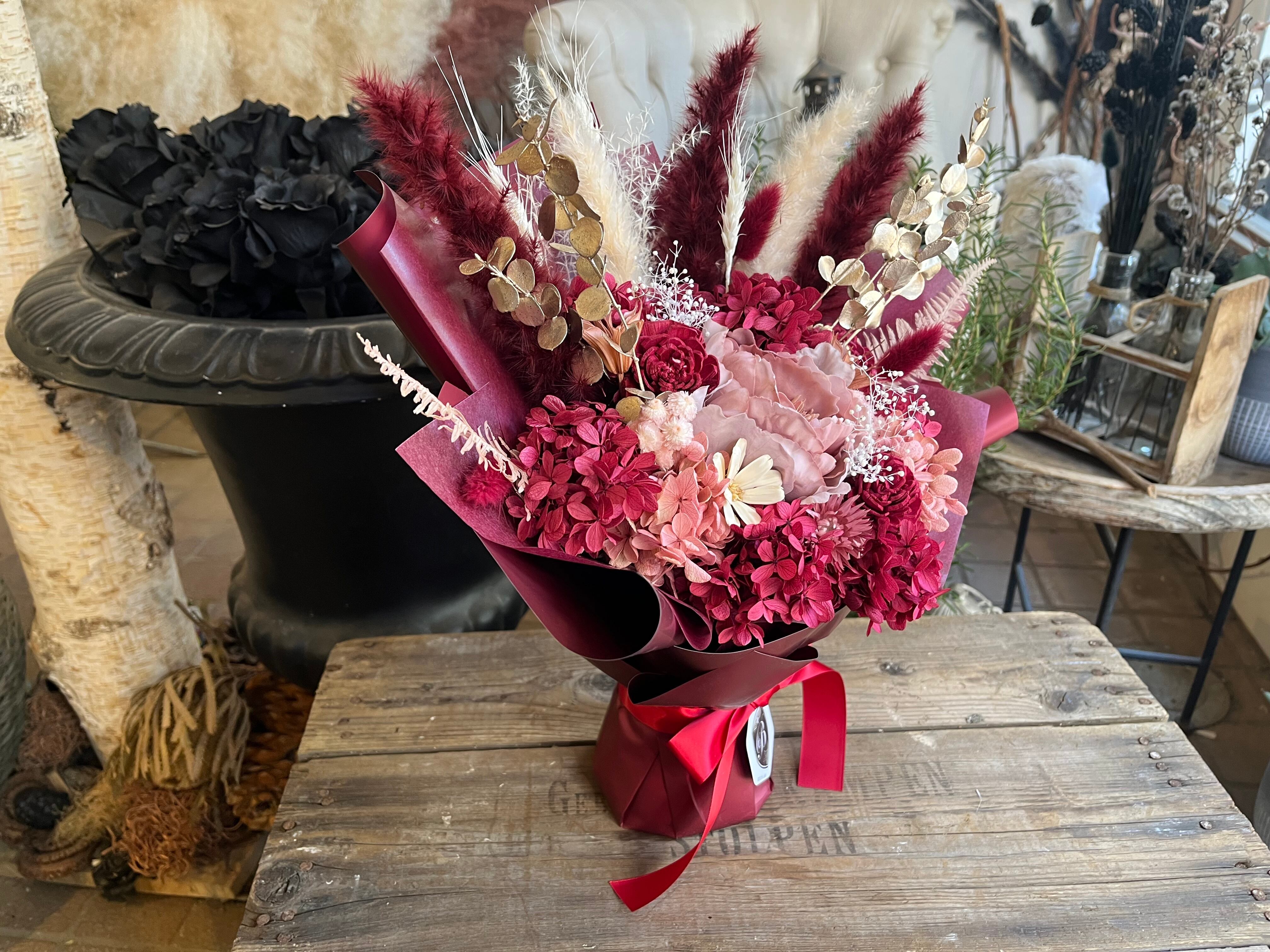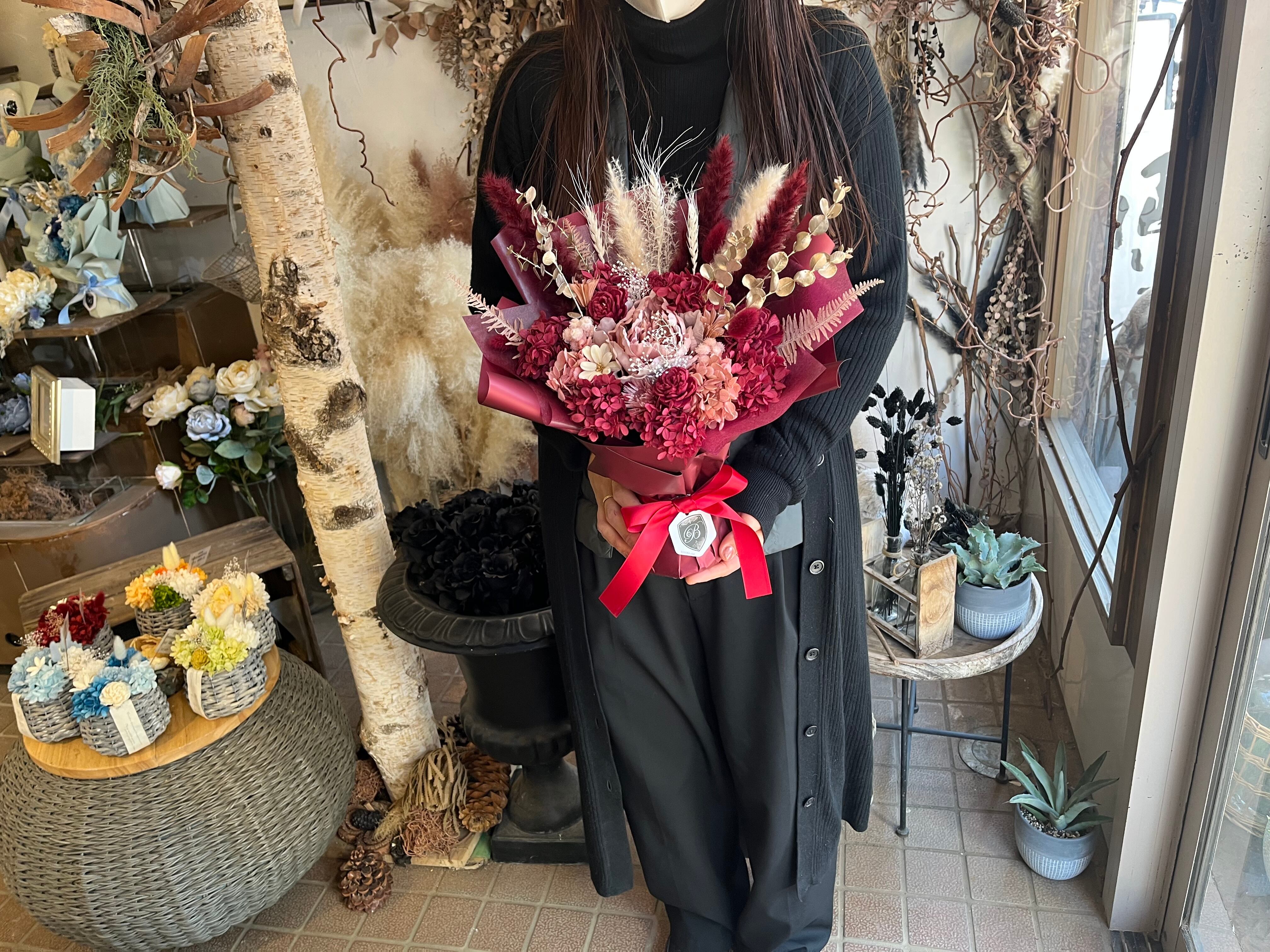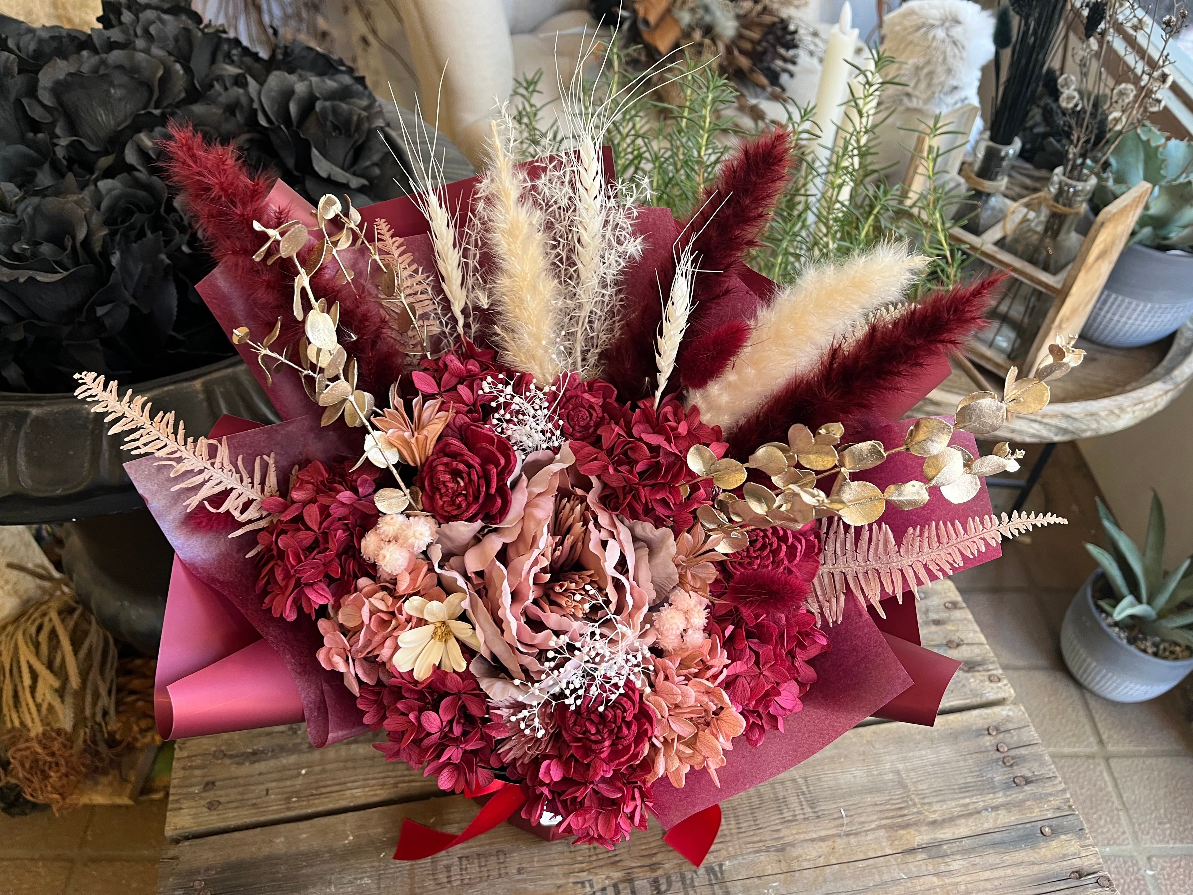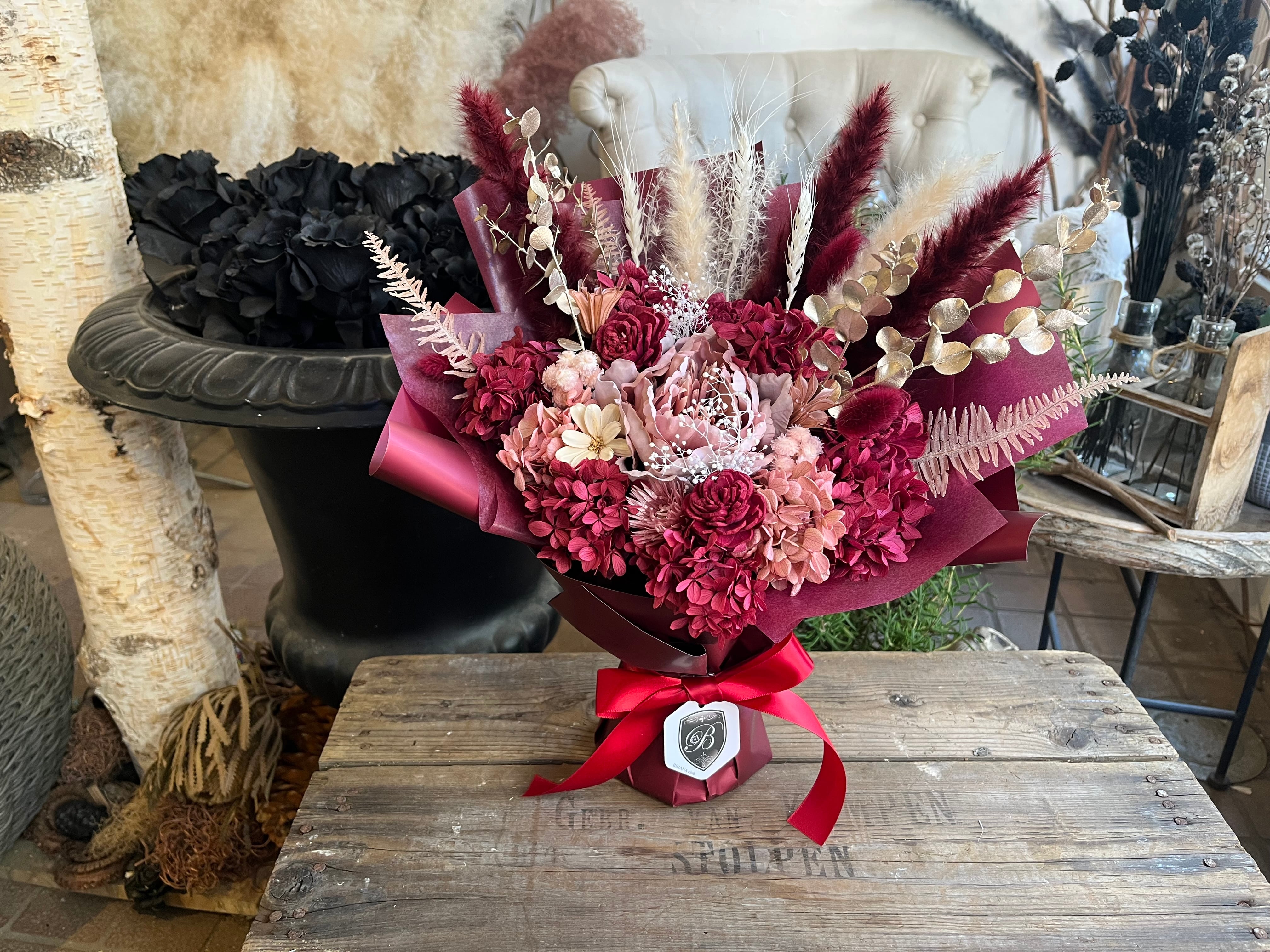 深みのあるカシスワイン色でまとめた、大人のためのプリザーブドフラワーブーケ。