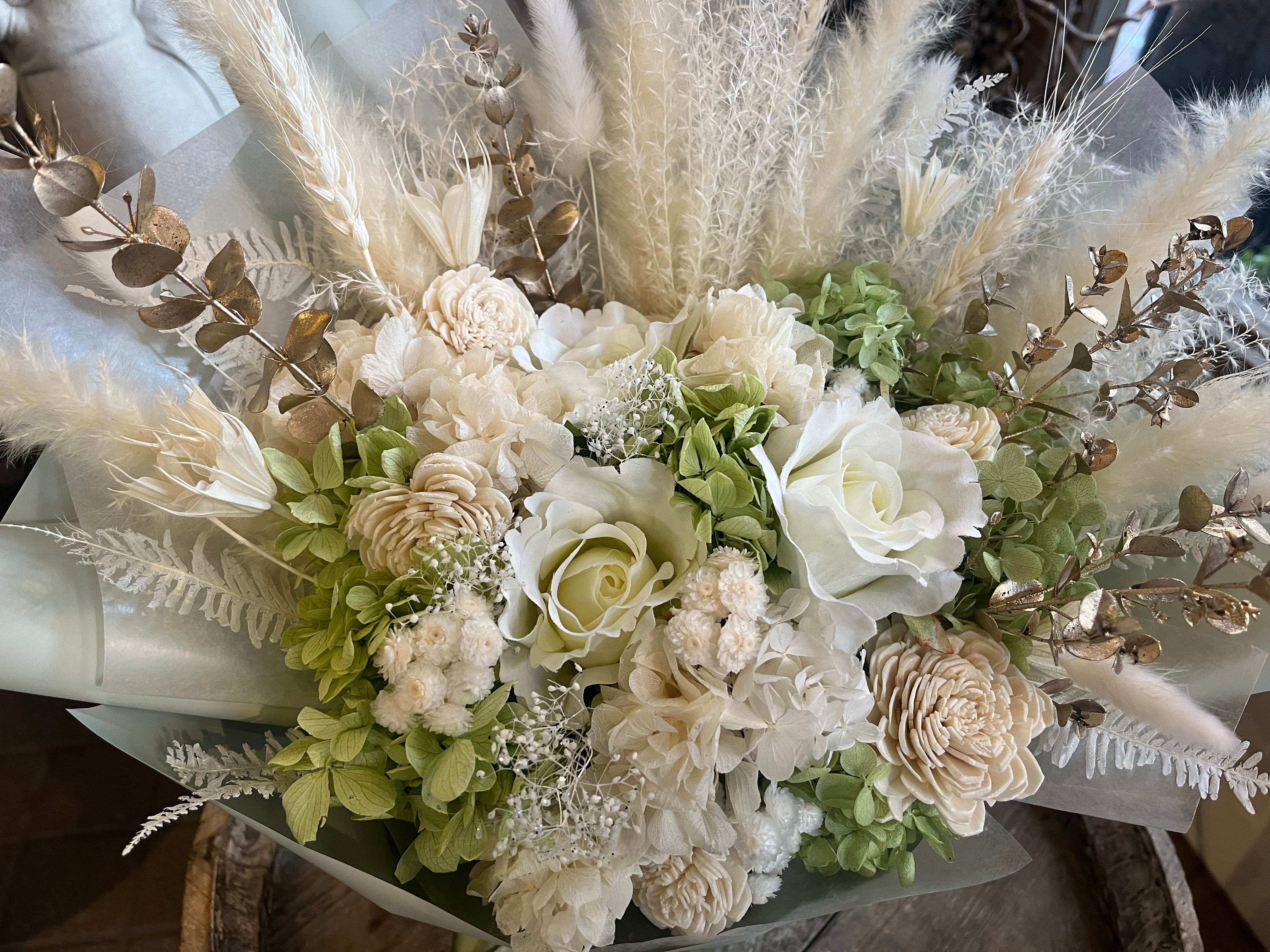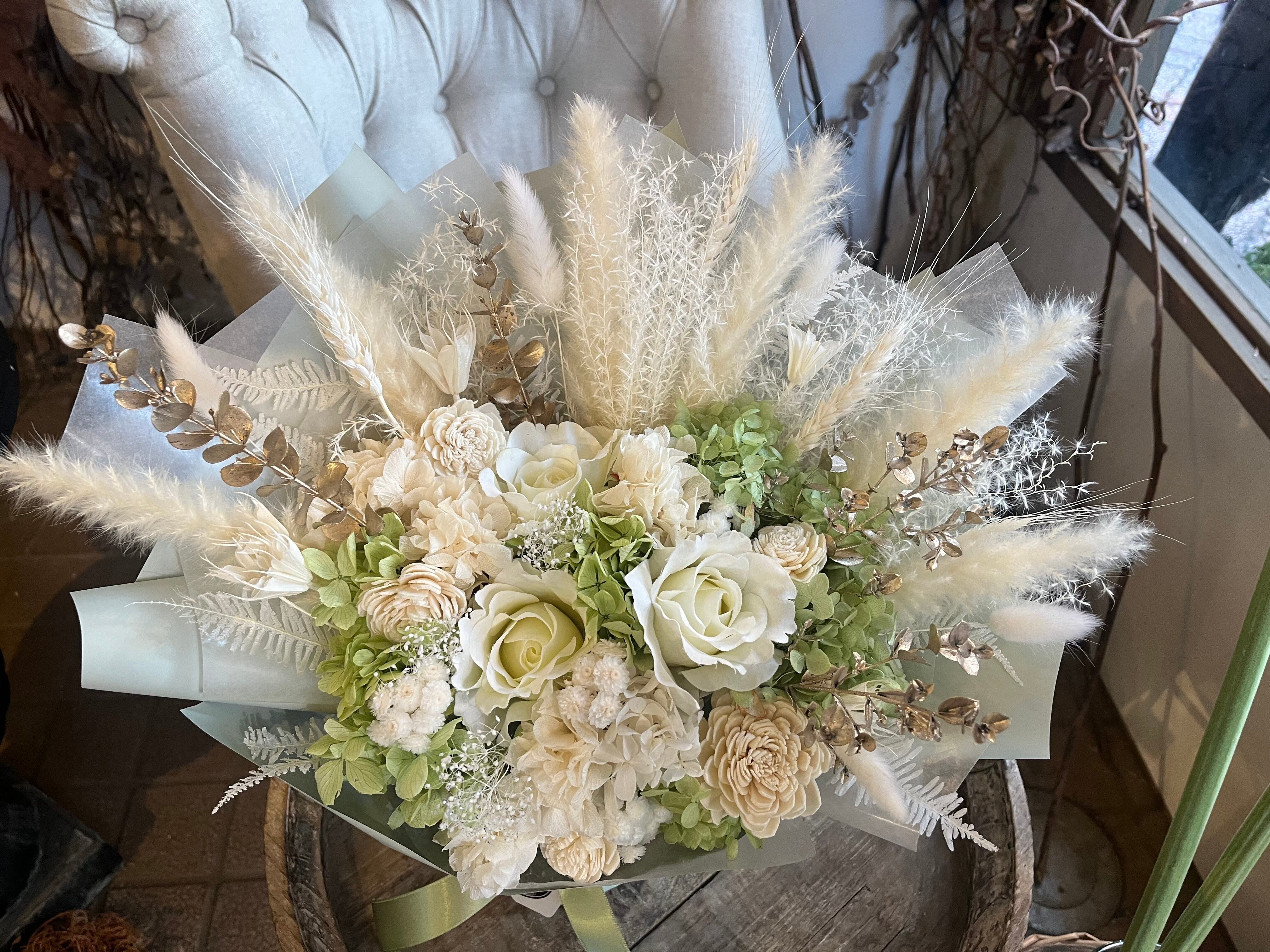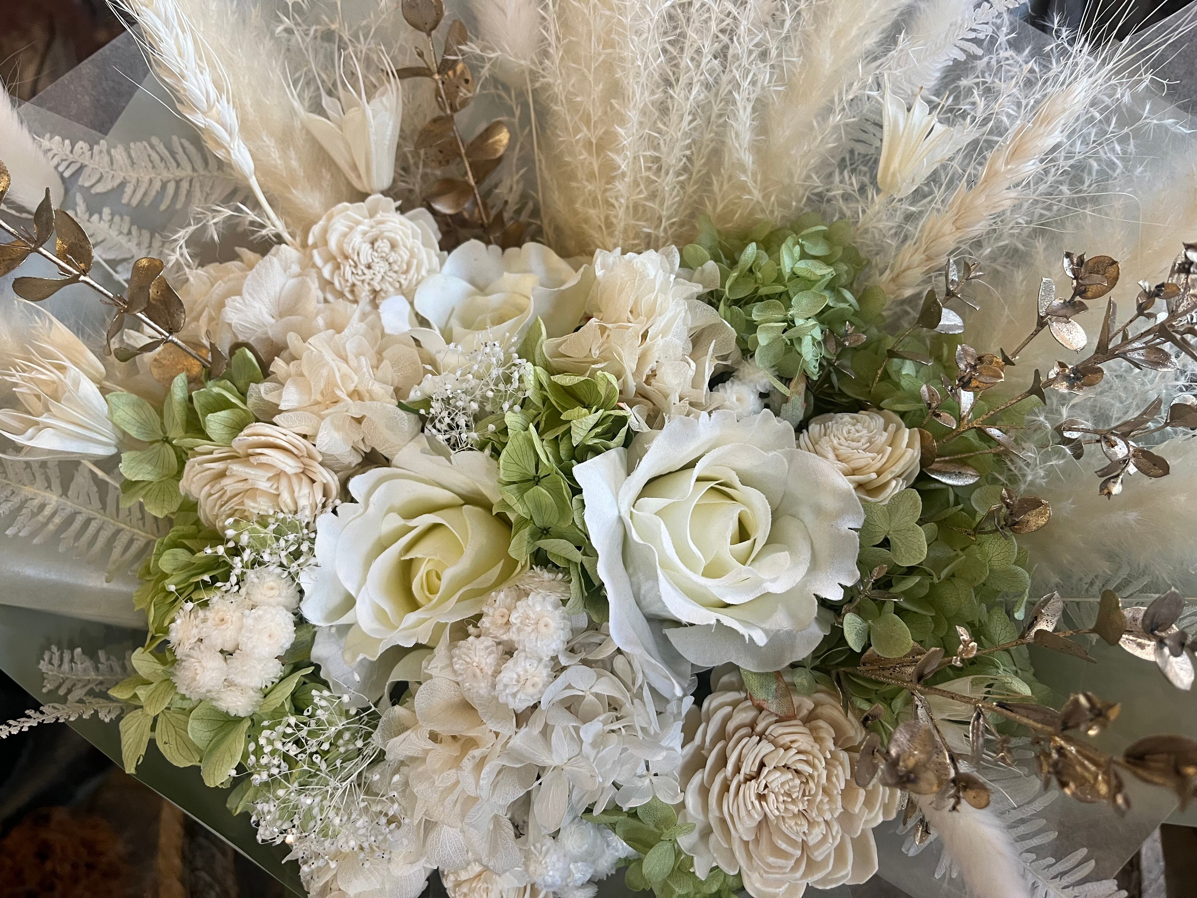 厳選された花材: あじさい、ラグラス、ラメ付のかすみそうなどのプリザーブドフラワーに加え、木の皮から作られたソーラーローズや、生花のような美しさを持つ高級造花(薔薇)を厳選し、贅沢に使用しています。