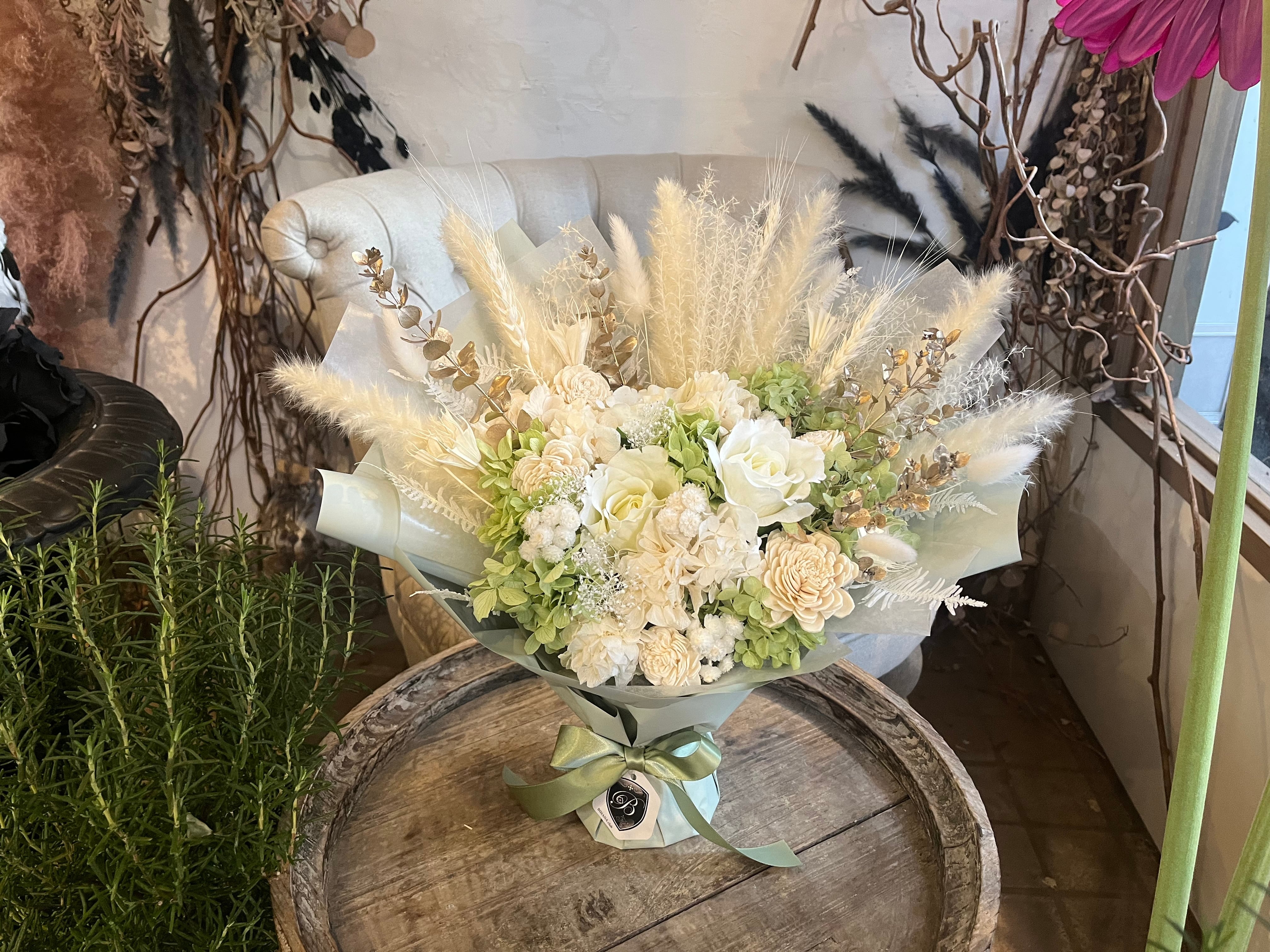 自立型の花束なので花瓶不要、水やりもいらず長く楽しめます。