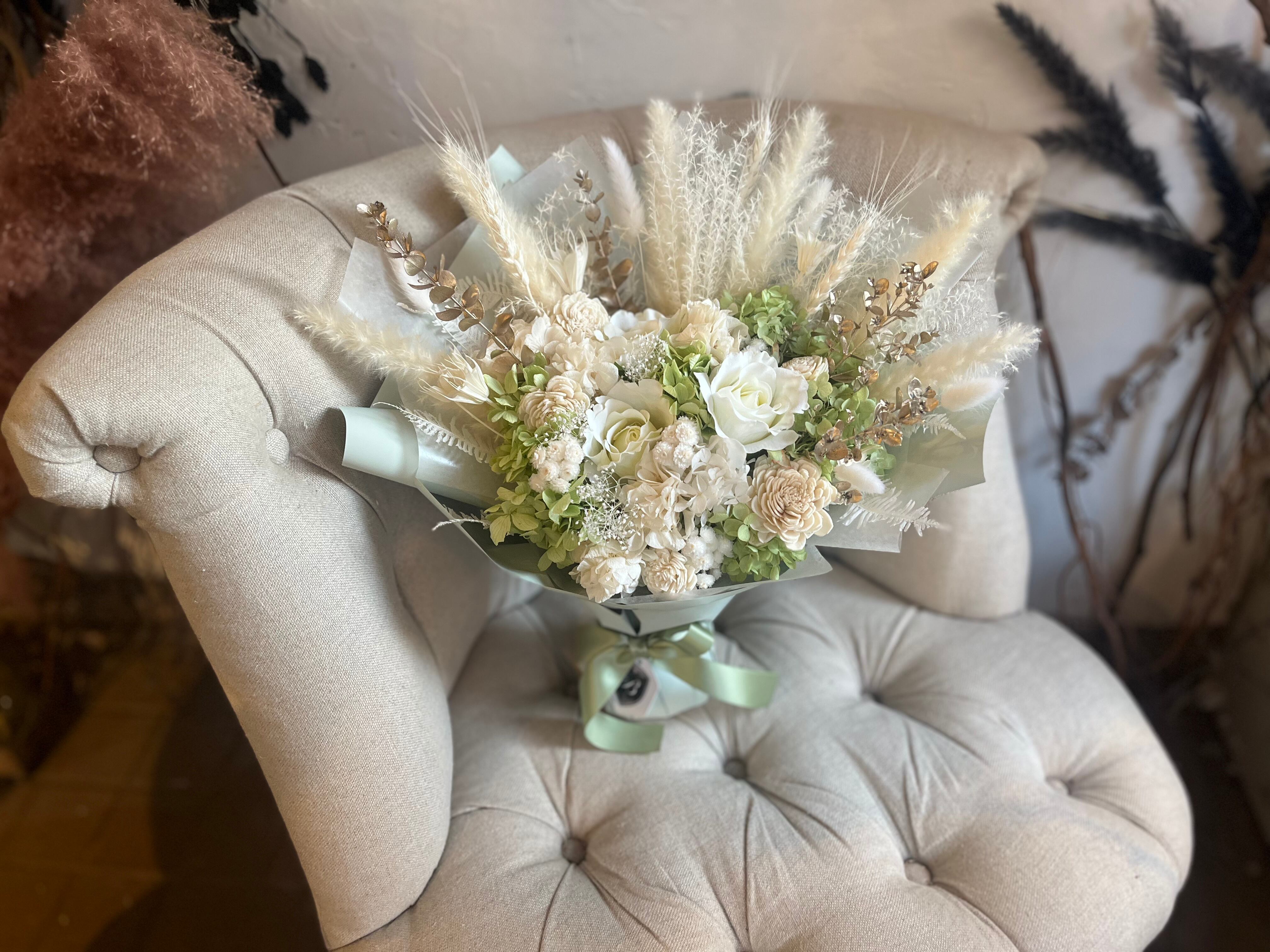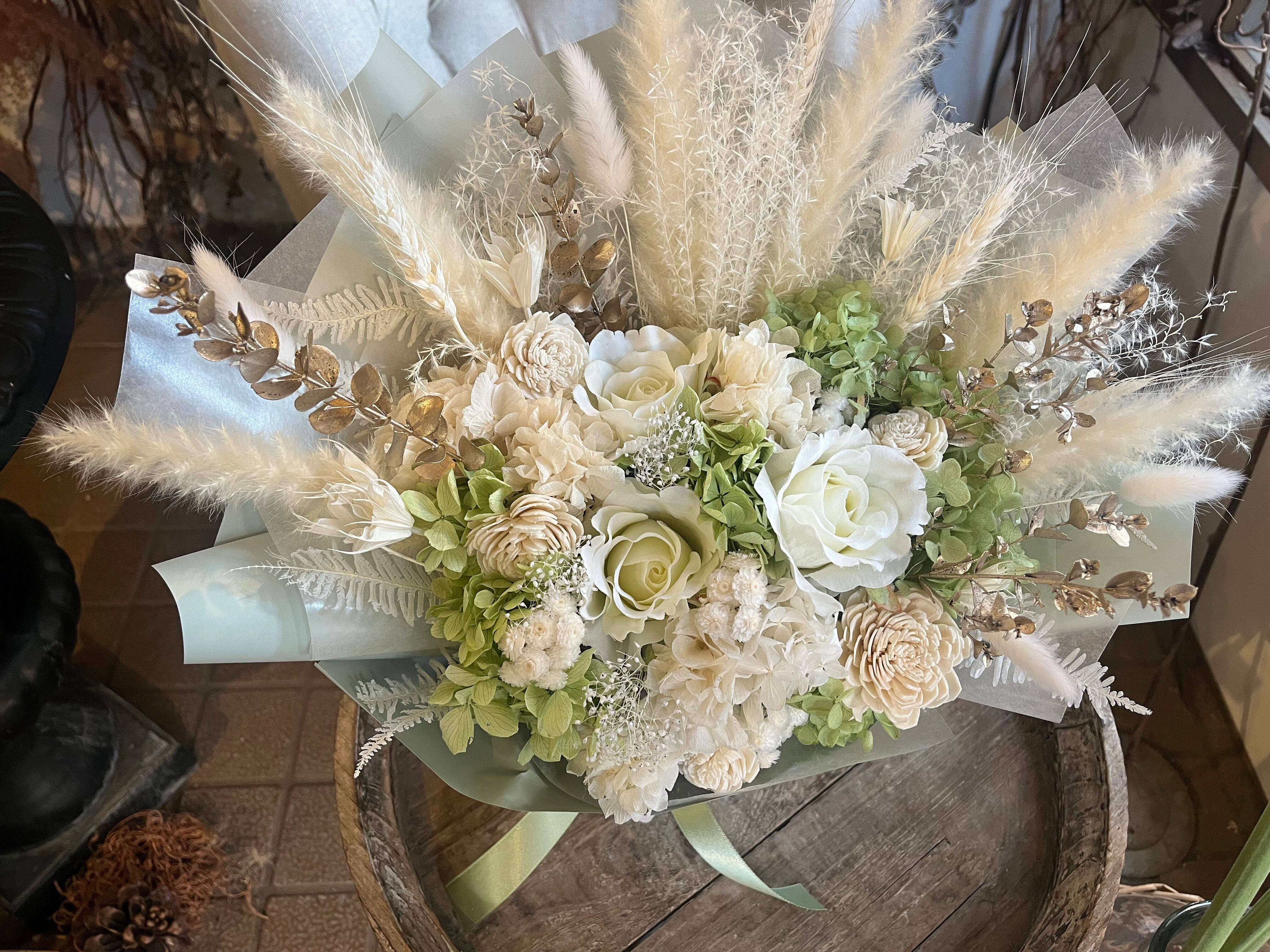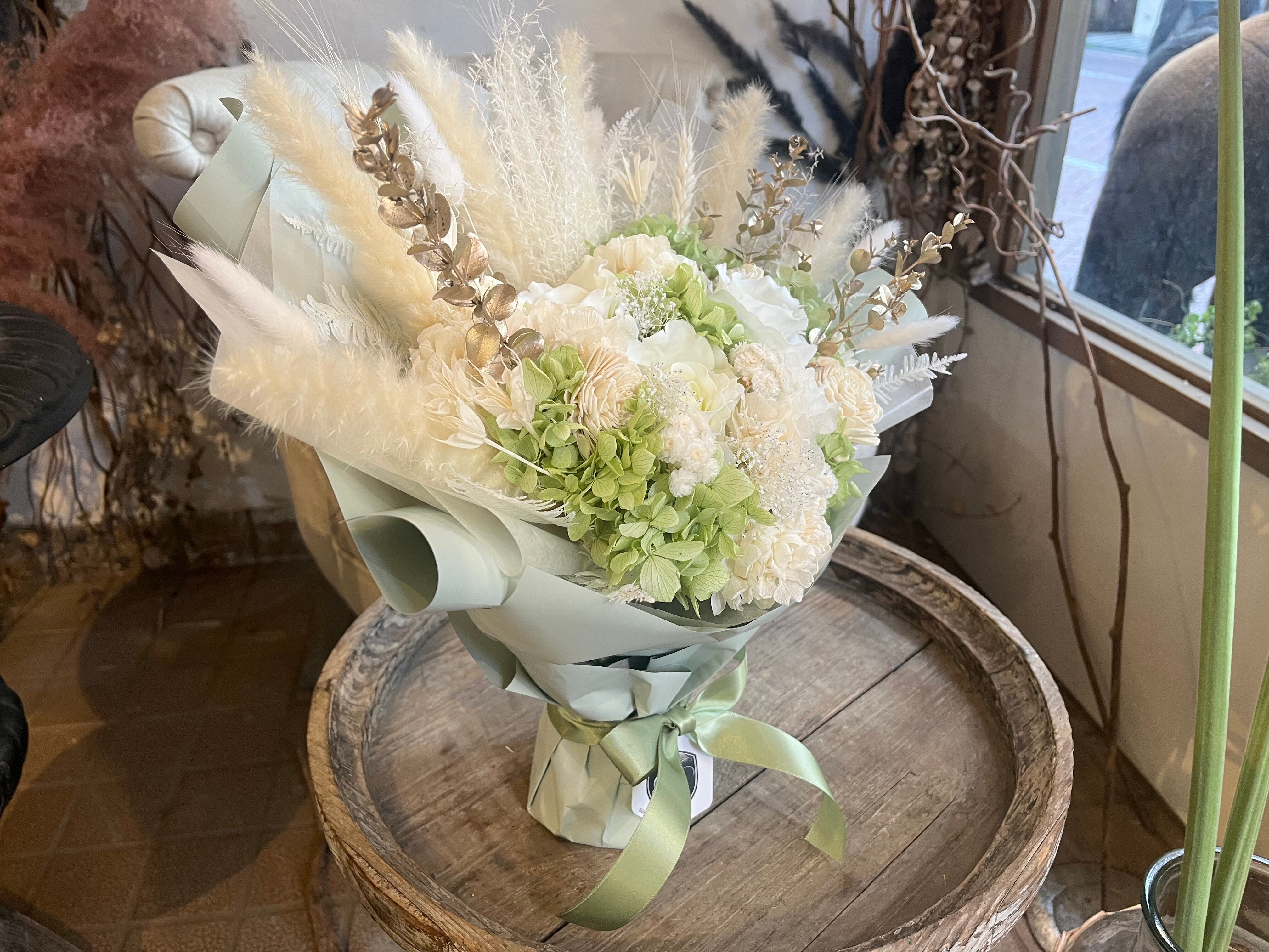 やわらかなグリーンを基調にした、プリザーブドフラワーのスタンディングブーケです。