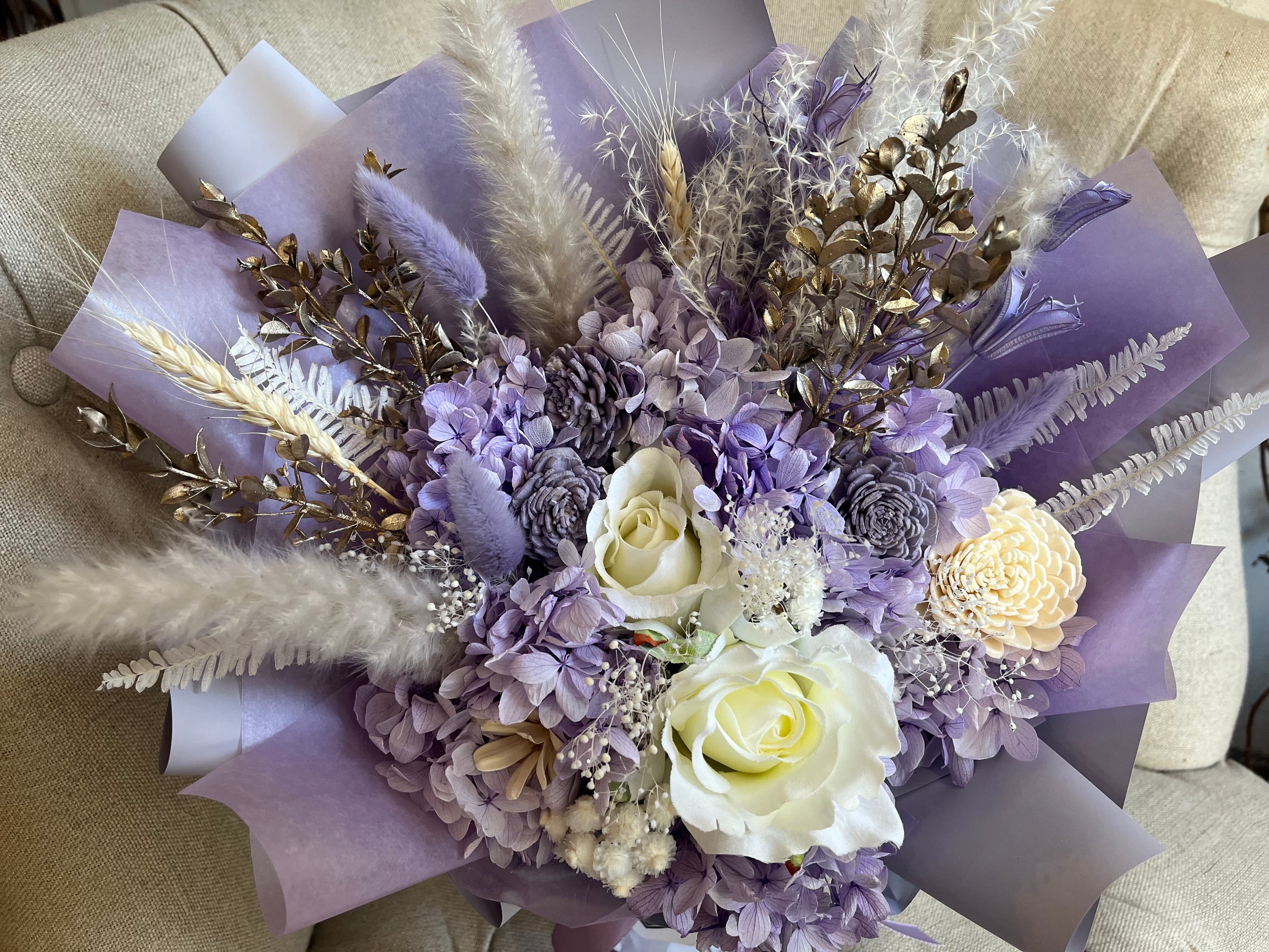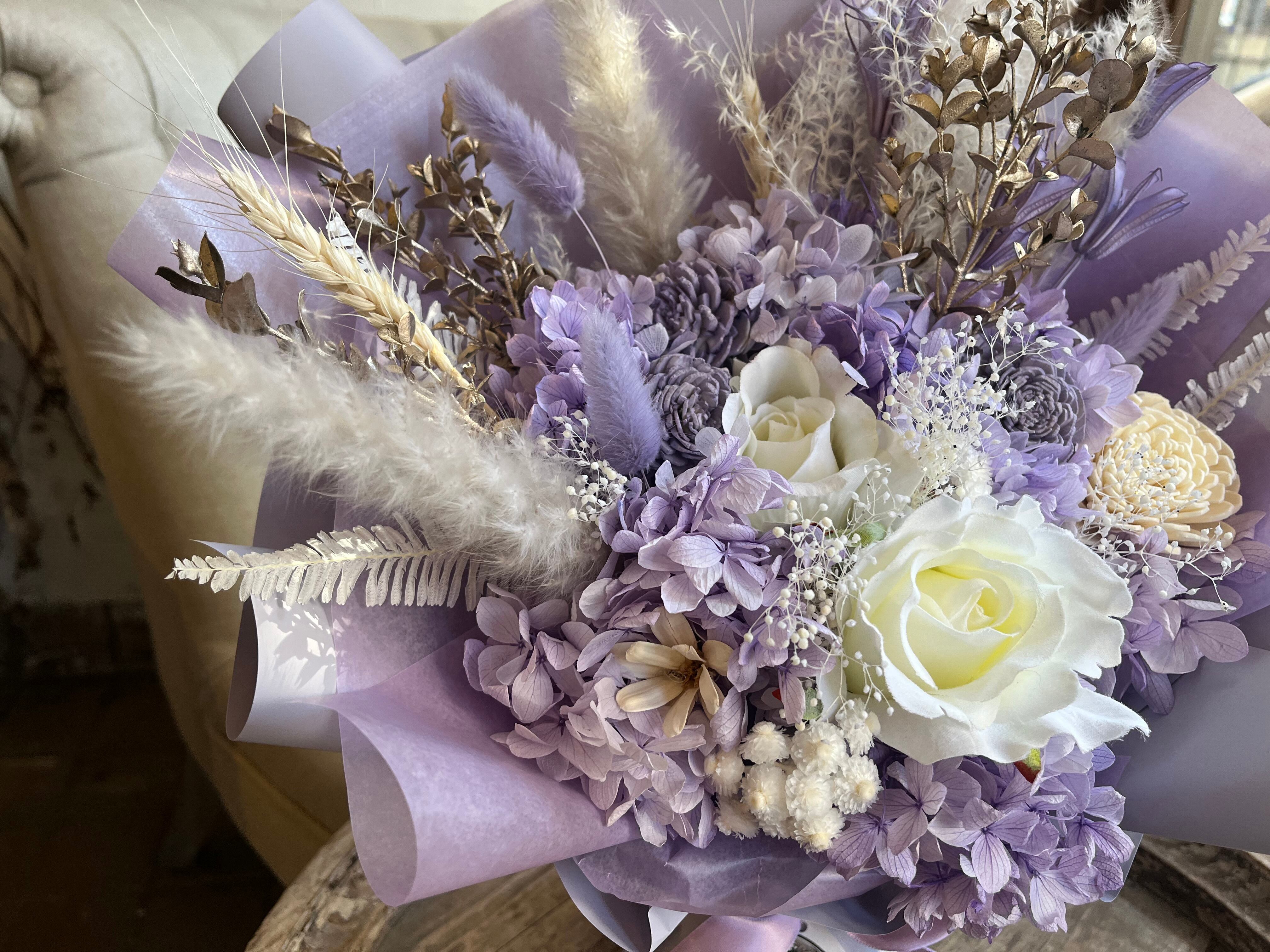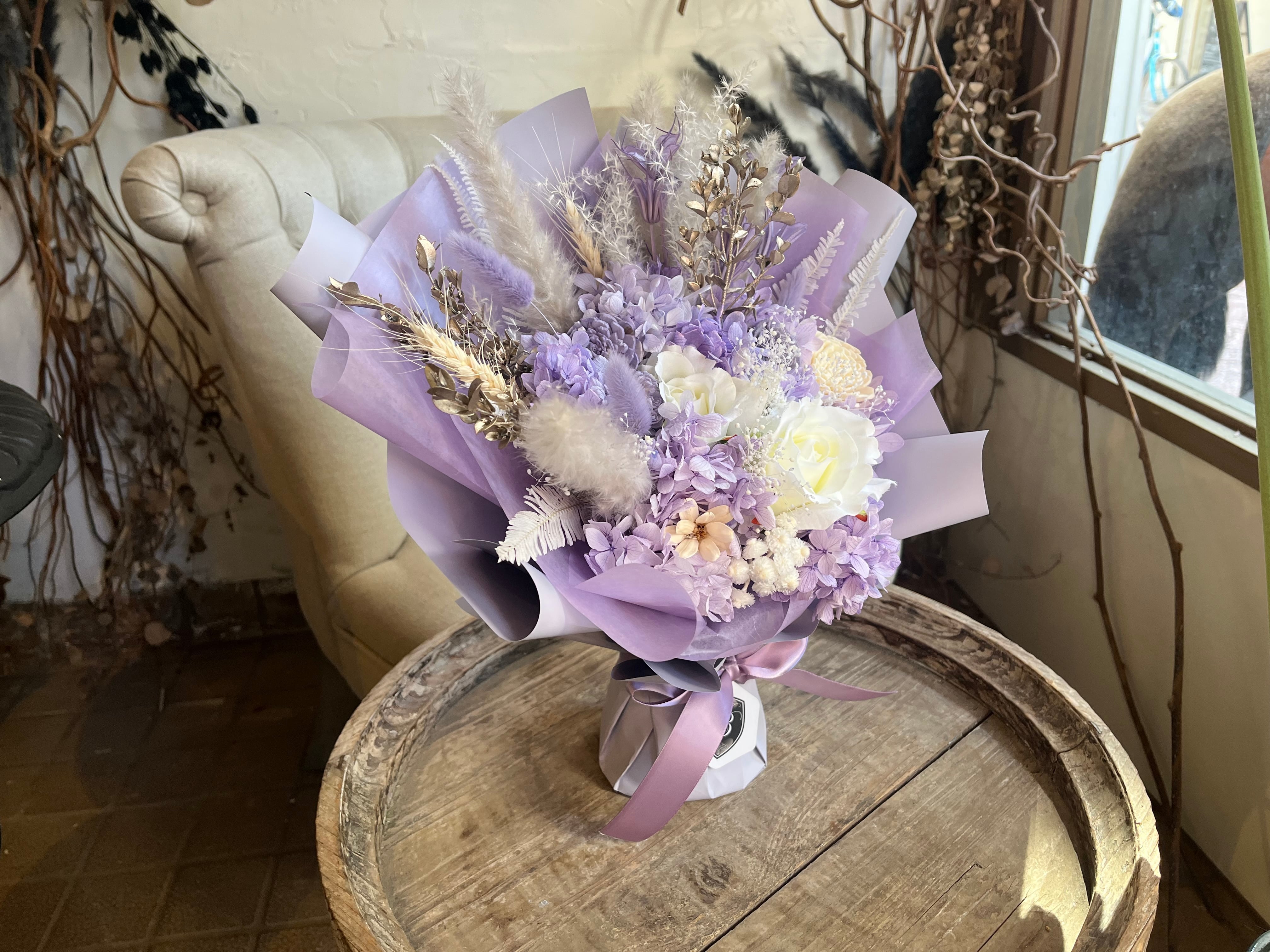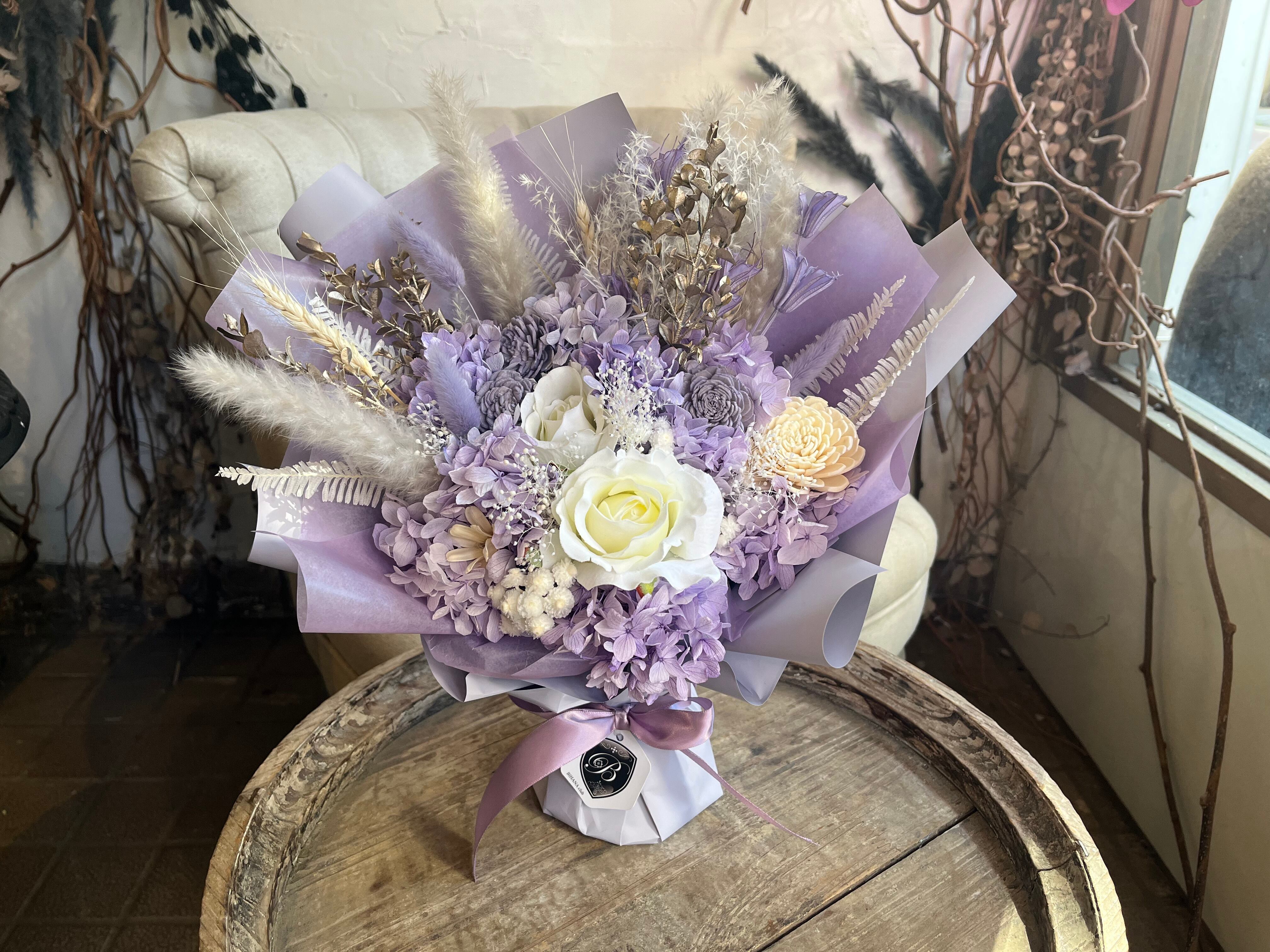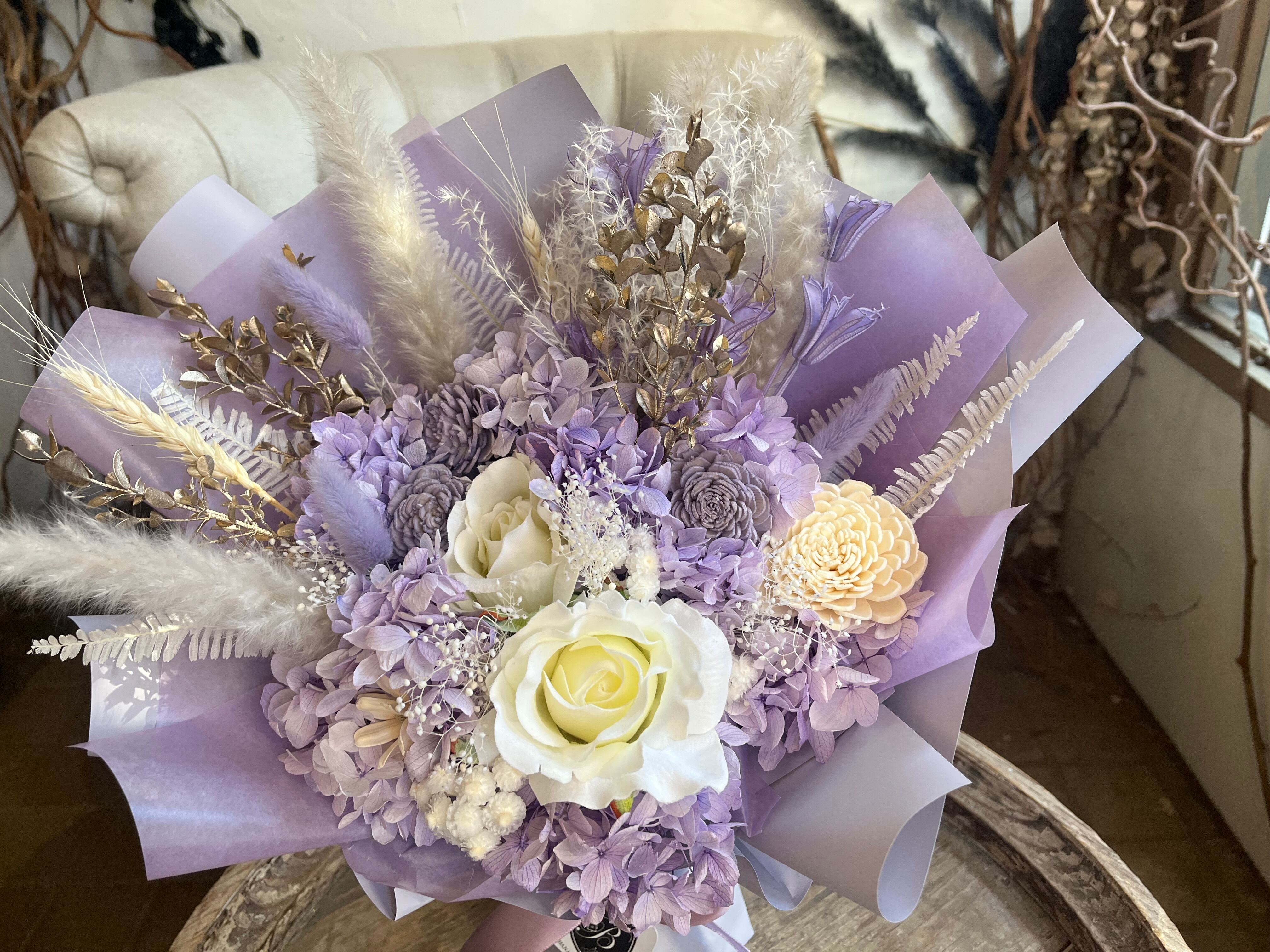 やさしいライラックカラーでまとめた、プリザーブドフラワーのスタンディングブーケです。