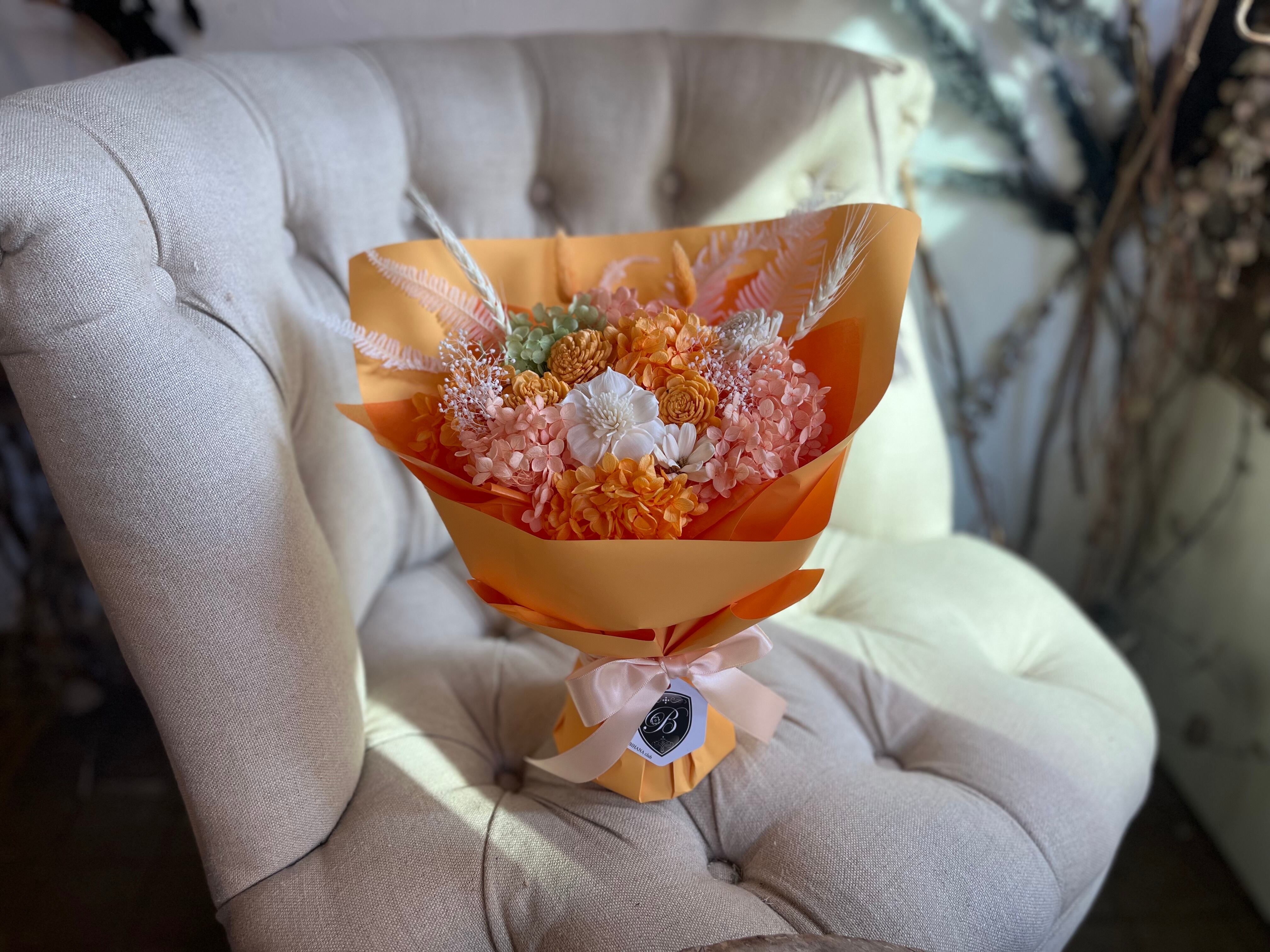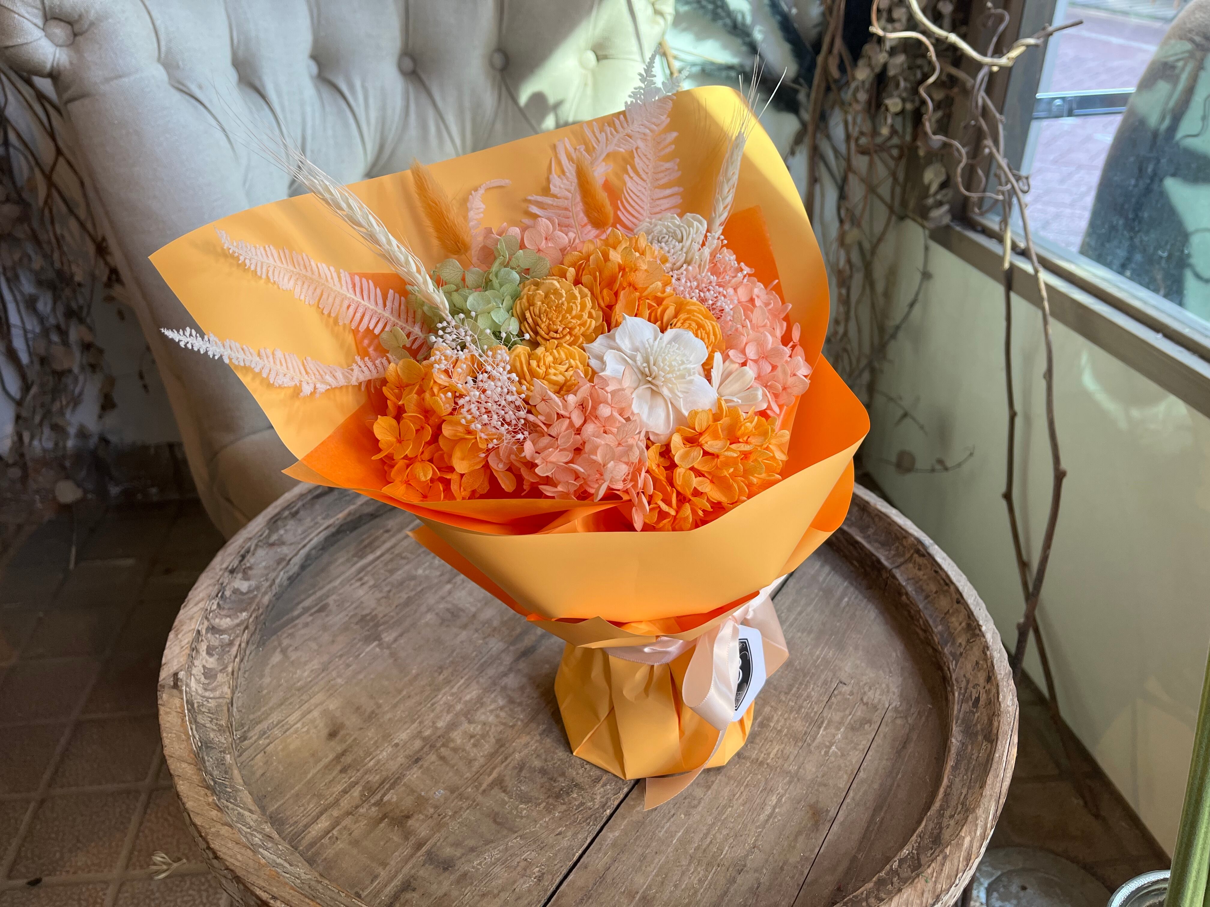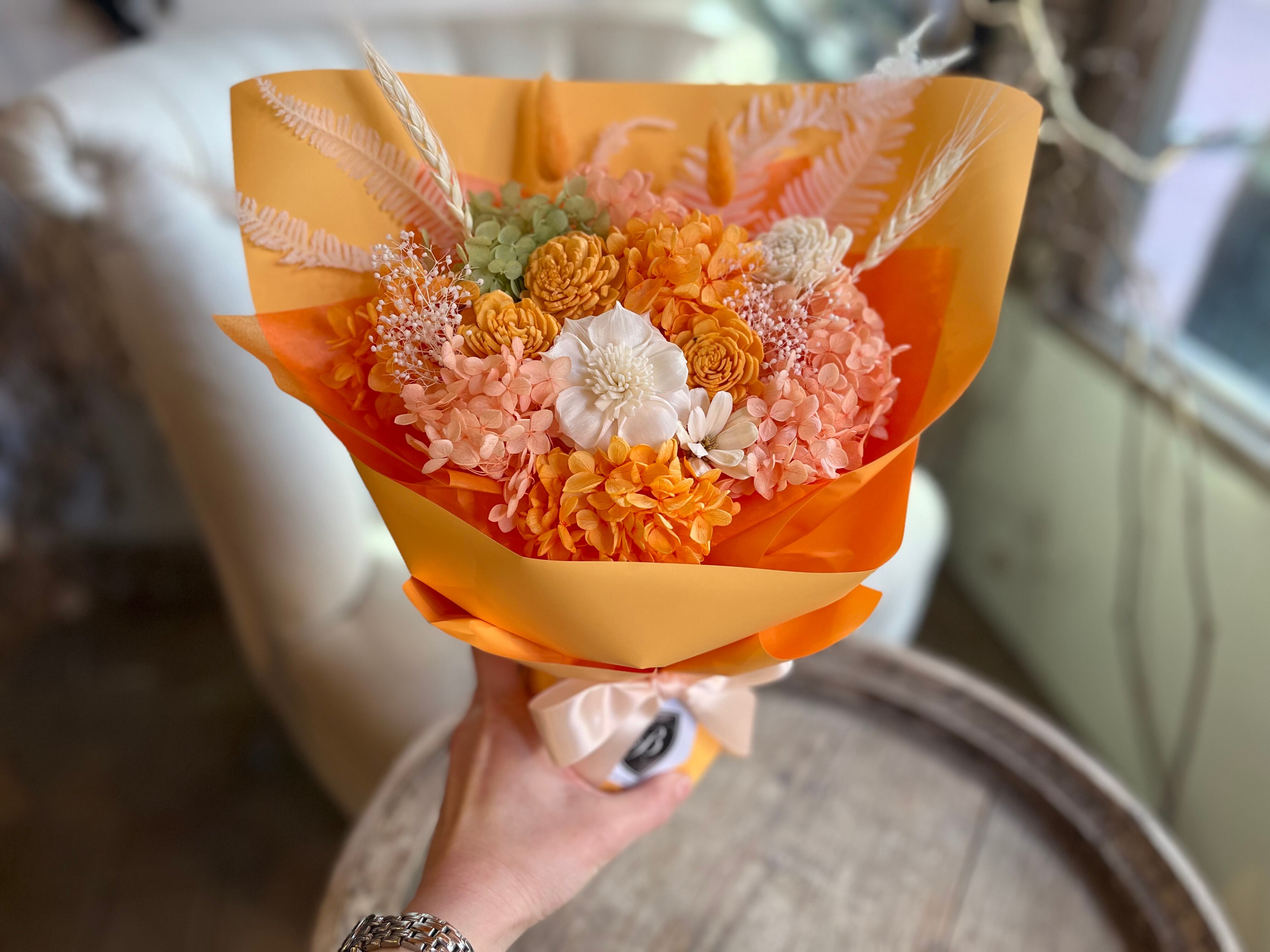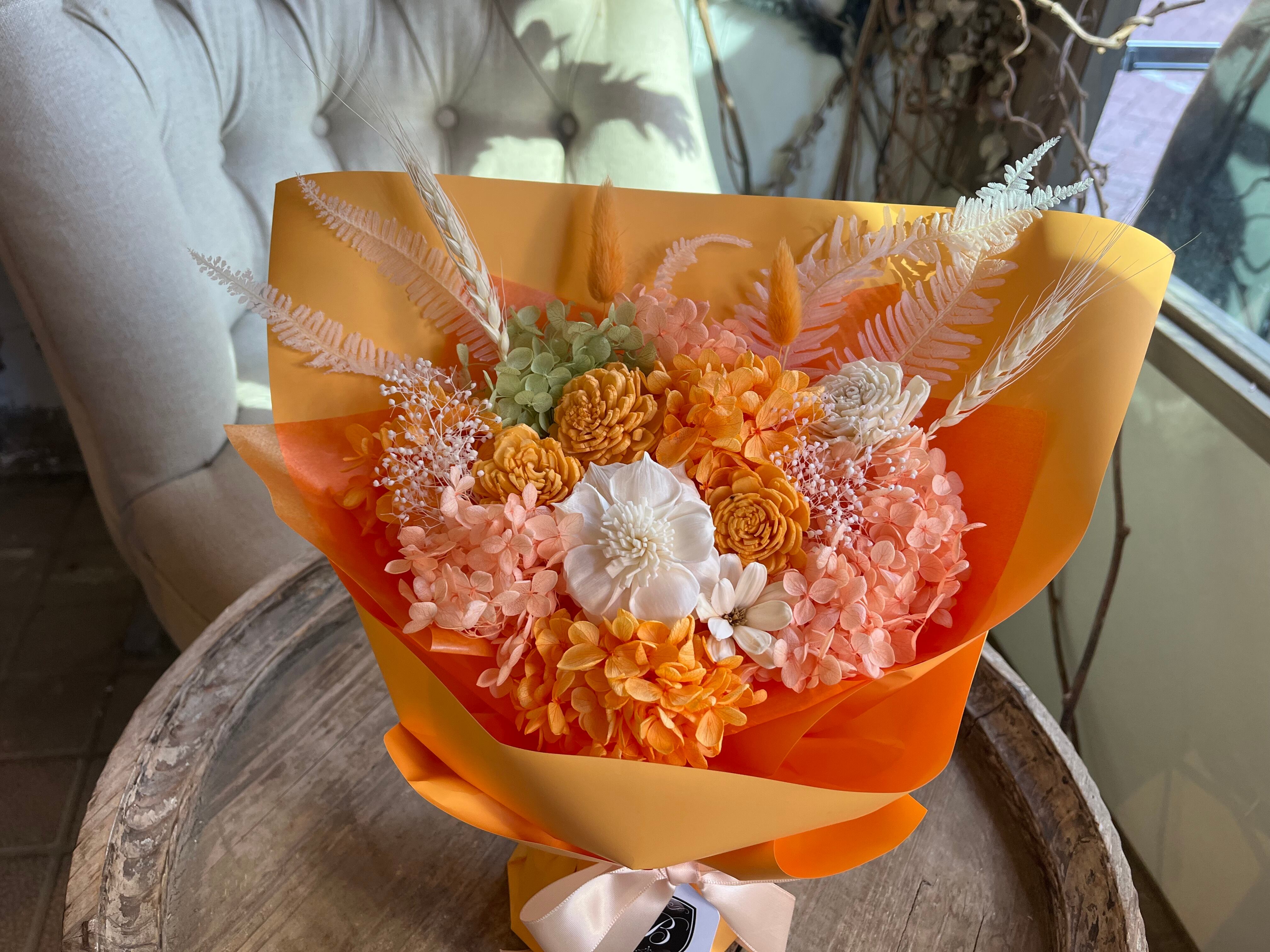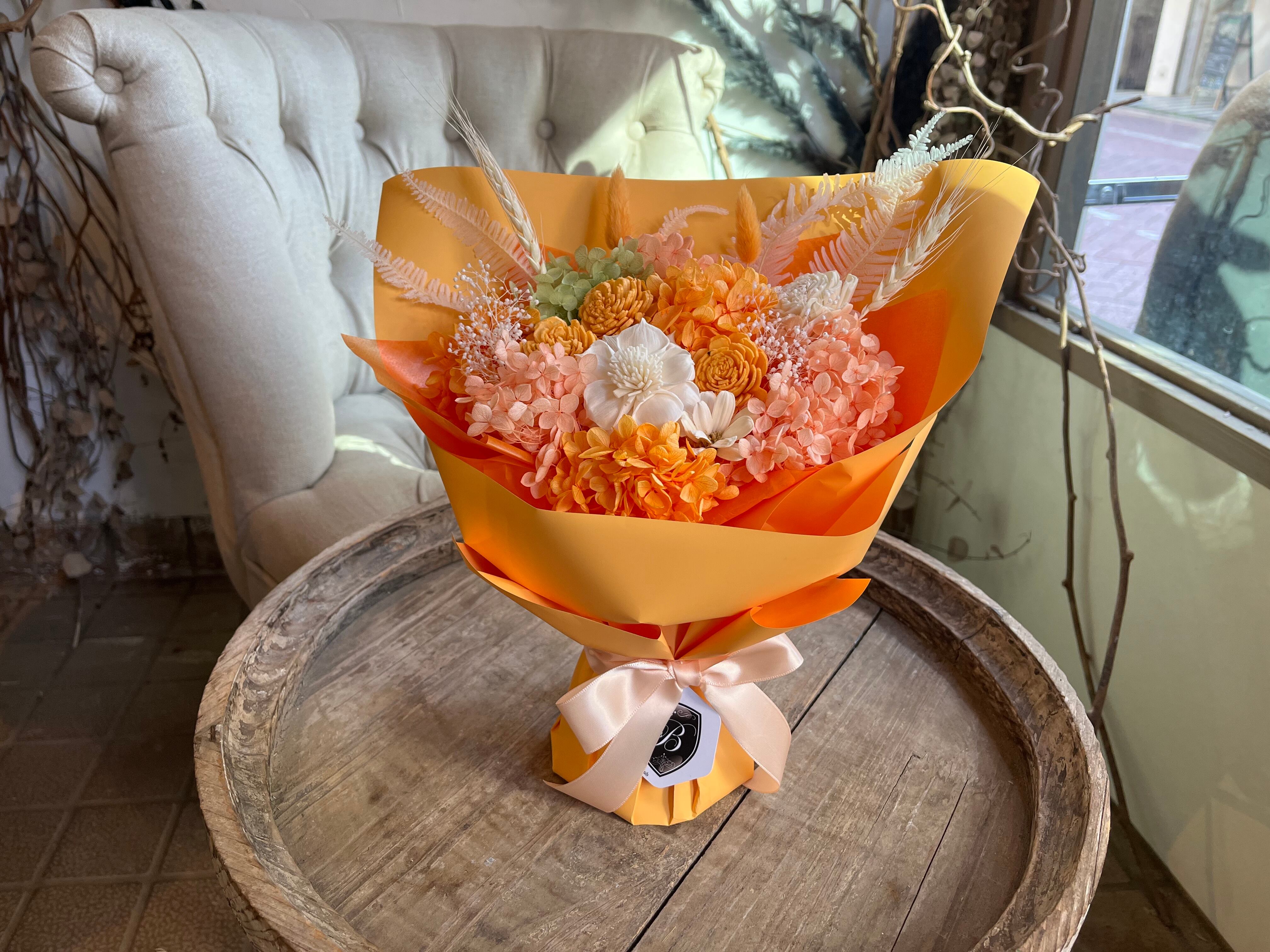 花瓶不要でそのまま飾れる プリザーブドフラワー花束|スタンディングブーケ オレンジ2 Mサイズ|誕生日 退職 卒業 還暦祝い 送別ギフト