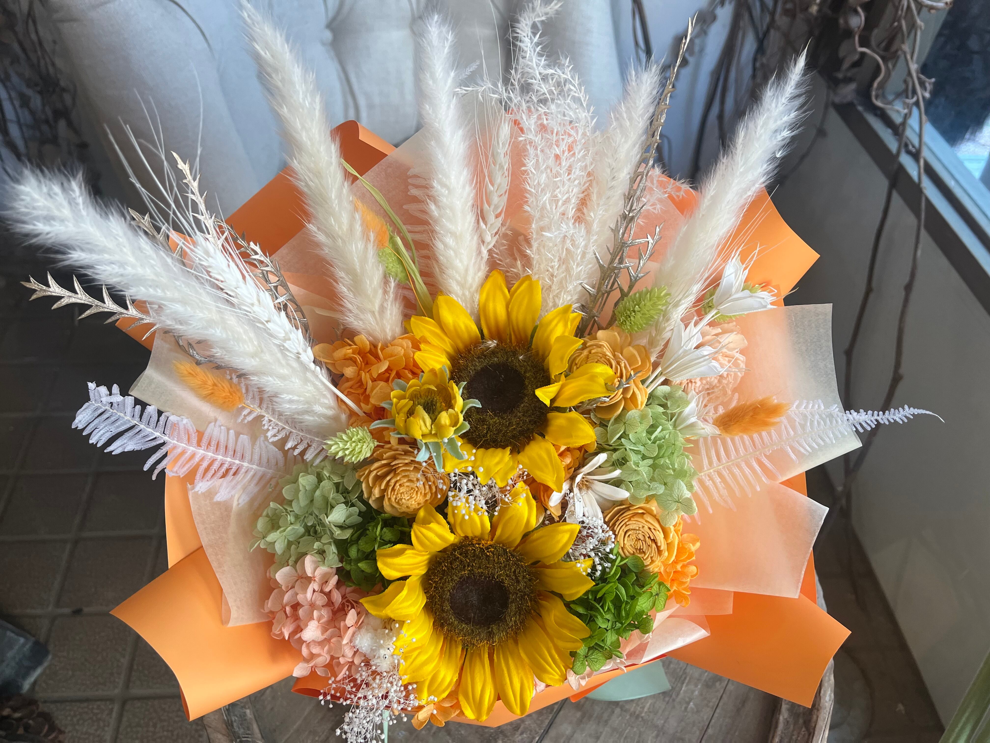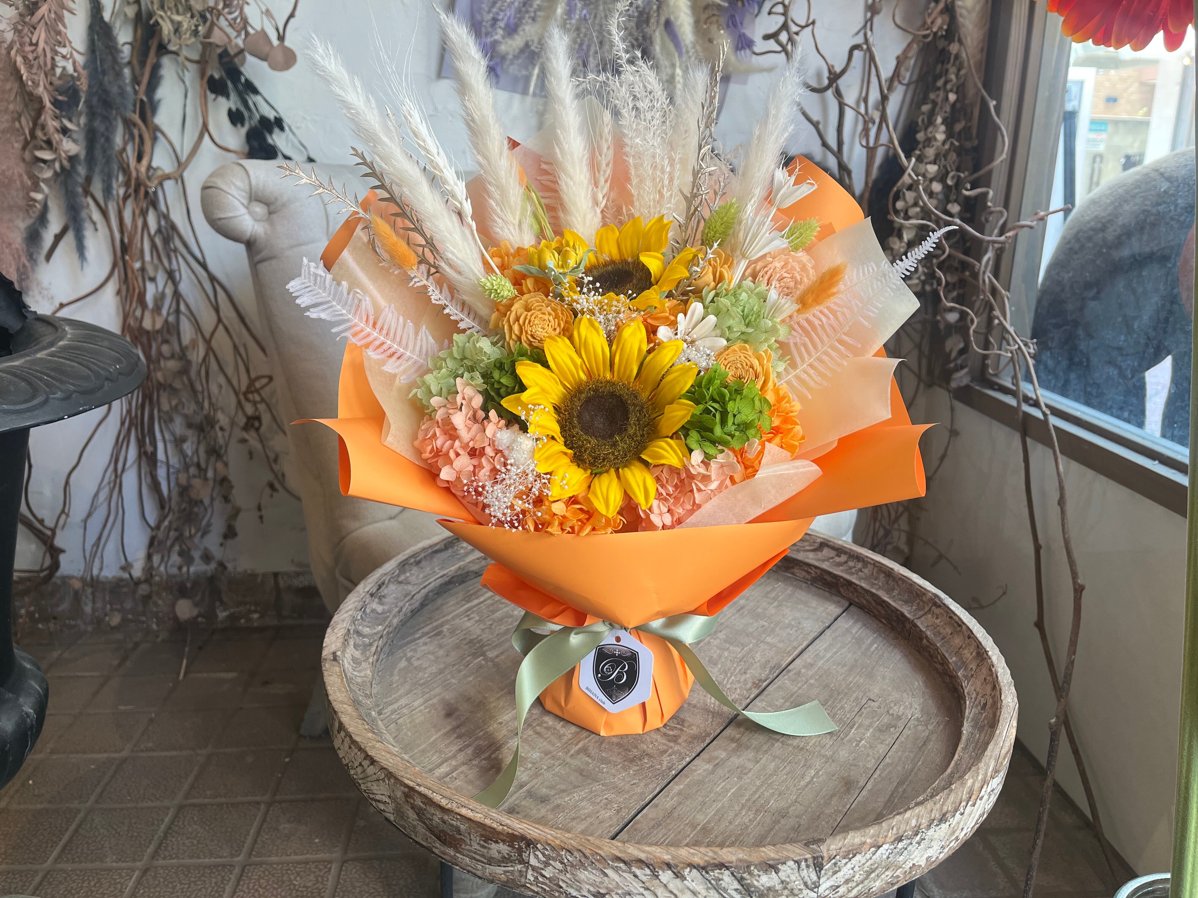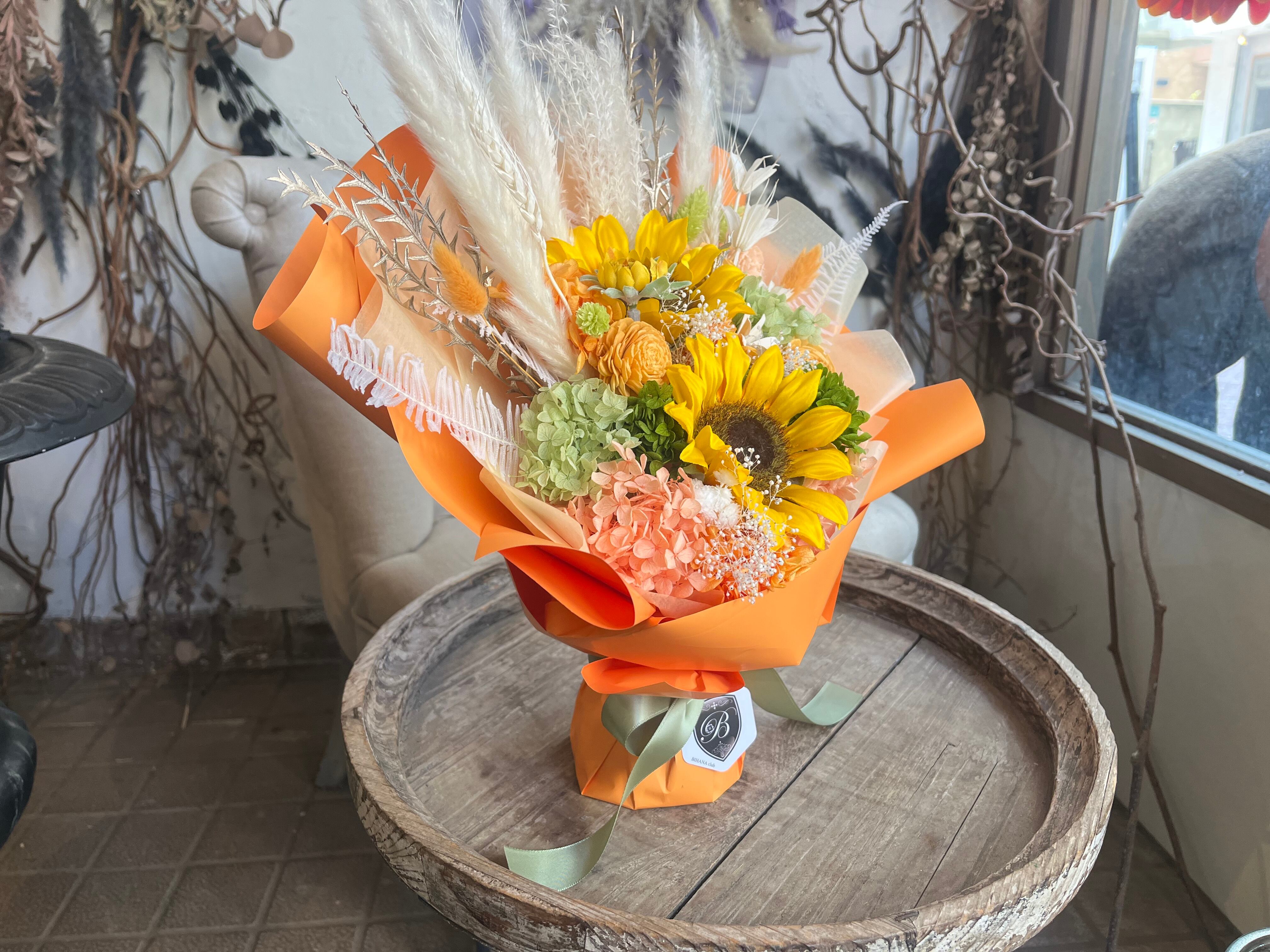 プリザーブドフラワー 花束 ギフト|スタンディングブーケ(自立型・花瓶不要)ひまわりオレンジ|誕生日・夏生まれの贈り物に