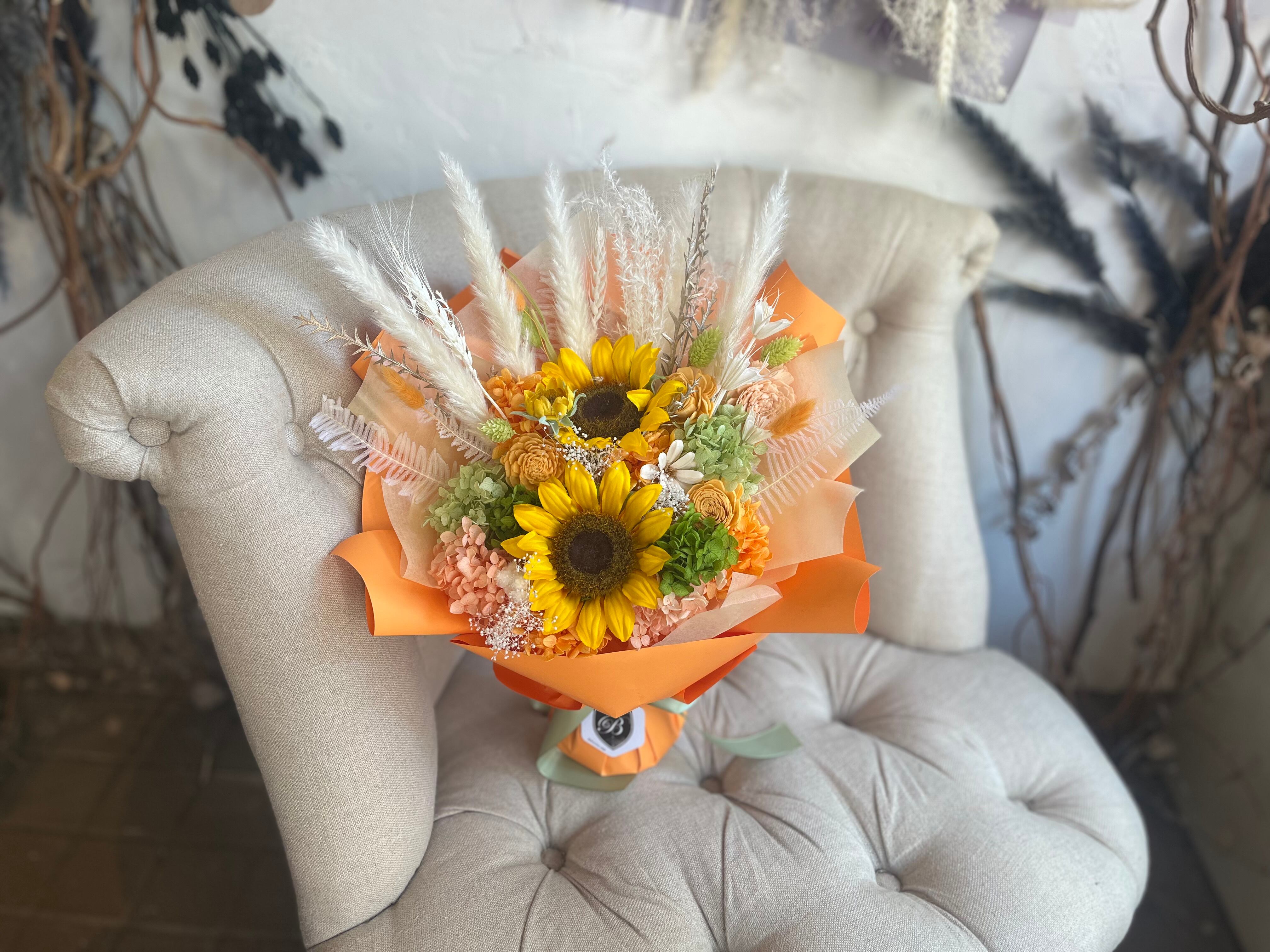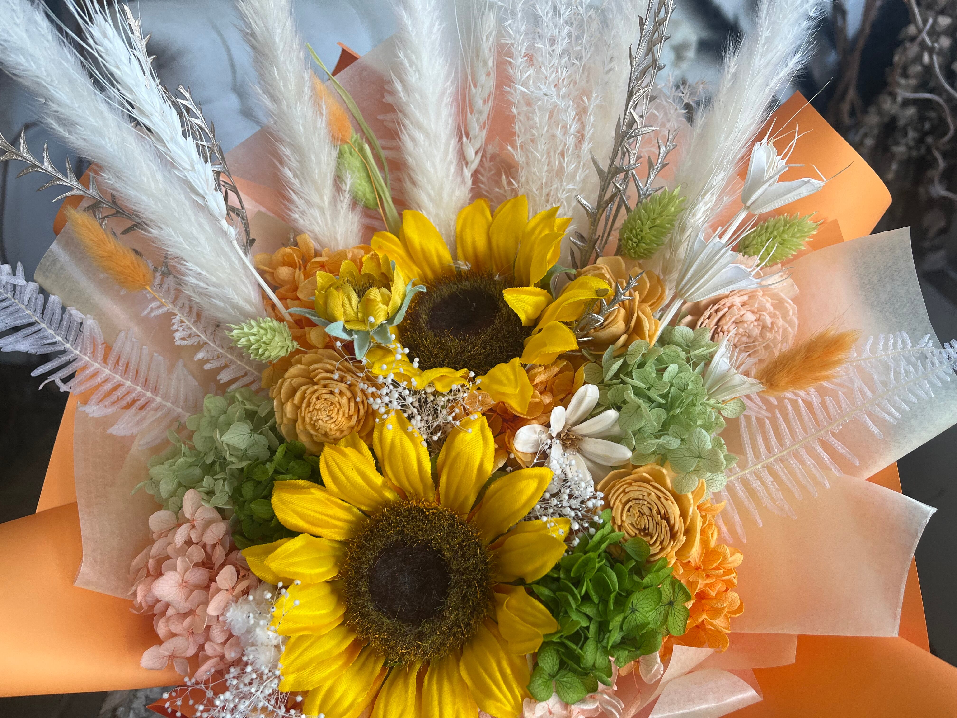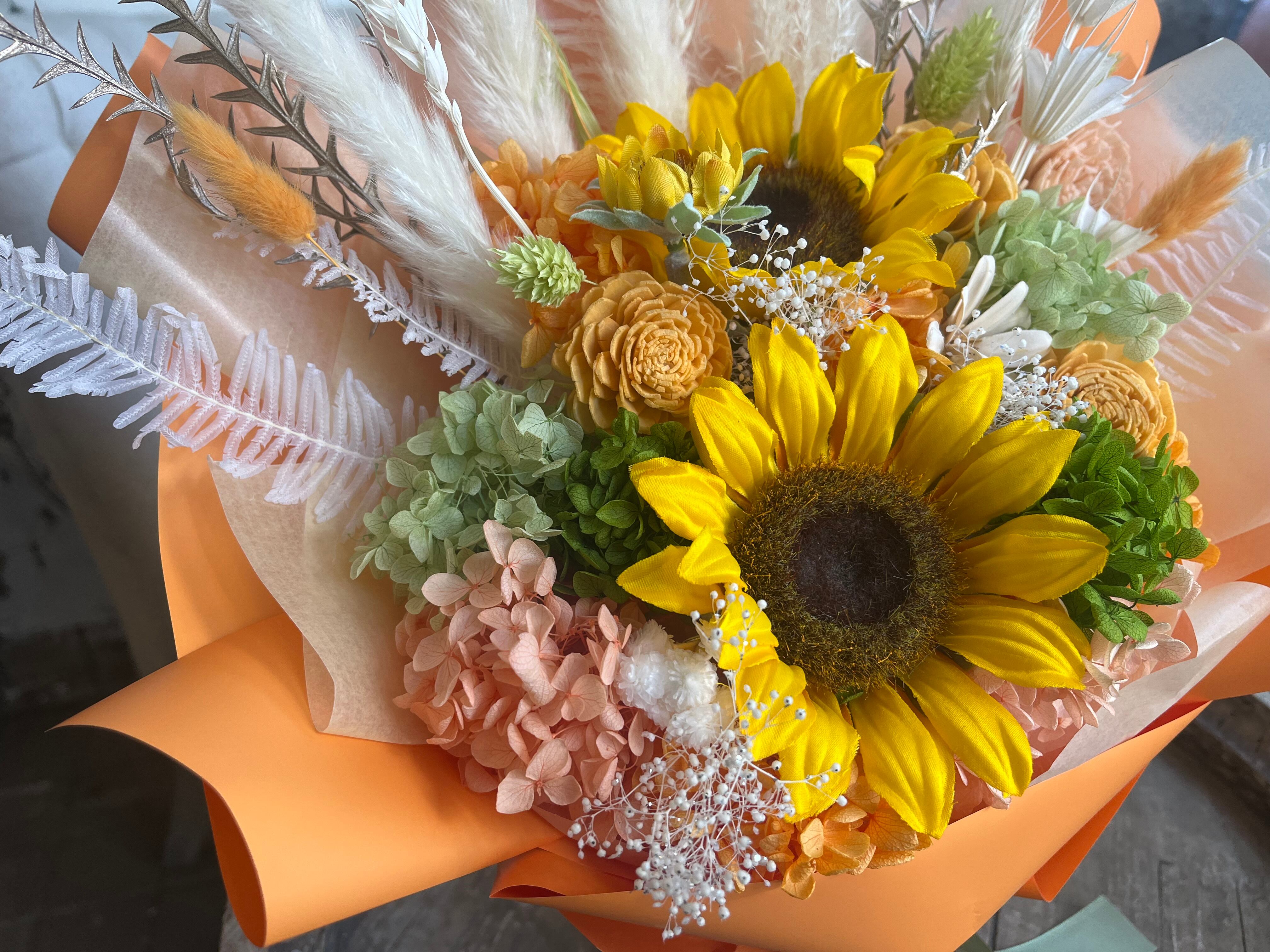 プリザーブドフラワー 花束 ギフト|スタンディングブーケ(自立型・花瓶不要)ひまわりオレンジ|誕生日・夏生まれの贈り物に
