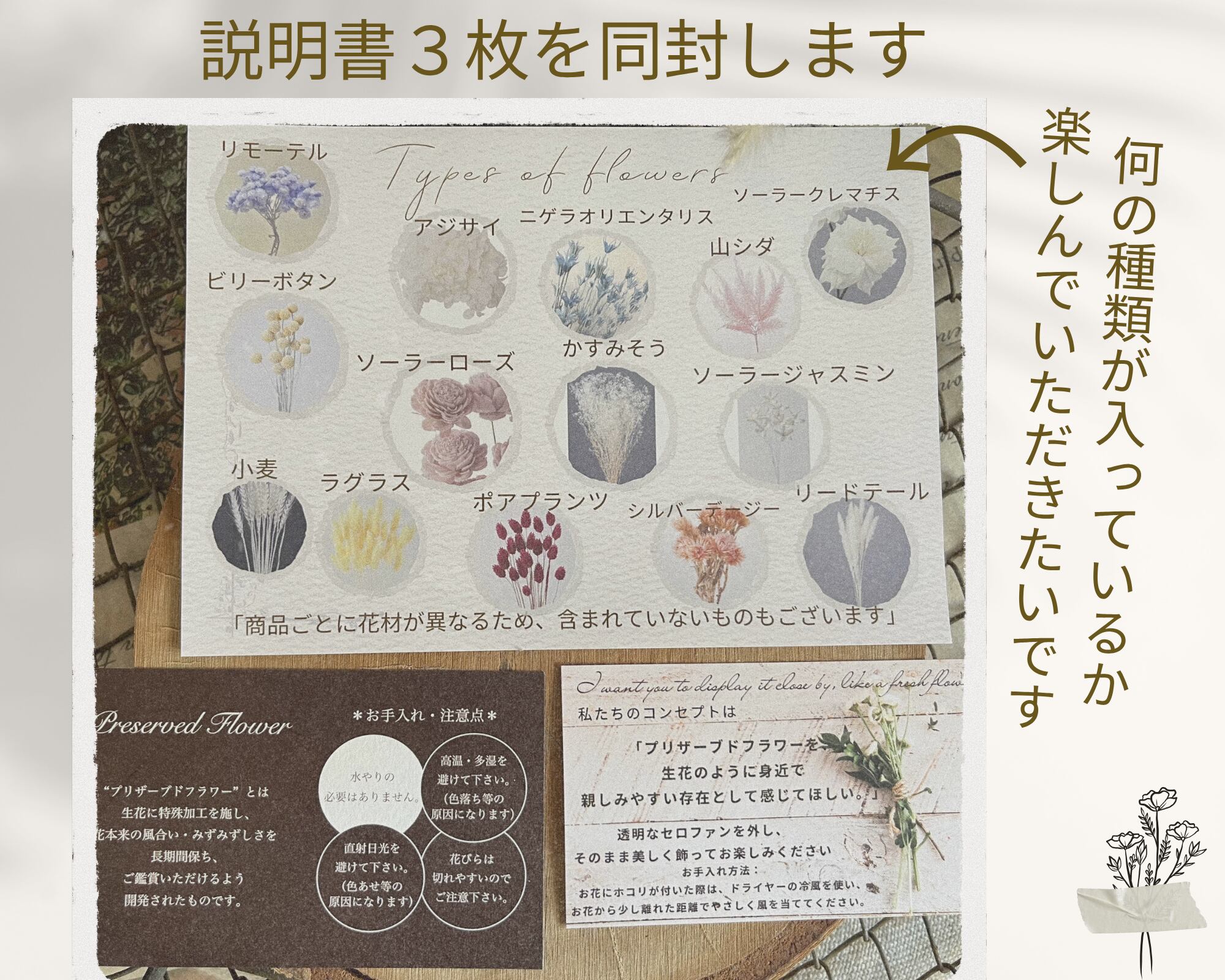 同梱物:プリザーブドフラワーの取扱説明書、主な花材説明書付き